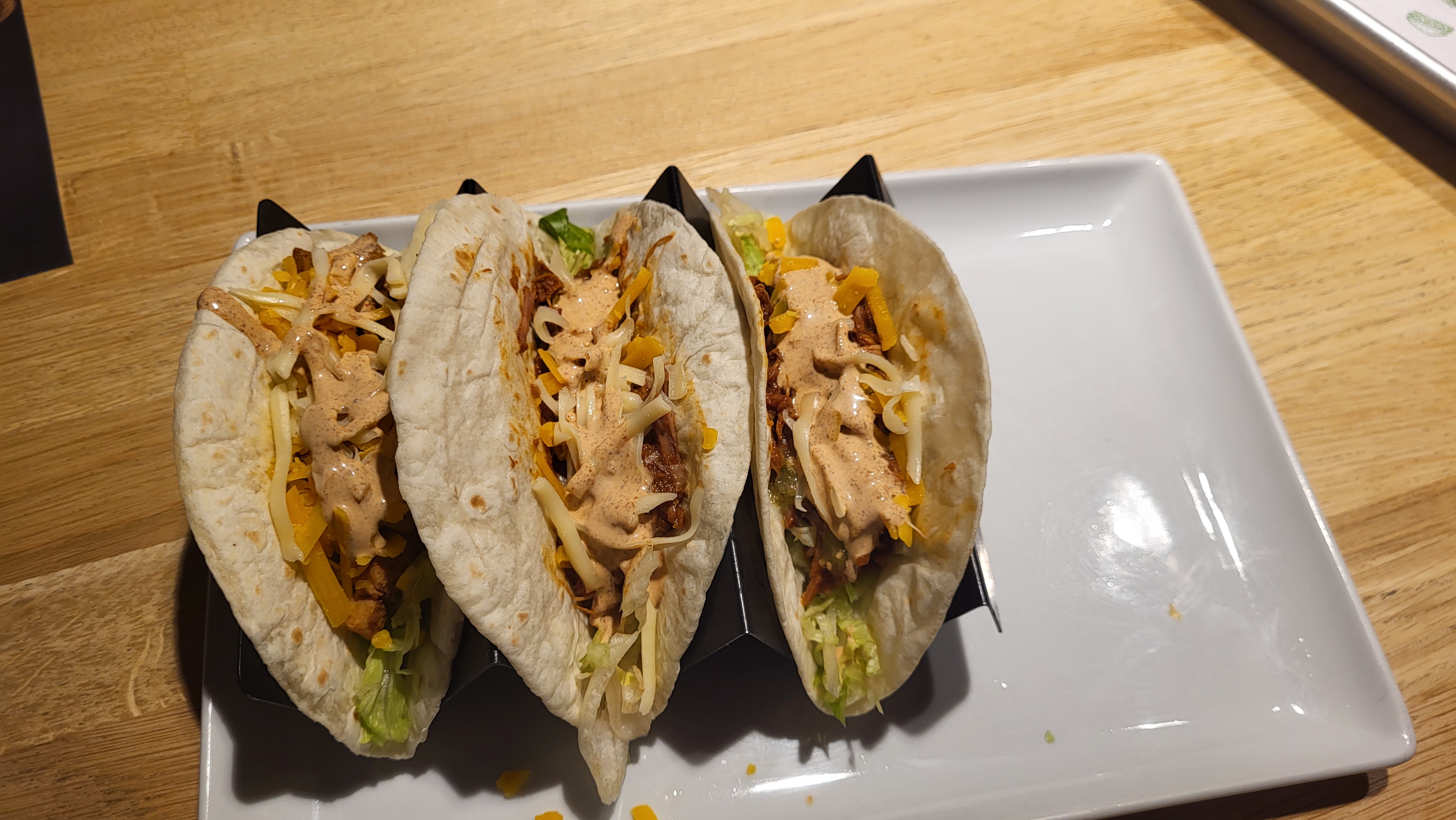 Personnel agréable et accueillant. 1ere fois que je venais chez Nachos : 3 tacos au poulet paprika maïs tomates gruyère râpés salade et sauce + oasis + fromage blanc coulis de fruits rouges (14.50€). Super bon, bien garnis ! Rien à dire !