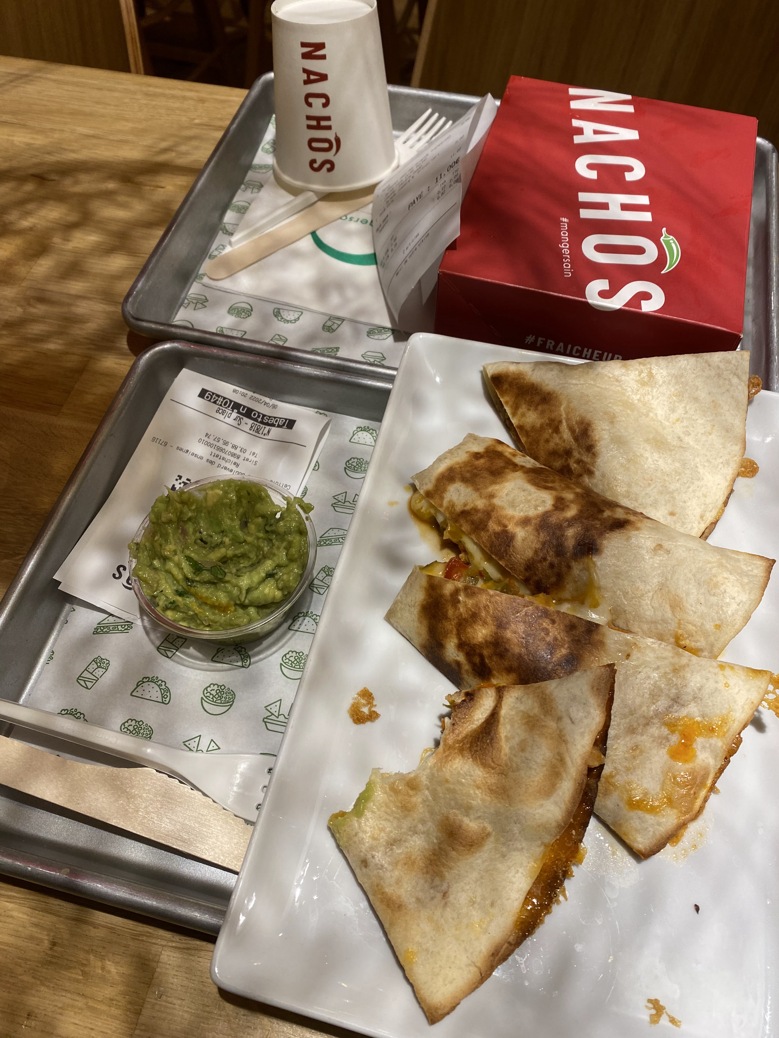 Belle découverte ! Après être passé plusieurs fois devant Nachos, nous nous sommes enfin décidés à pousser les portes pour y découvrir cette deliceuse cuisine mexicaine pleine de saveur. Notre choix s'est porté sur les Quesadillas et quelle bonne surprise gustative 😋 Le rapport qualité/prix est plus que correct et le personnel y est souriant et très sympathique. Après avoir été débarrasser notre plateau, nous avons été agréablement surpris de se faire offrir un délicieux muffin par la très souriante, serveuse au comptoir 😁 Une chose est sûre, nous y reviendrons très vite !😉 Merci à toute l'équipe !