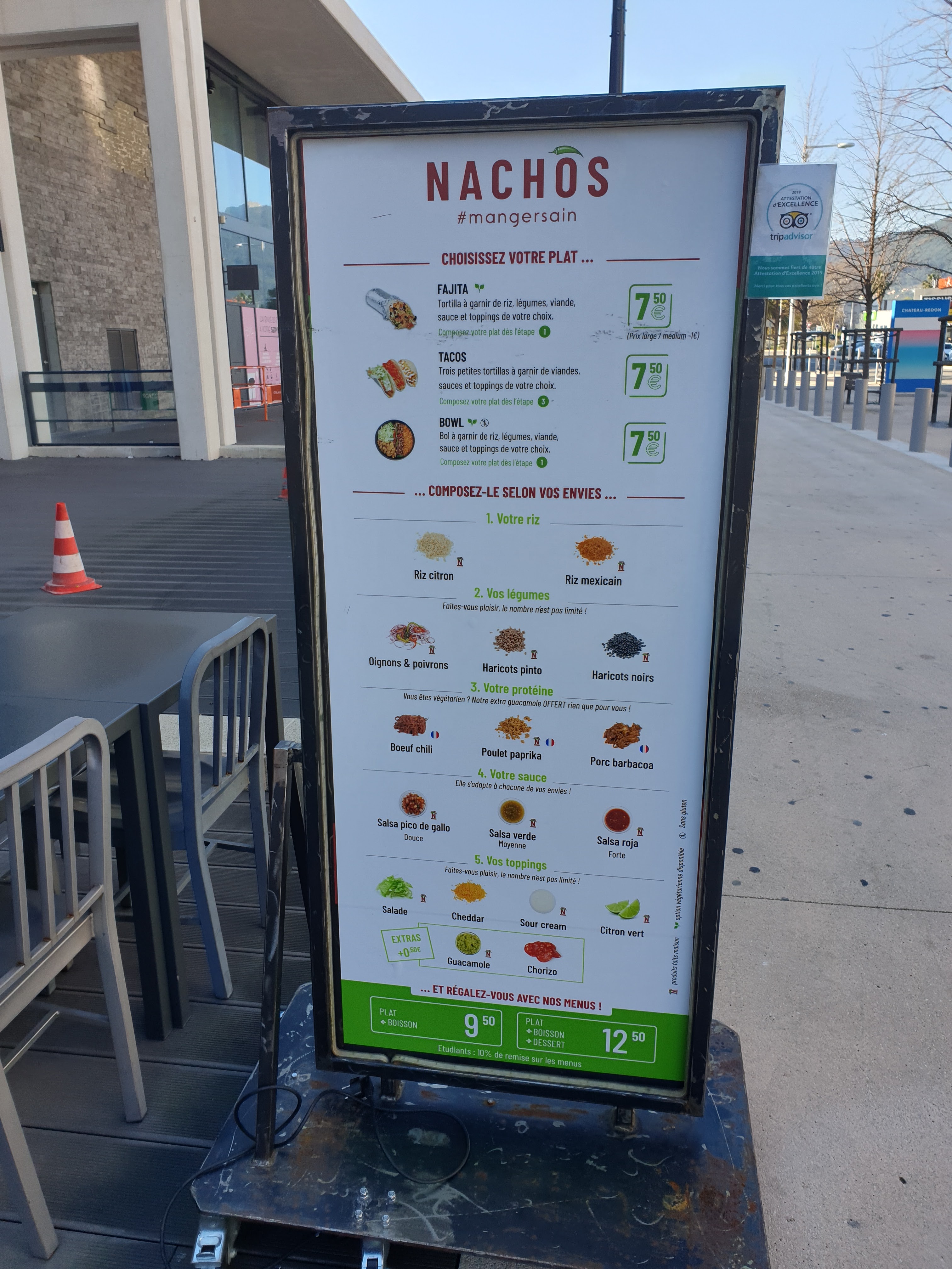 Que dire de plus que j'adore nachos depuis l'ouverture, j'y vais régulièrement seule ou en famille tjs très bien. Pour une fois qu'on peut manger sainement quelque part. En ce moment c minimum 2 fois dans le mois. Côté pratique vu que j'ai un petit appétit à chaque fois ils me font gentiment ma petite box que je me ramène à manger le soir chez moi. Et l'équipe est très agréable et c'est sympathique de voir le directeur mettre la main à la patte. En bref j'adoreeeeeee nachos