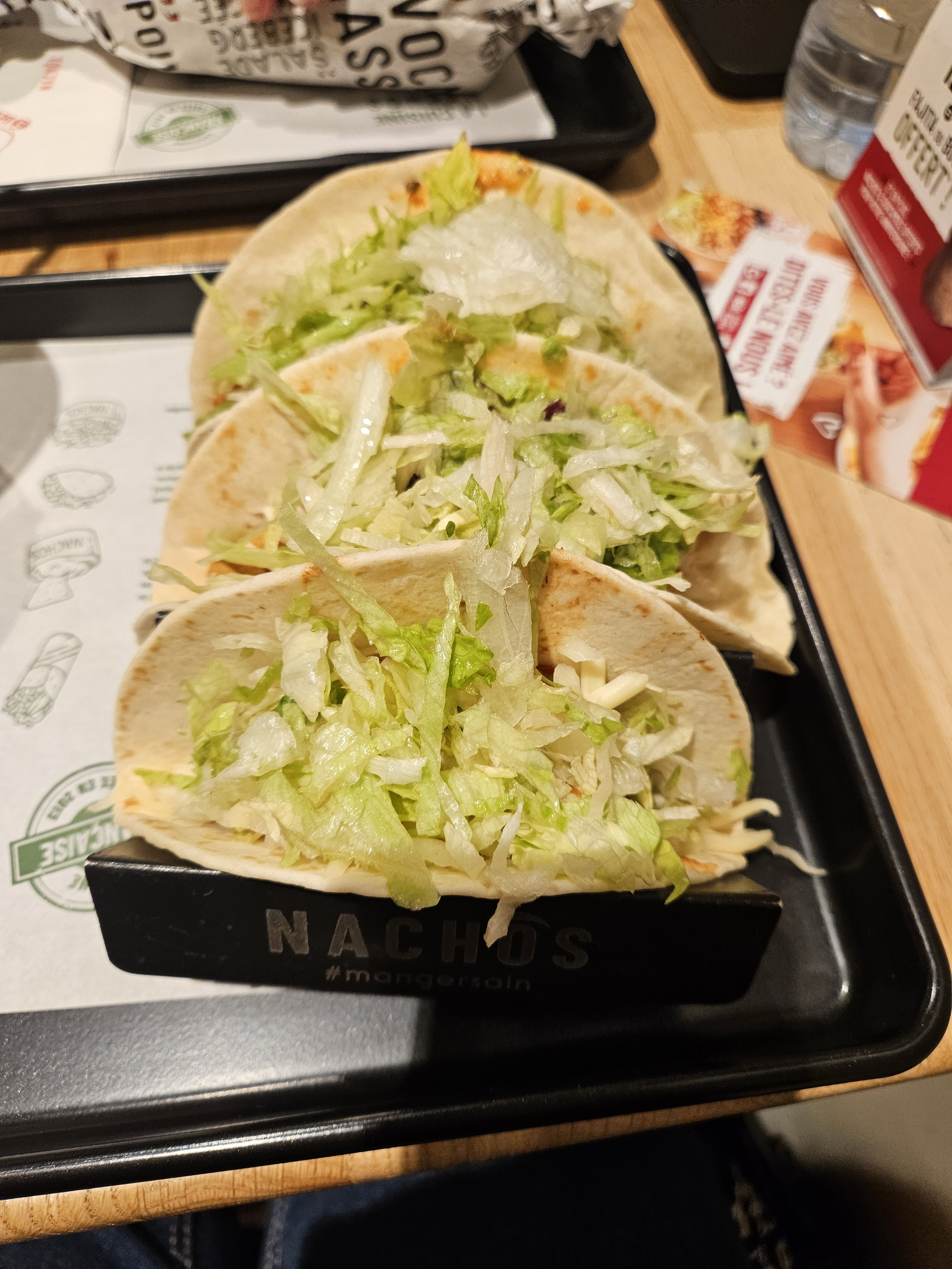 3 Tachos un a chaque viande très Bon mais L’effiloché de bœuf était particulièrement savoureux je recommande.