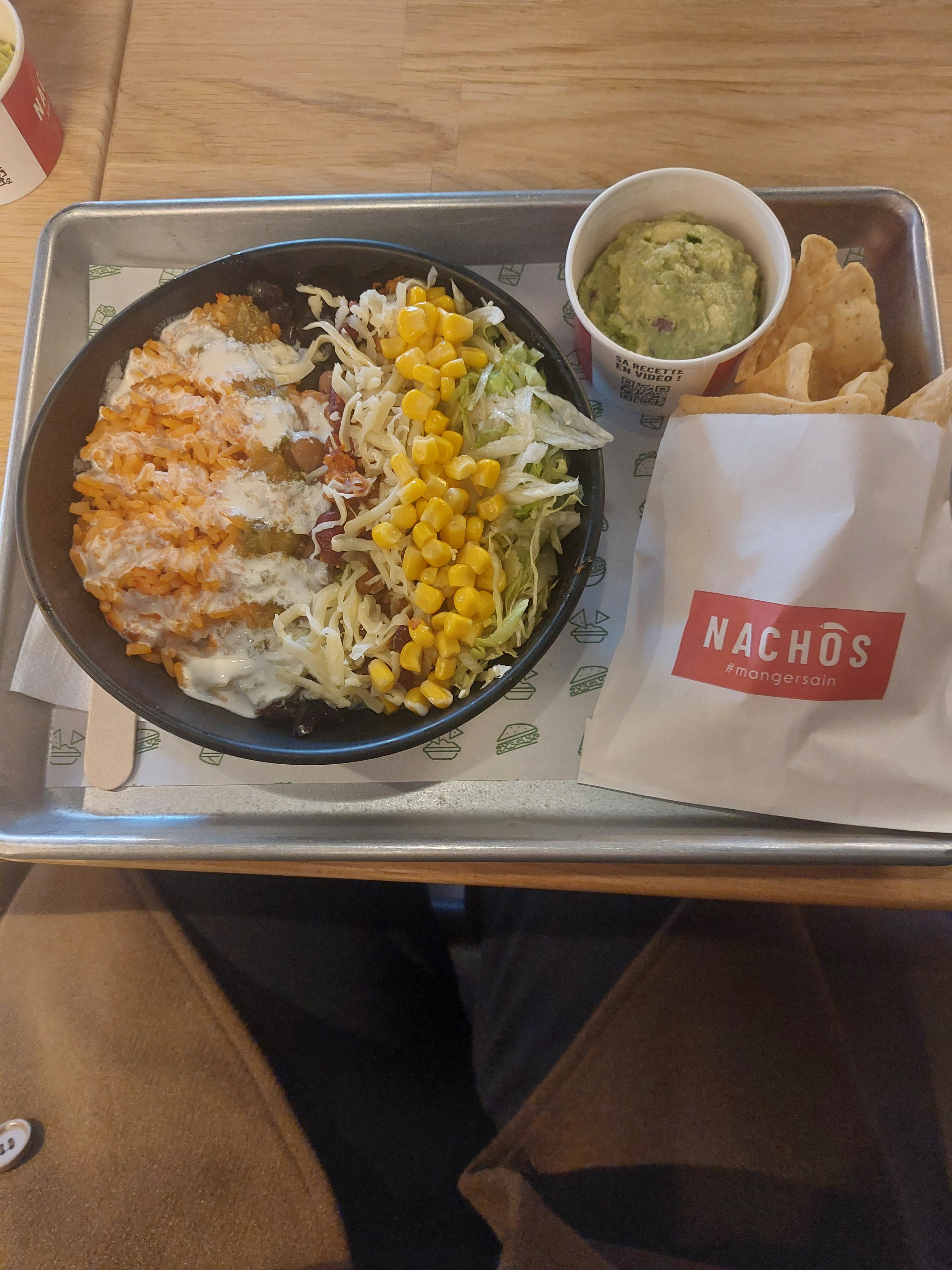 Alors nachos caen à bien changé ! Si vous avez faim passez votre chemin ! 1 demie cuillère de poulet légumes : 1 morceau de poivron et 2 petits morceaux d'oignons ! Le bowl est à peine rempli aux 2/3 et encore parce que j'ai pris un supplément guacamole !! Le vendeur très agacé par ma réflexion devant la bowling si peu rempli pendant qu'une employée se sert une bowl avec 2 viandes différentes le tout débordant de la bowl... bref cliente depuis le 1er jour je ne suis pas prête à y remettre les pieds ! Passez votre chemin et allez vous nourrir ailleurs ça ne pourra pas être pire