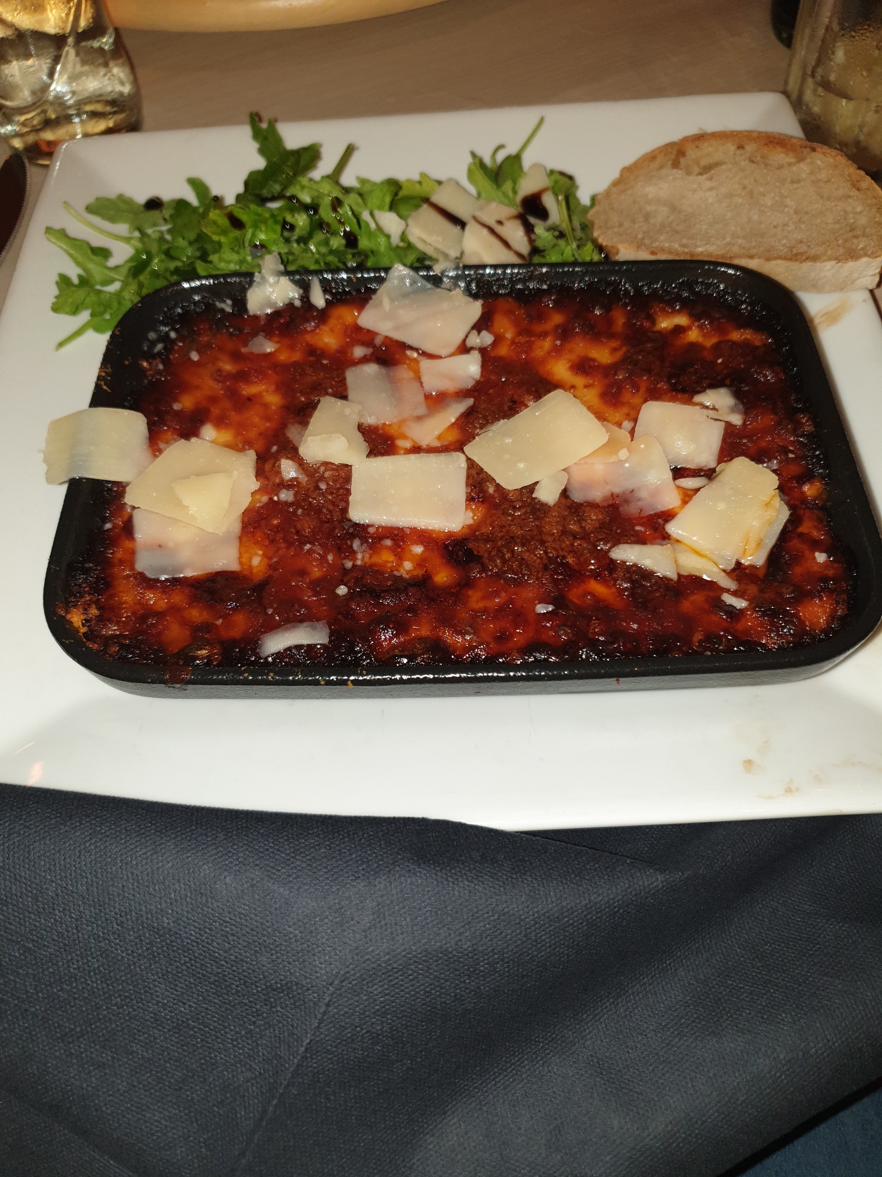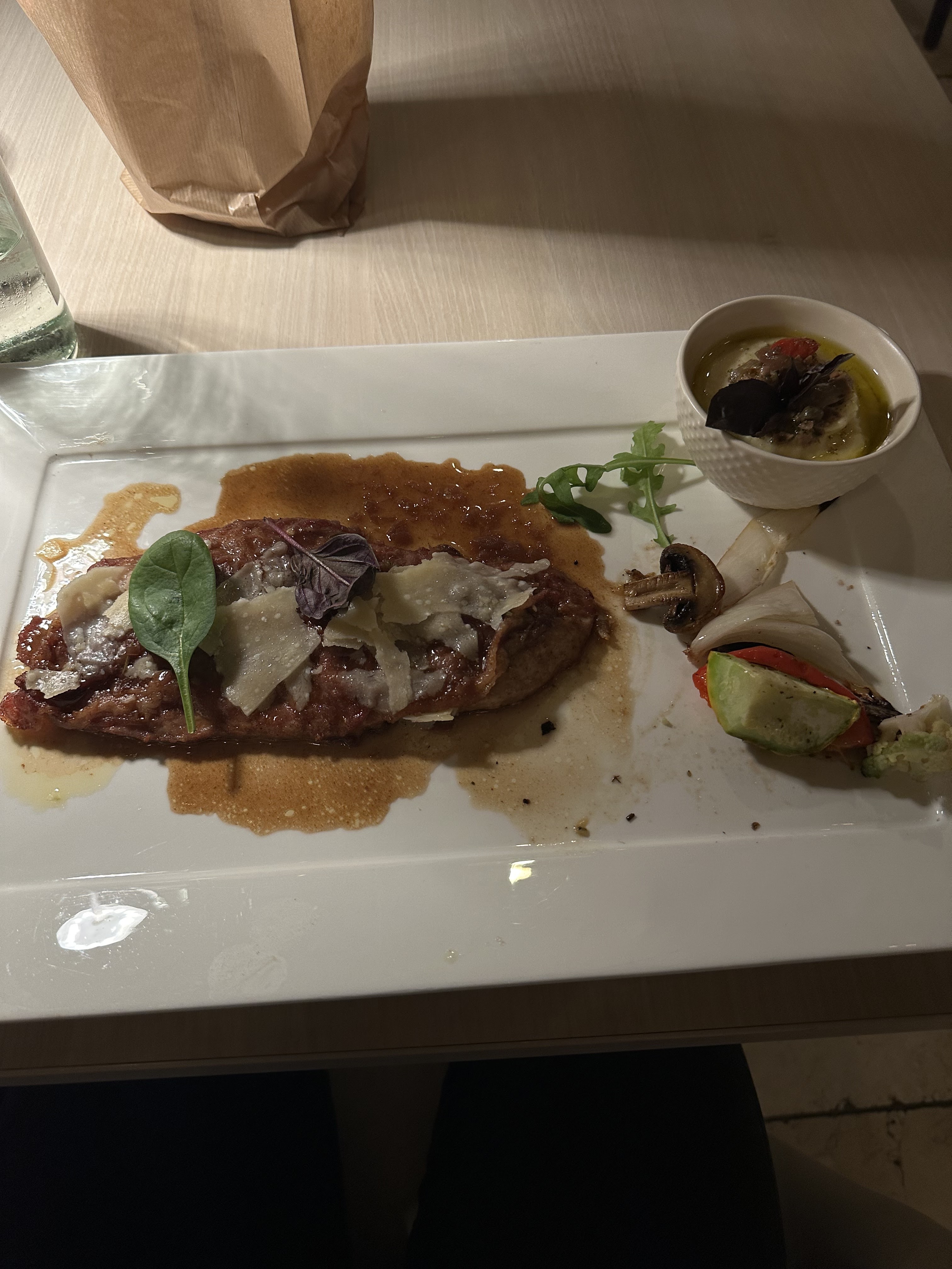 Veau très dur pour la première fois. Deuxième chance, nous avons eu 4 antipasti. Deux étaient ok. Deux étaient épouvantables car de l’huile rance était utilisée. Je n’y suis parvenu que plus tard. Ils ont vraiment besoin de jouer là-haut.