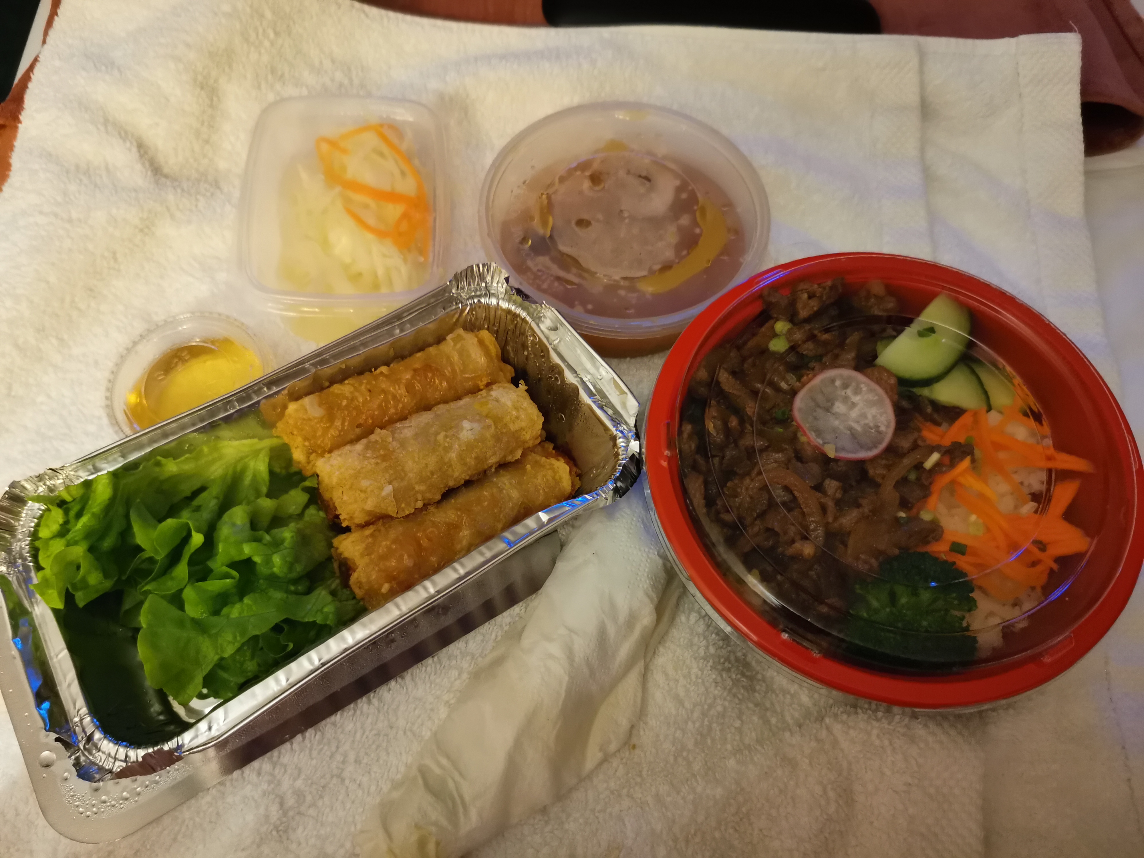 Plat commandé sur place et retrait à emporter, bon rapport qualité prix pour menu avec 4 nems, riz boeuf sauté et soupe (16€50). Tout était très bon, il y en avait finalement trop. Bon accueil et retrait très rapide.