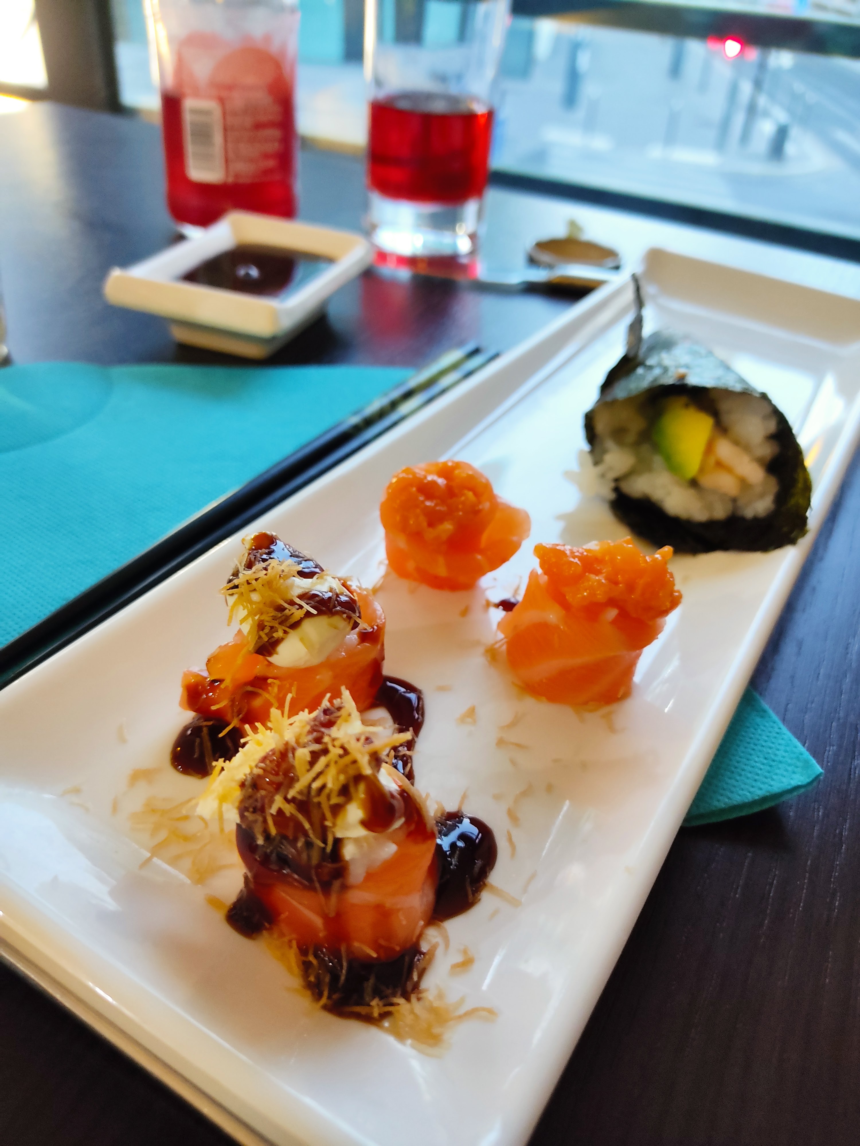 L arrivée est assez déroutante. Le lieux ressemble plus a un couloir qu a un restaurant. La terrasse, au bord de l avenue manque totalement d intérêt, par contre la salle a l étage est plutôt agréable. La commande se fait a l aide de votre smartphone (tres destabilisant pour les vieux comme moi qui ne sont pas nés avec). Concernant la nourriture, les brochettes boeuf fromage sont a éviter, on trouve nettement mieux ailleurs. Les uramakis, blak uras et les sushis, par contre, sont très bons, le poulet teriyaki tout a fait correct. Au final, une experience agreable, pour un prix pkus que convenable (formule a volonté pour 25 euros).