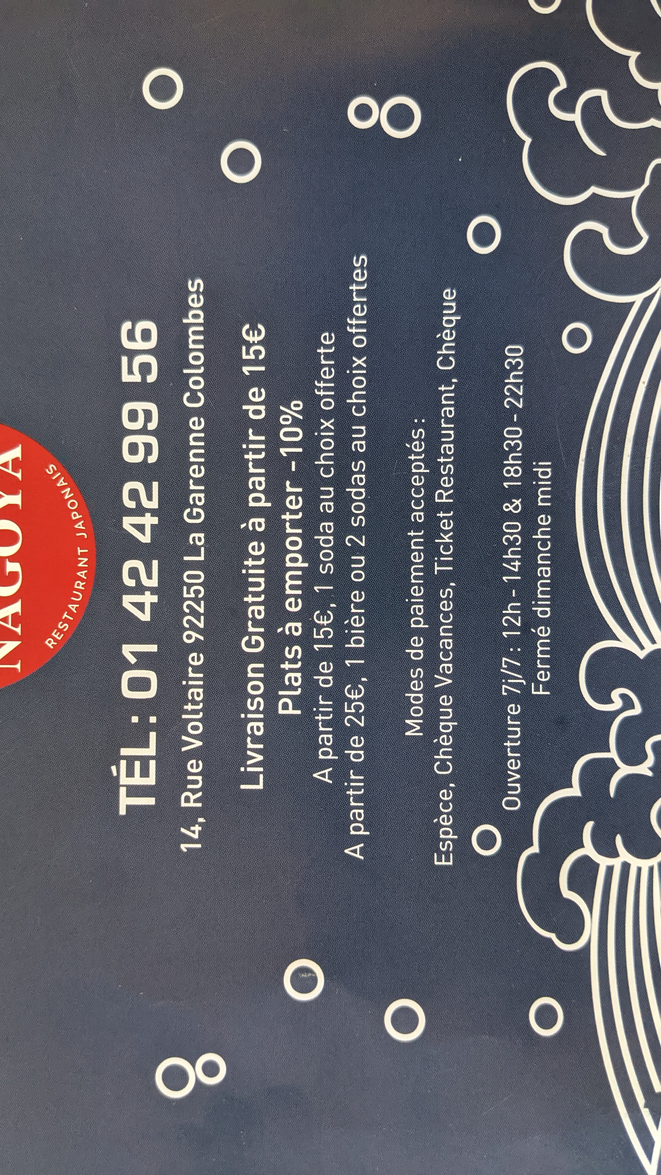 Voici toutes les informations sur le Restaurant japonais Nagoya qui ce trouve au 14 Rue Voltaire, 92250 La Garenne-Colombes (92). Sur cette fiche vous trouverez les photos, l'adresse, les horaires d'ouverture, le numero de téléphone et les avis clients.Vous pouvez églement rédiger un avis si vous le souhaitez en bas de page.