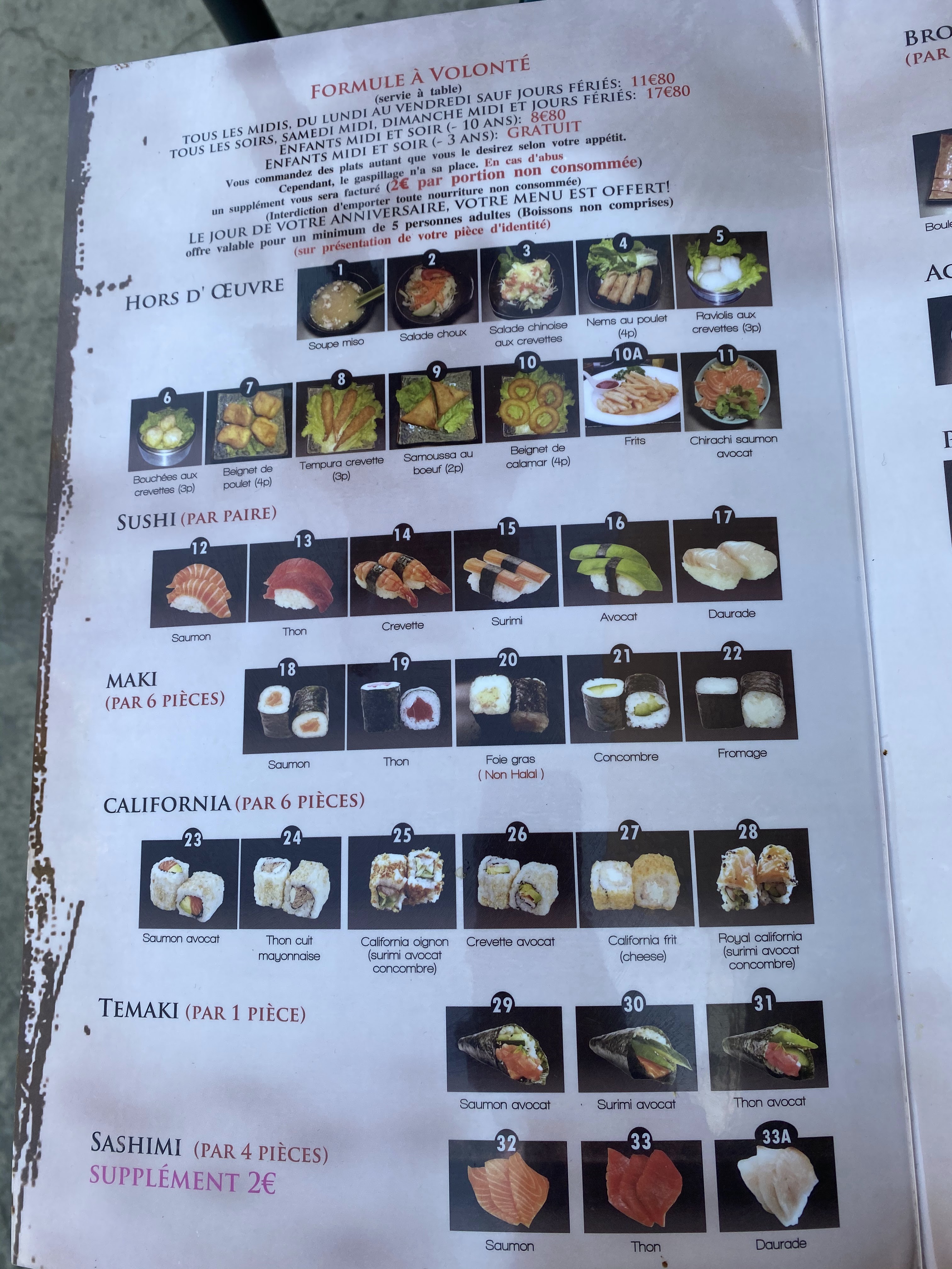 On m’avait conseillé ce buffet japonais à volonté sur commande, résultat les produits sont vraiment bon. La formule tout les soirs et le week-end est à 17,80€ et 11,80€ le midi en semaine. Nous avons été installés sur des tables en plastique ainsi que des chaises de mauvaises qualités ce qui n’est pas du tout confortable pour deux. Cependant des belles tables en bois sont disponibles en majorité pour les groupes de 4 et plus. La terrasse extérieur peut accueillir une vingtaine de personne et la terrasse couverte pareille. L’intérieur du restaurant est grand de ce que j’ai aperçu. Nous avons dû payer dès le début avant même d’avoir goûté un plat .. le personnel est vraiment pas aimable c’est dommage. Pour commander il faut écrire sur un papier le numéro de notre plat et la quantité (26 x 1 par exemple). Leurs vin blanc (nom aucune idée) est bon. Il dispose d’un petit parking de 6 places qui peut aller jusqu’à 8 ou 10 si des gens rentrent sans laisser la possibilité de pouvoir sortir. Malgré ces points négatifs j’insiste vraiment sur la qualité des produits et la rapidité du service qui sont quand même les éléments primordiaux. Je n’ai pas goûté au dessert. Pour finir je vous conseille d’y aller à plusieurs vous aurez l’assurance d’être servi très rapidement et de bien mangé. Le jour de votre anniversaire le menu volonté est gratuit si vous venez à 5 (voir détails sur le menu ci dessous).