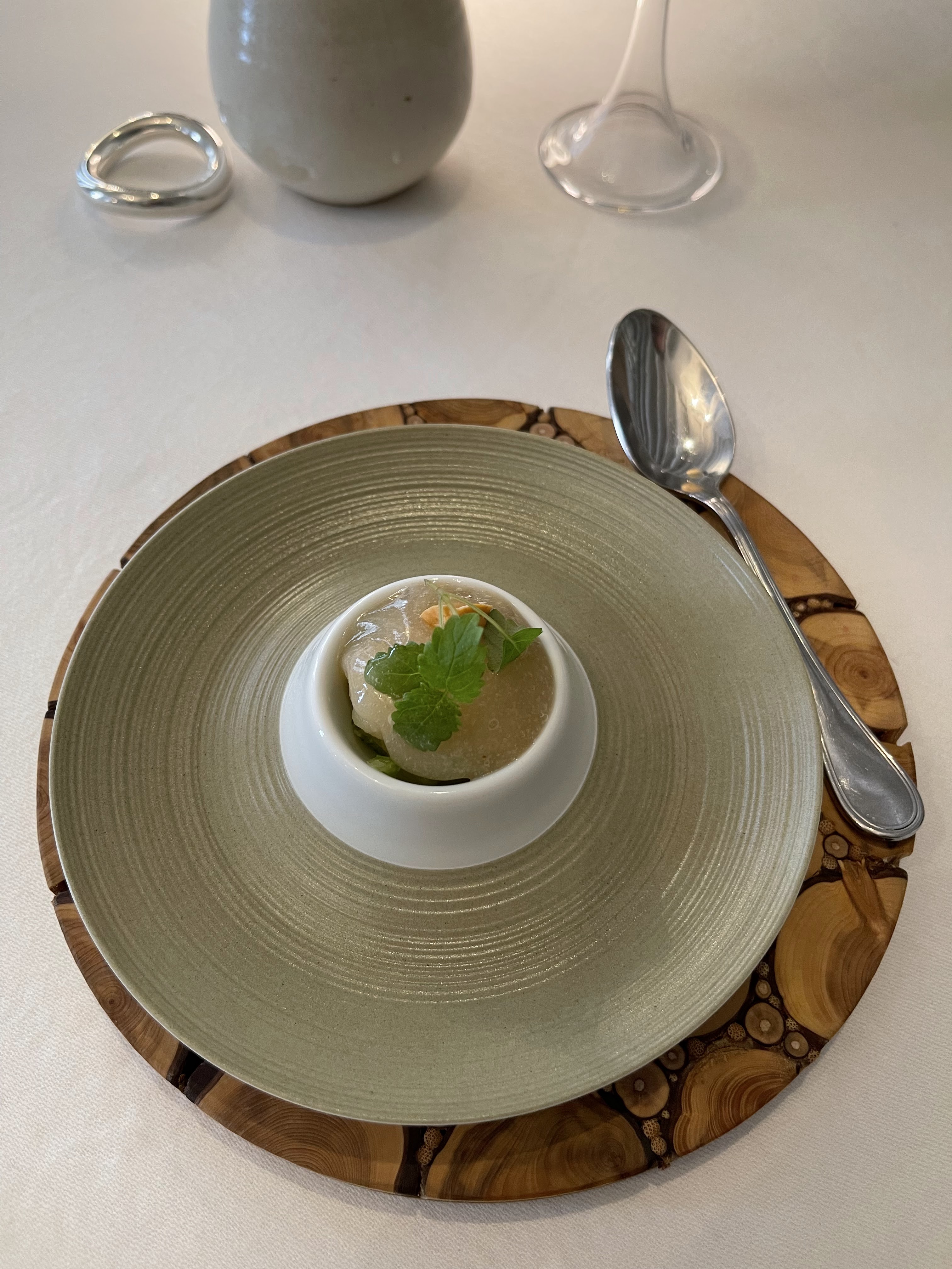 Une soirée mémorable, pleine de découvertes savoureuses. Nous avons été charmé dès l'entrée discrète dans le restaurant : façade blanche éclairée d'un lampadaire, une plaque indiquant le nom du restaurant. Puis la porte poussée, nous découvrons le chef à l'oeuvre avant d'être admis dans la salle, sobre et charmante avec quelques tables garantissant un dîner romantique. Le service est aussi discret qu'attentioné. Le service en 6 plats est à l'image de l'ambiance environnante, précision des assiettes, justesse des goûts. Merci au chef et à toute l'équipe pour ce beau voyage.