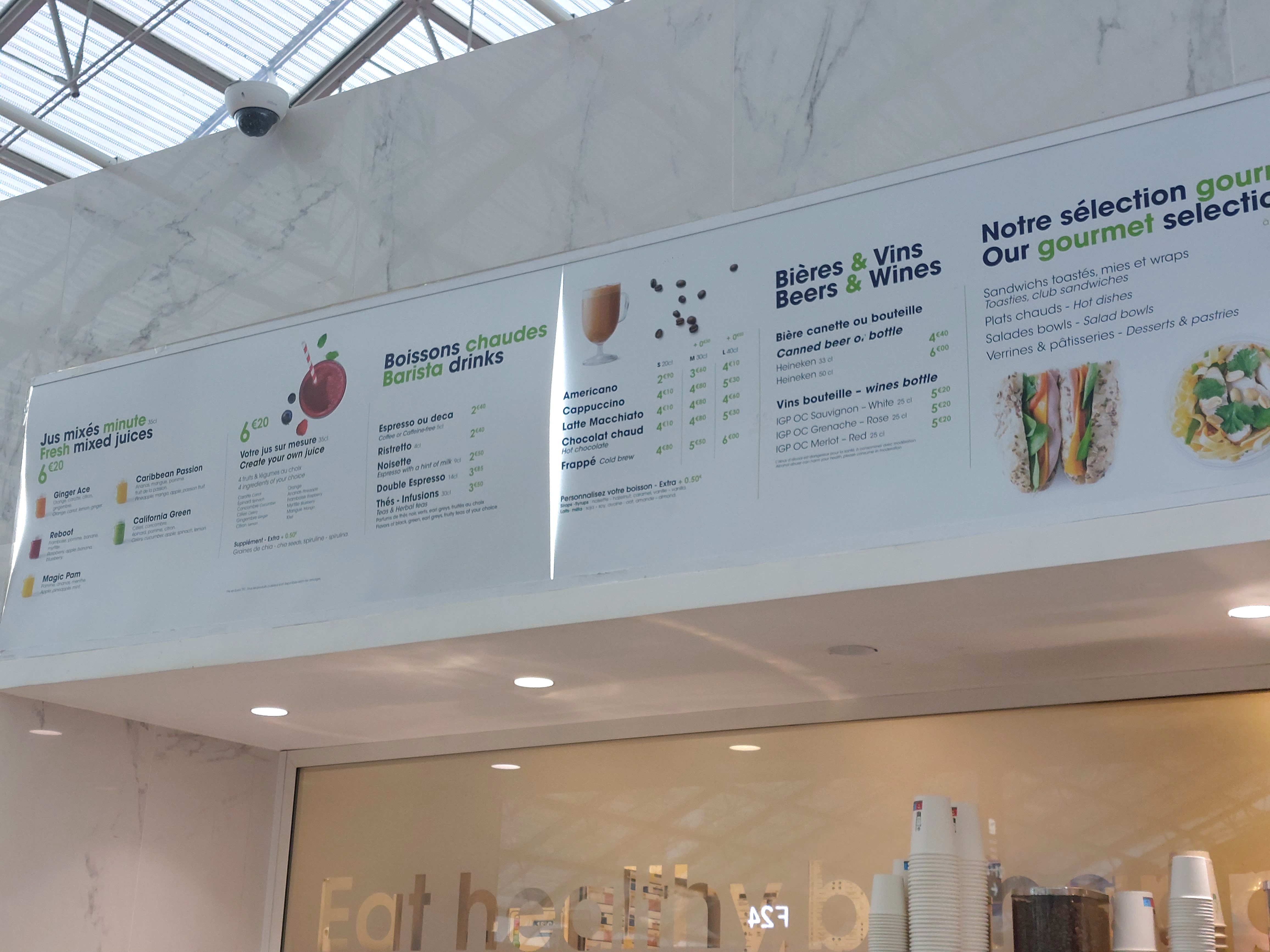 La bière était froide et le café était fort et chaud. Le muffin au chocolat était tout à fait correct. Les prix sont aux niveaux normaux des aéroports. Plutôt au niveau inférieur pour Paris.