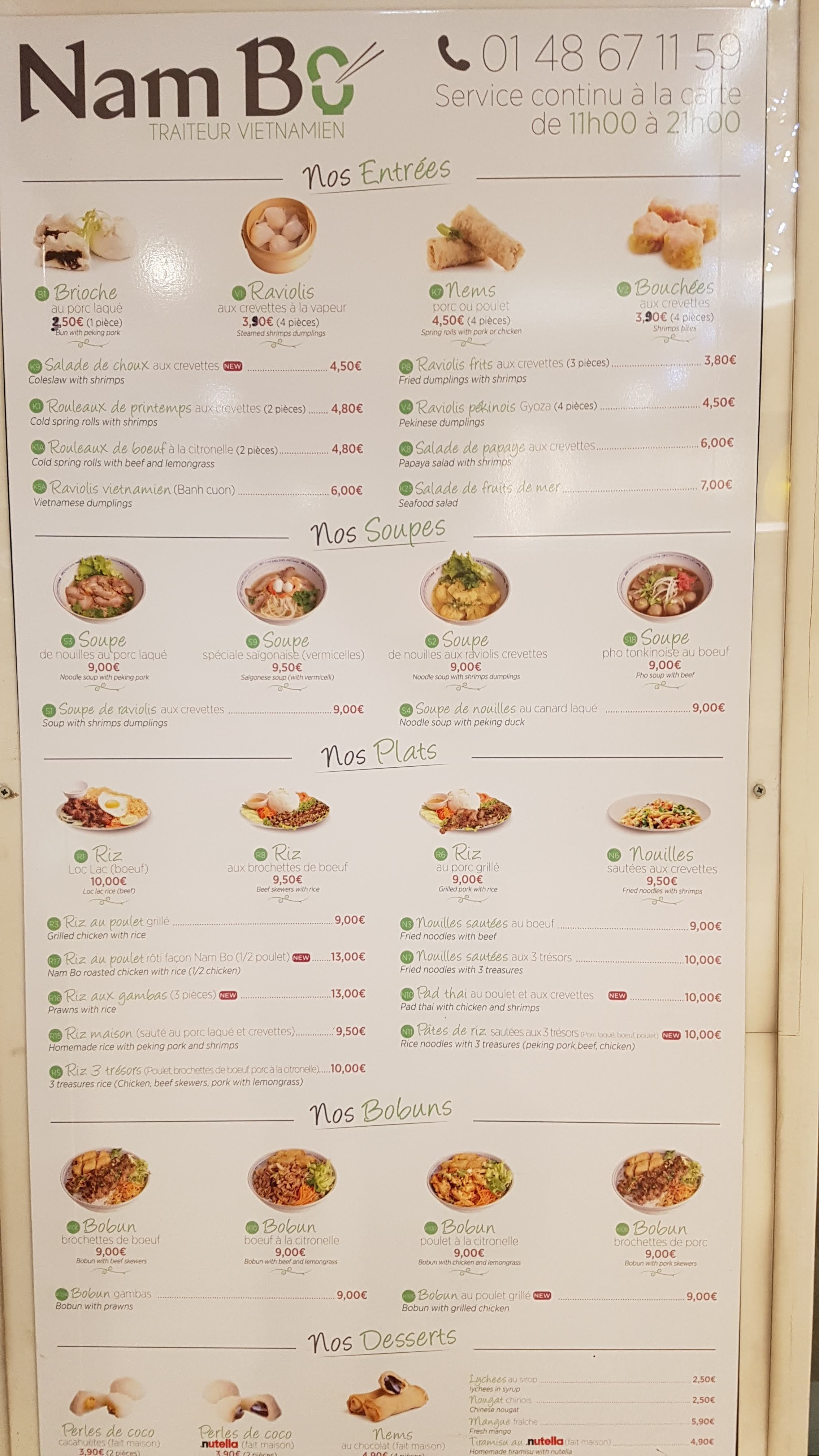 Aujourd’hui c’est chez Nam Bo que je vais déjeuner la carte me paraît pas mal allons voir ! Je m’installe et la première chose qui me vient à l’esprit c’est le bruit, c’est très bruyant mais bon c’est pas ce qui fait les plats. En parlant de plat je vais prendre en entrée des raviolis aux crevettes servi par 4 puis des bouchées aux crevettes et en plat je choisis un Riz aux trois trésors, verdict : Les raviolis aux crevettes : Ils sont bon rien de plus Les bouchées aux crevettes: J’ai eu une très bonne impression la première fois que je suis venu ils étaient succulents la seconde fois ils étaient bon mais rien de plus. Le riz aux trois trésors : Riz nature servi avec trois viande, une brochette de bœuf aux soja, une de poulet et un morceau de porc à la citronnelle. Je dois avouer que je me suis régalé! Les saveurs sont au rendez-vous les viandes sont succulentes. Je suis revenu manger un Riz bœuf Loc lac plus tard autant que la viande était très bonne mais le Riz à la tomate au beurre 😳 n’a rien d’asiatiques et c’est dommage. Note : 3/5 j’ai eu une très bonne impression la première fois mais quand je suis revenu j’ai été moins convaincu. Je reviendrais goûter les autres plats et en tout cas rapport qualité prix c’est un bon endroit pour se restaurer. Bon appétit ®️
