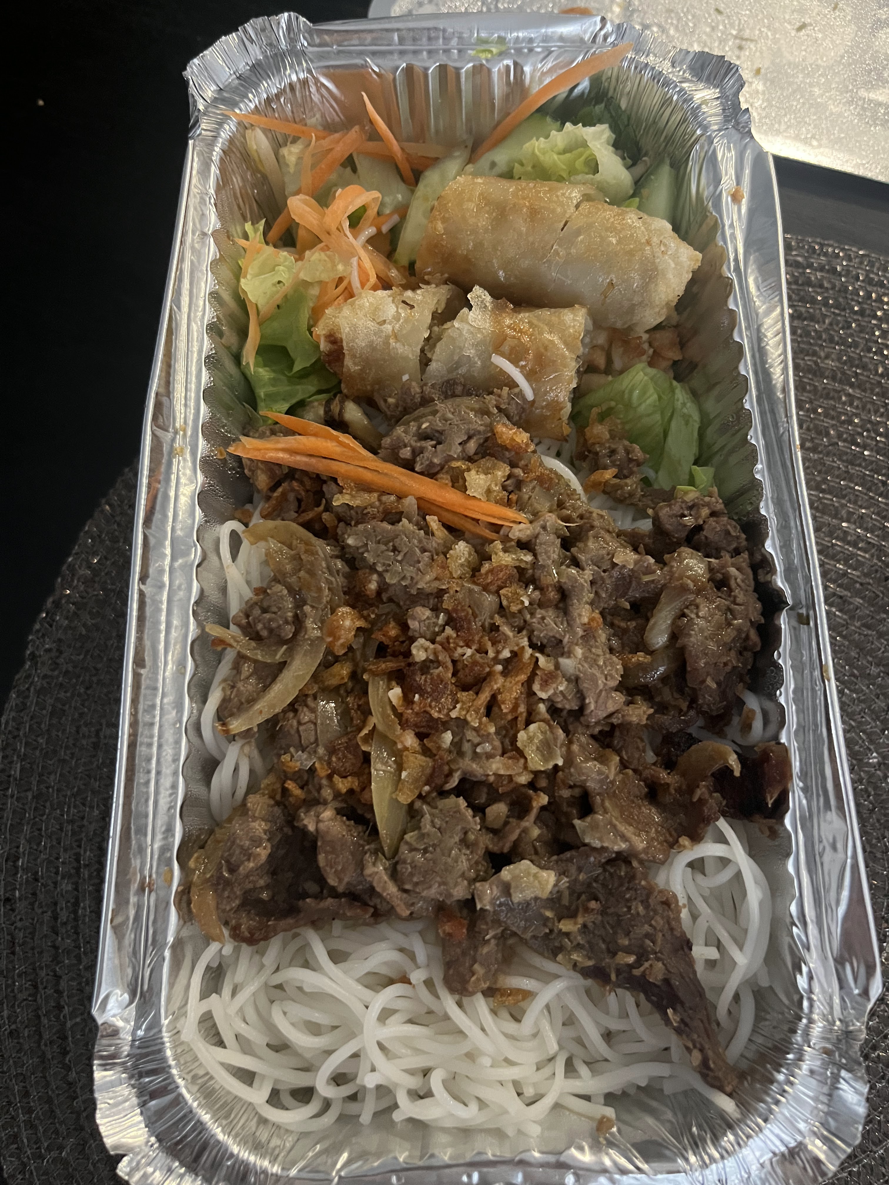 J ai pris un bo bun et luc lac a emporter,impressionnée par la quantité du bo bun à emporter! les deux plats étaient excellents, j ai attendu 15 bonnes minutes apres la commande du plat,donc les plats n'était pas juste mis a chauffer mais il y a eu des preparations,les salades étaient fraiches,la viande delicieuse J y retournerai avec plaisir