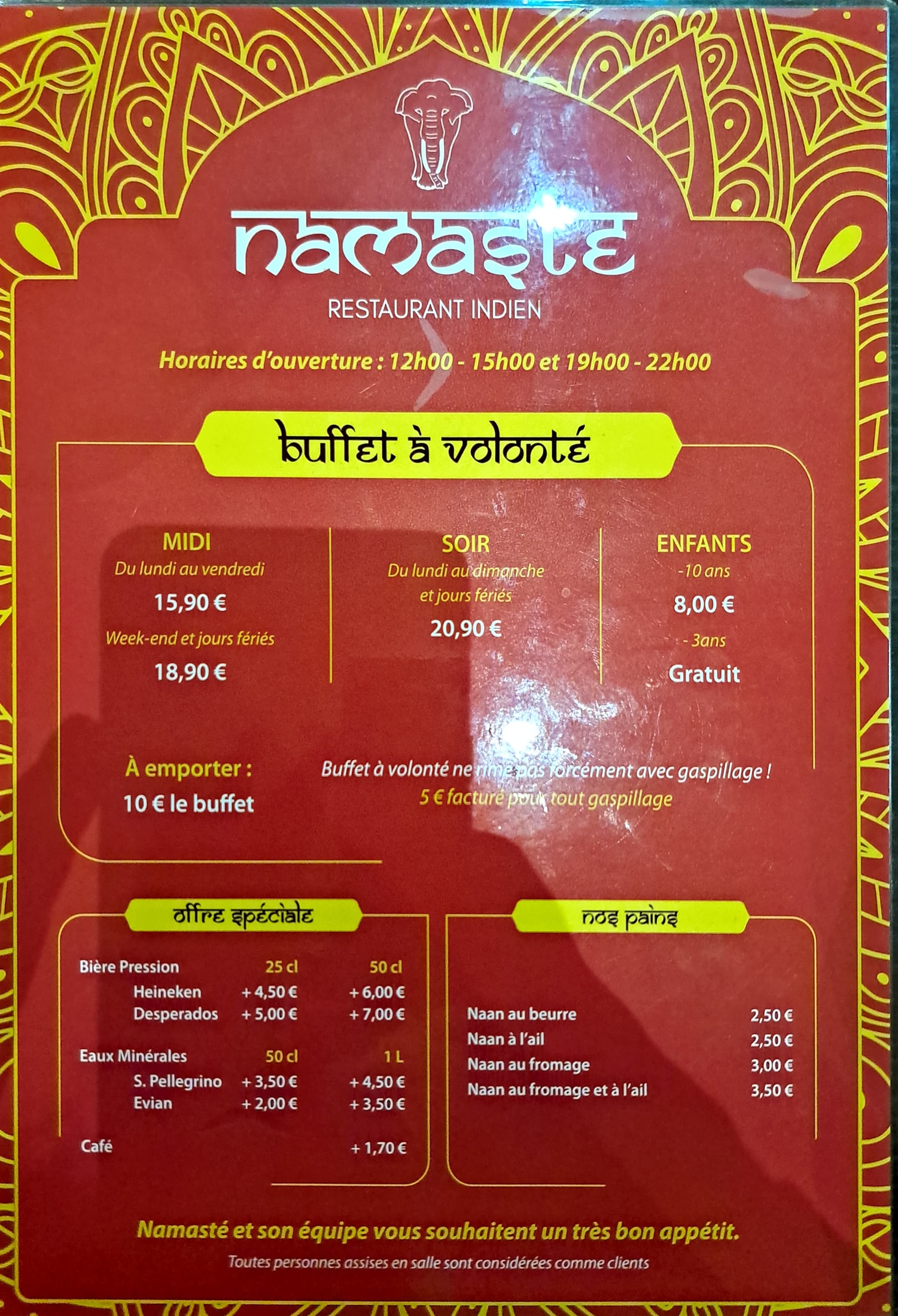 Nous avons mangé hier soir au namasté. Très bien reçues. C'était très bon. Buffet propre intérieur très agréable. Nous y reviendrons avec plaisir 😊.
