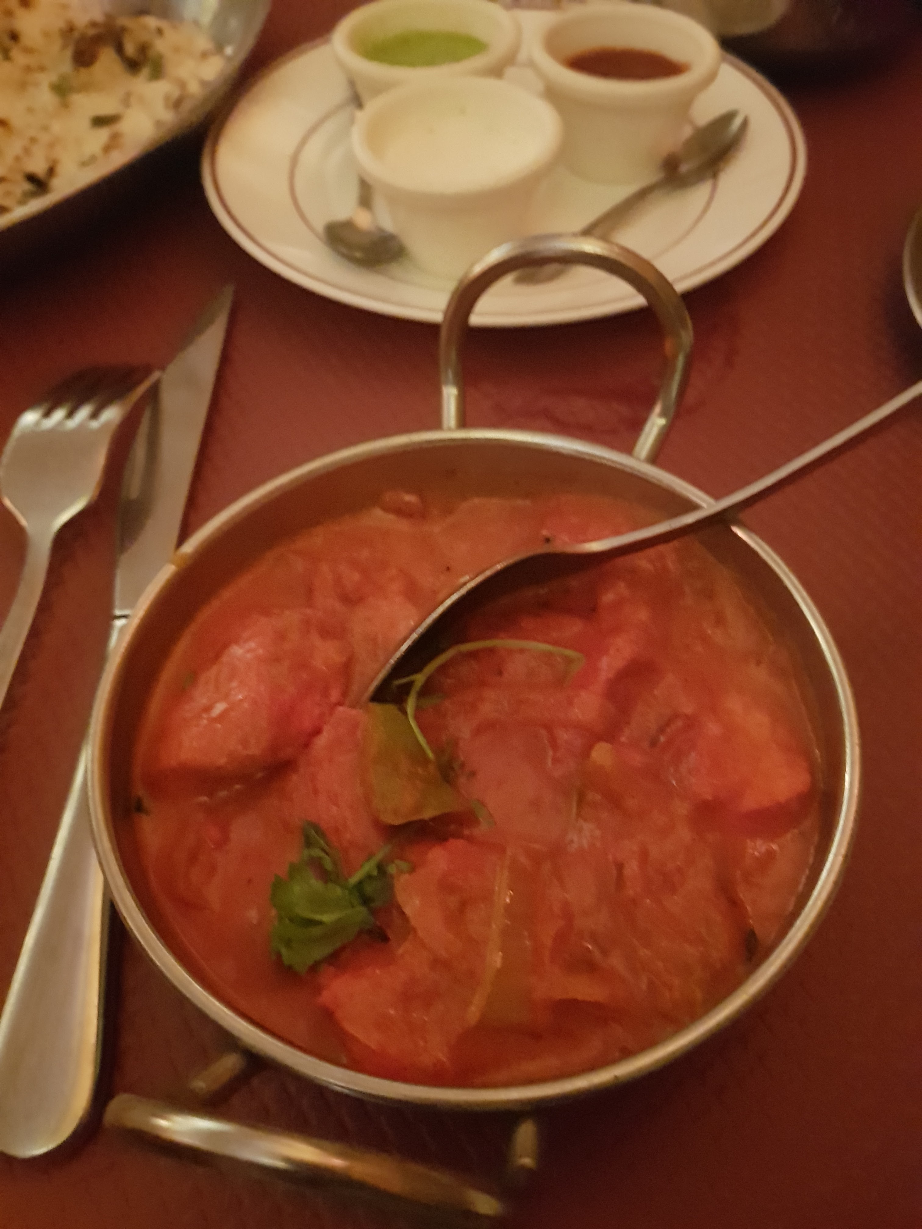 Nous avons donc eu envie d'un curry indien en France et nous sommes tombés sur ce petit restaurant pittoresque. Seulement deux tables pour s'asseoir à l'extérieur mais bien plus à l'intérieur avec une jolie décoration. Le service était un peu détendu mais cela ressemblait à un restaurant familial et une seule dame était à la réception. Malheureusement, ils n'avaient pas de poppadums à cause de covid - 19 (ils ont dit) mais nous avons commandé 2 plats principaux - poulet tikka masala et poulet chili. Les deux étaient accompagnés de riz et étaient délicieux et riches, les épices n'étaient ni trop ni trop peu mais juste ce qu'il fallait ! Nous avons également commandé un yaourt raiti (incroyable) et un masala nan (incroyable). Dans l'ensemble, c'est une super expérience ici pour des prix raisonnables ! Peut-être que le lassi à la mangue aurait pu être un peu plus gros...