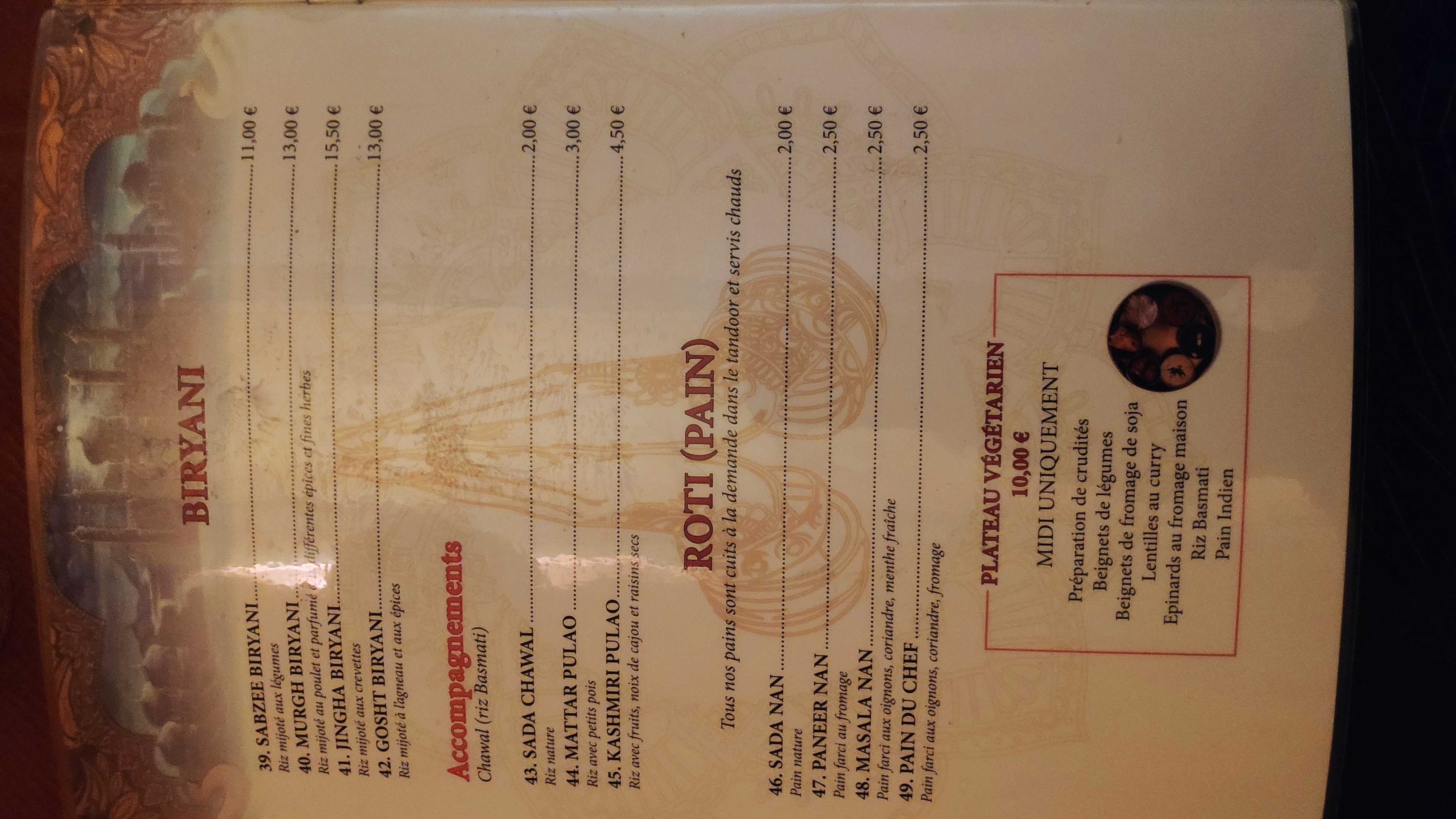 Une première dans un restaurant indien. Bon mais les plats pourraient être améliorés. L'entrée à 9,50 est chère par rapport à la quantité servie. Le plat principal:Des crevettes au riz avec des raisins et des noix de Cajou. Des toutes petites crevettes avec une sauce sans trop de goût. Vous pourriez y apporter tellement de saveur à la sauce. Le dessert à base d'une glace spécialité indienne n'était vraiment pas bon. Un coulis avec et de la chantilly en bombe.7'50€ pour cela.Ca ne les vaut pas du tout. Le thé était très très bon. Je pense que vous devriez adapter votre carte pour les végétariens car beaucoup de plats notamment dans les entrées avec de la viande mais il n'est pas possible de faire des modifications dans les assortiments que vous proposez. Je trouve cela dommage..... La dame qui nous a servis était très très gentille.