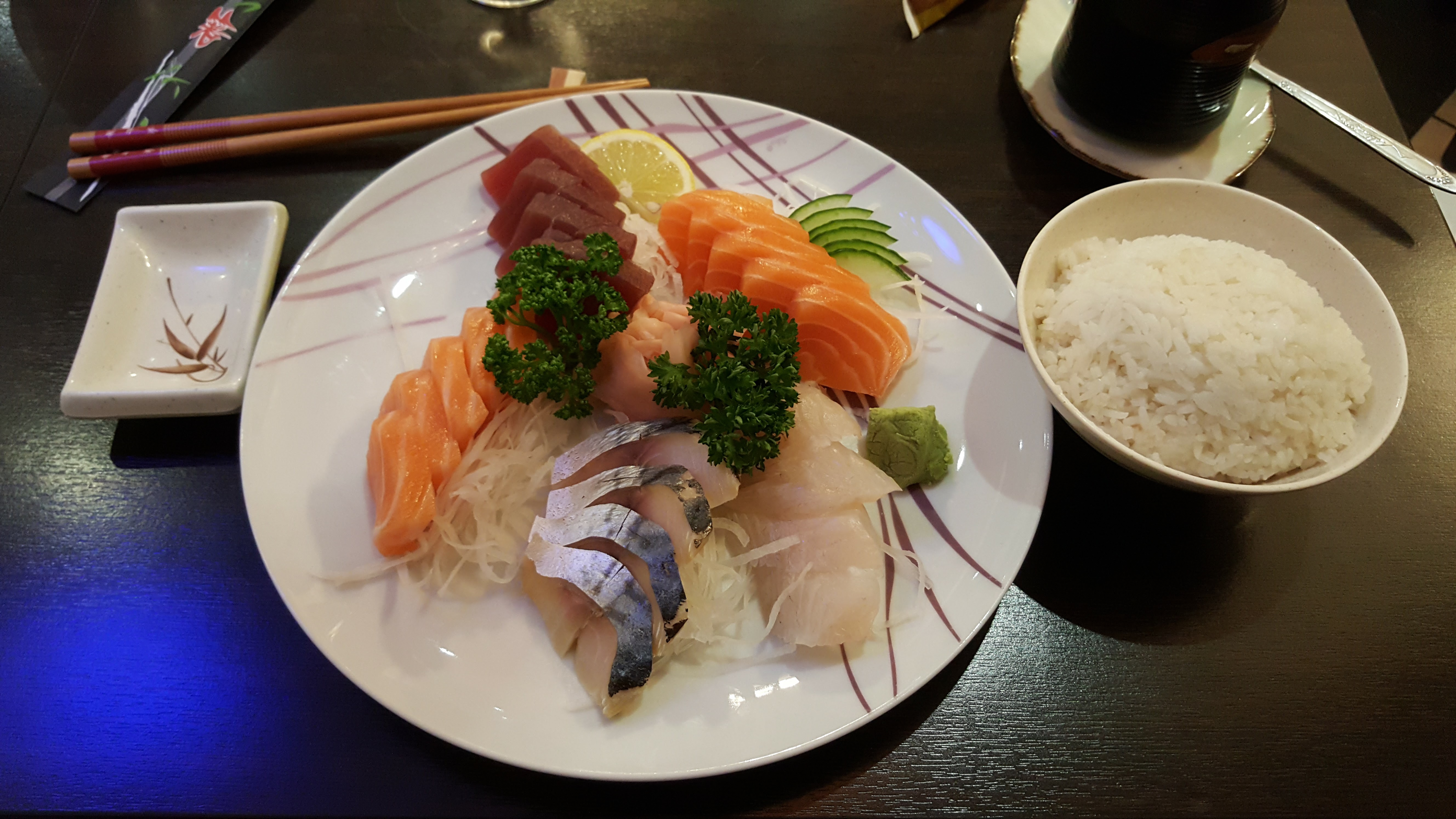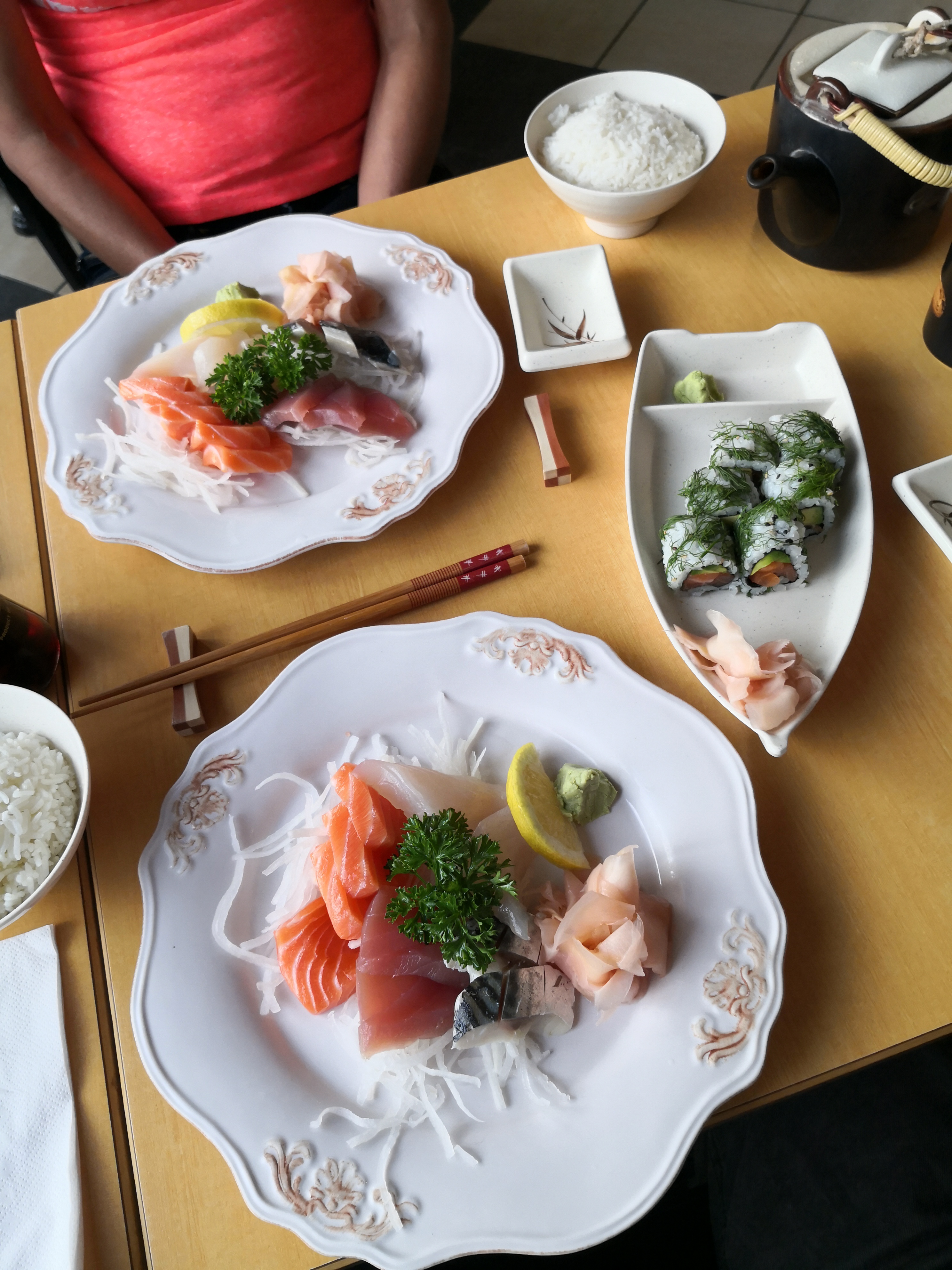 Peu de produit dans l'assiette comparé au prix. Les baguettes sont jolies mais en mauvais état (beaucoup usées). Petit plus pour le thé que l'on peut commander en théière.