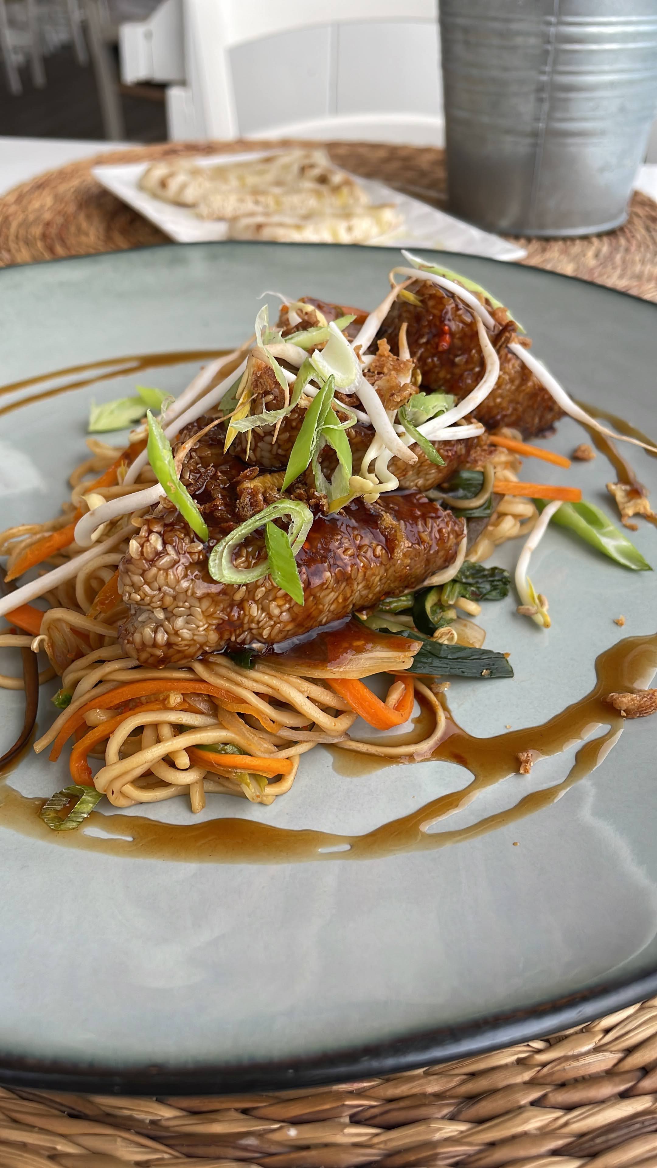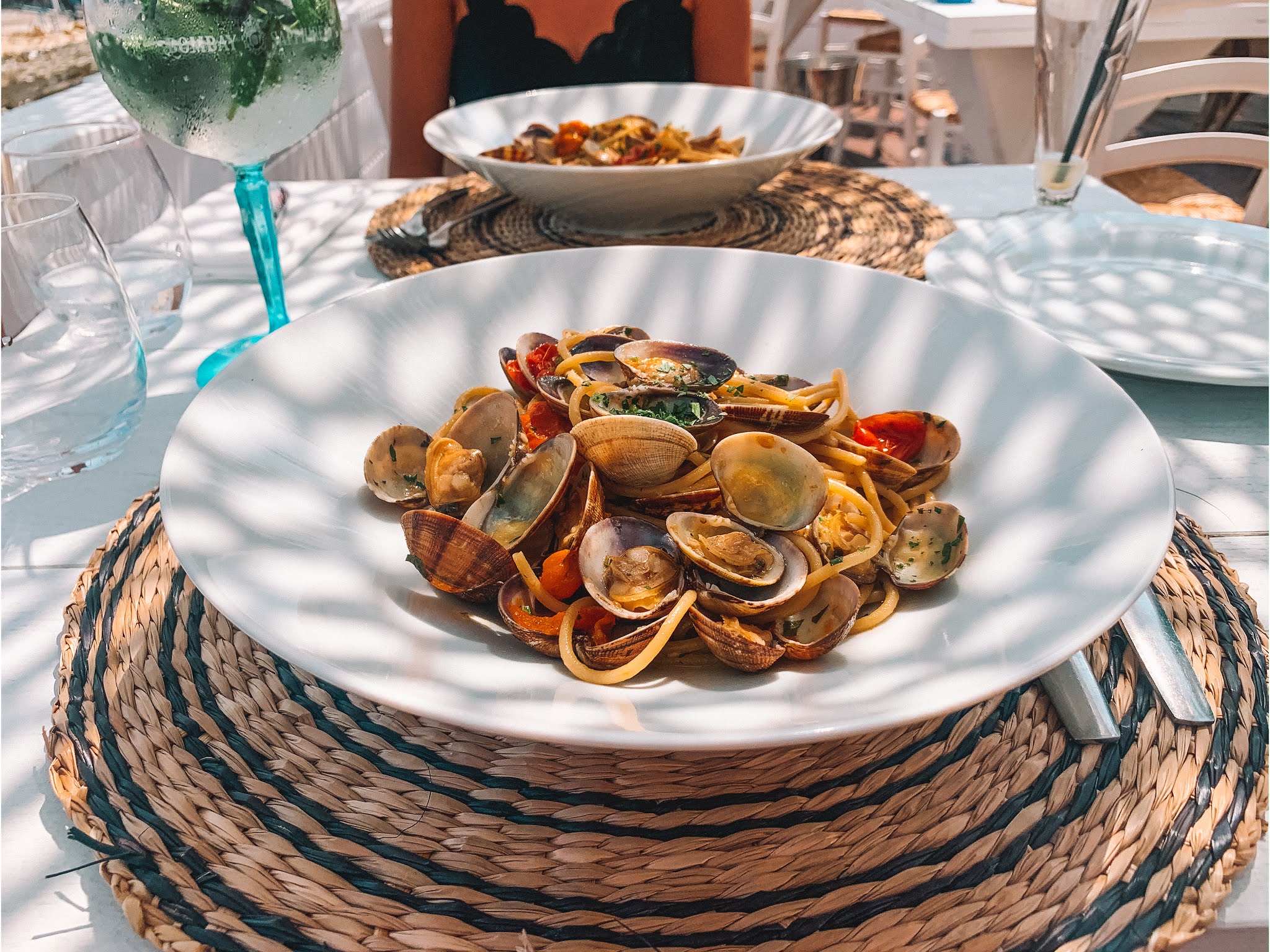De notre accueil à notre départ, rien n'a été lésé. Un personnel souriant et aux petits soins. Nous sommes restés au Noos une journée entière. Nous avons donc loués des transats à la journée face à la mer. Parfait pour l'apéritif avec une jolie vue et une ambiance chill. Nous sommes remontées à la terrasse du haut pour y déjeuner paisiblement. Un menu assez varié est proposé. Nous avons pris deux entrées (le Ceviche et le Melon avec ses copeaux de jambon de parme) ainsi que deux plats (les spaghettis alle vongole qui étaient excellents!) . Nous n'avons par contre pris qu'un seul dessert vu les généreuses quantités des entrées et plats. (Le choco passion que je recommande à 100%! Délicieux avec son coulis fruit de la passion et ses framboises). C'est surtout l'ambiance que j'ai énormément appréciée. On est transporté à l'autre bout du monde. Une déco boho chill qui me fait penser à Bali. Un grand merci à l'équipe du Naos pour cette magnifique journée.