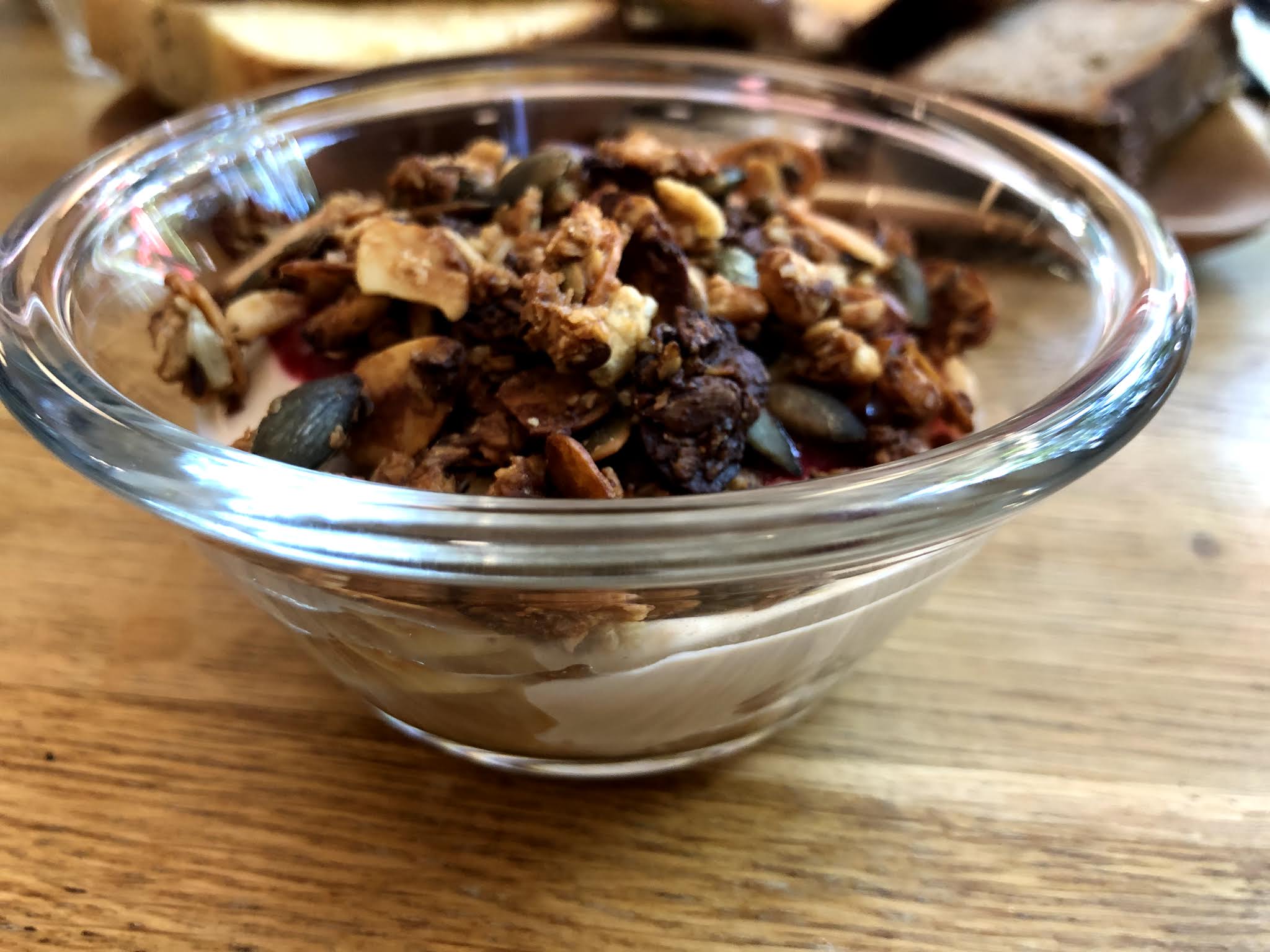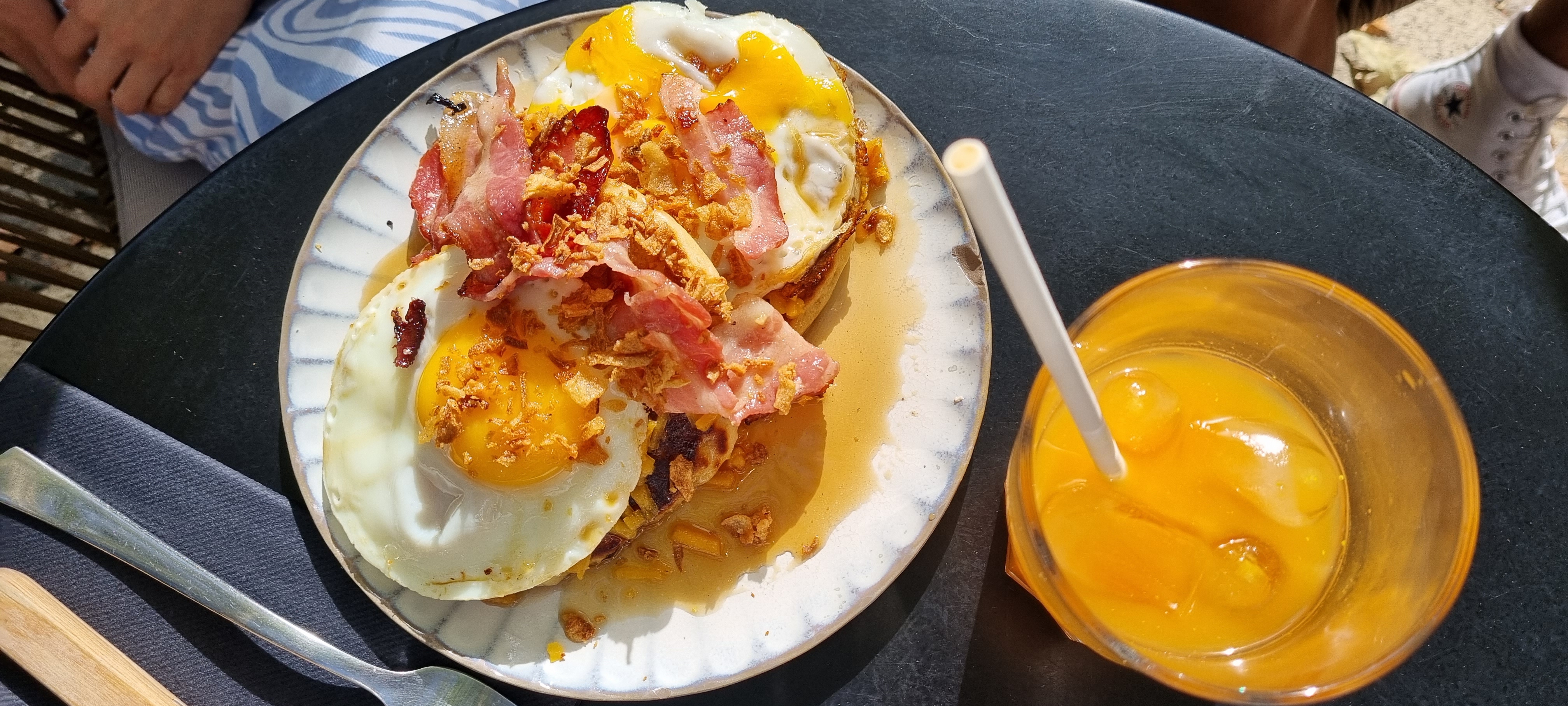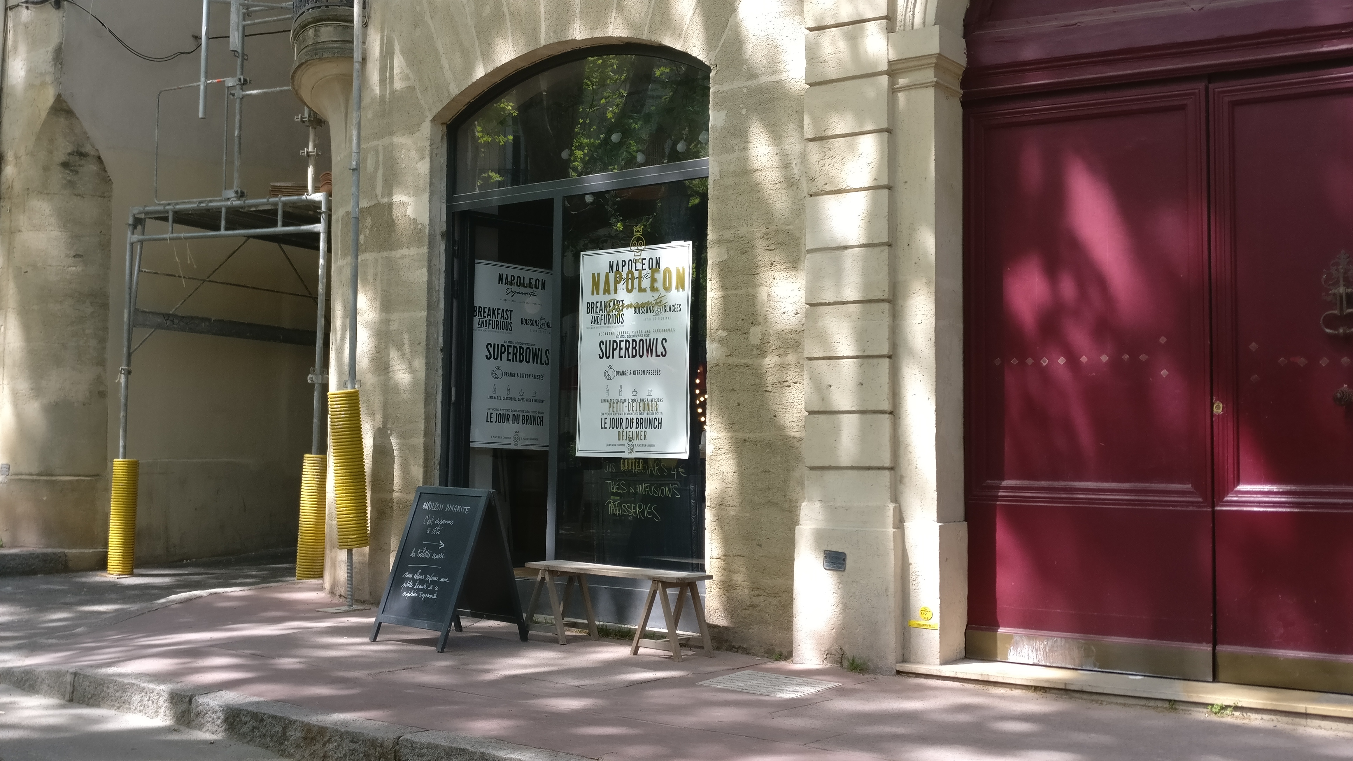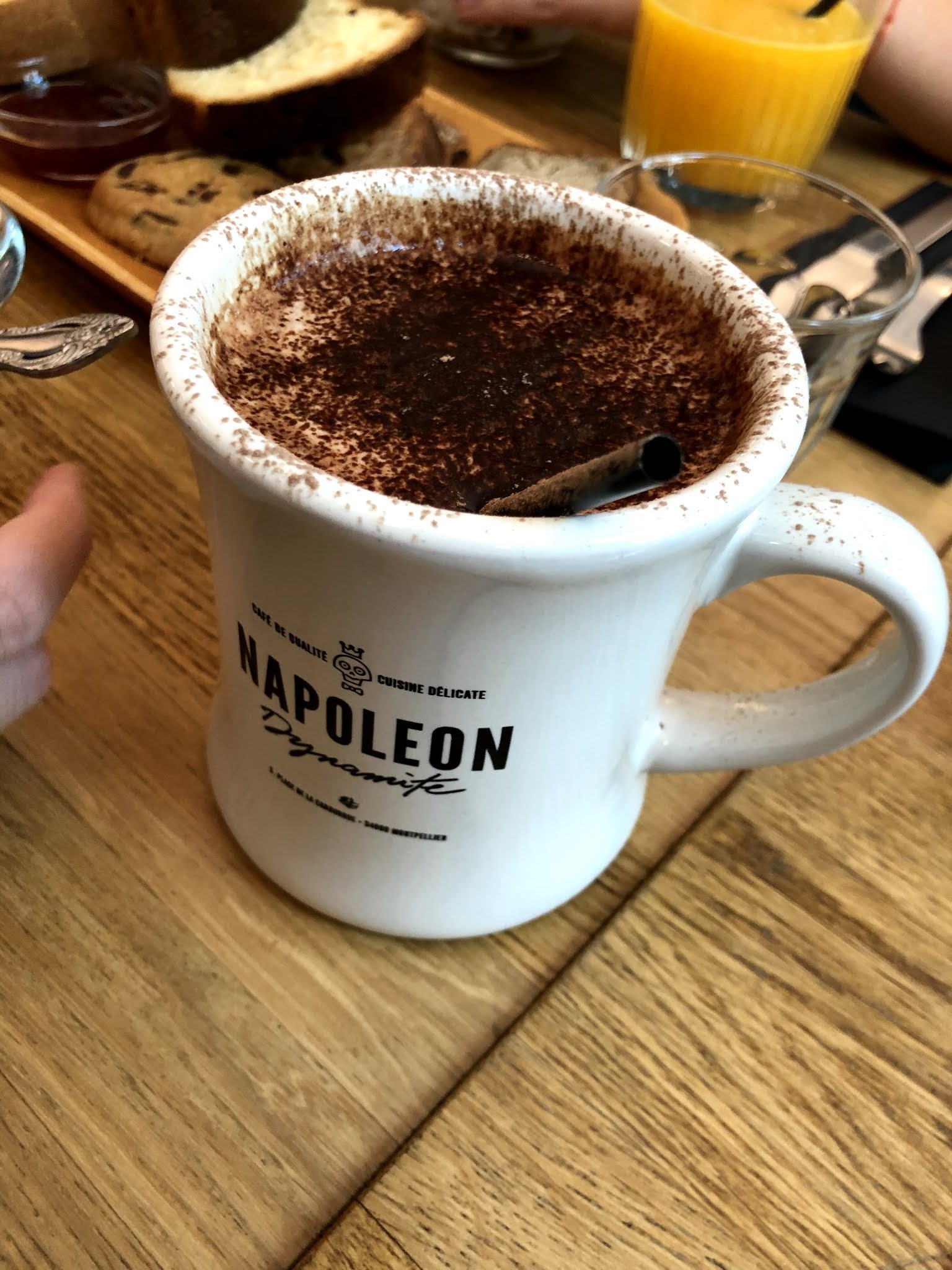 Sur la jolie place ombragée de la Canourgue dans le centre de Montpellier, ce restaurant propose des brunchs et petits-déjeuners variés. Ici le petit déj’ Napoléon Dynamite sucré pour 10€50 : un jus d’orange pressé, deux pancakes au son d’avoine, couverts de sirop d’érable, de quelques graines torréifiées et fruits rouges. Et sa variante salée : les pancakes trônent sous 2 oeufs au plat, sirop d’érable, cheddar et bacon. La boisson chaude est à prévoir en plus, ici un cappuccino pour 4€. Agréable moment.