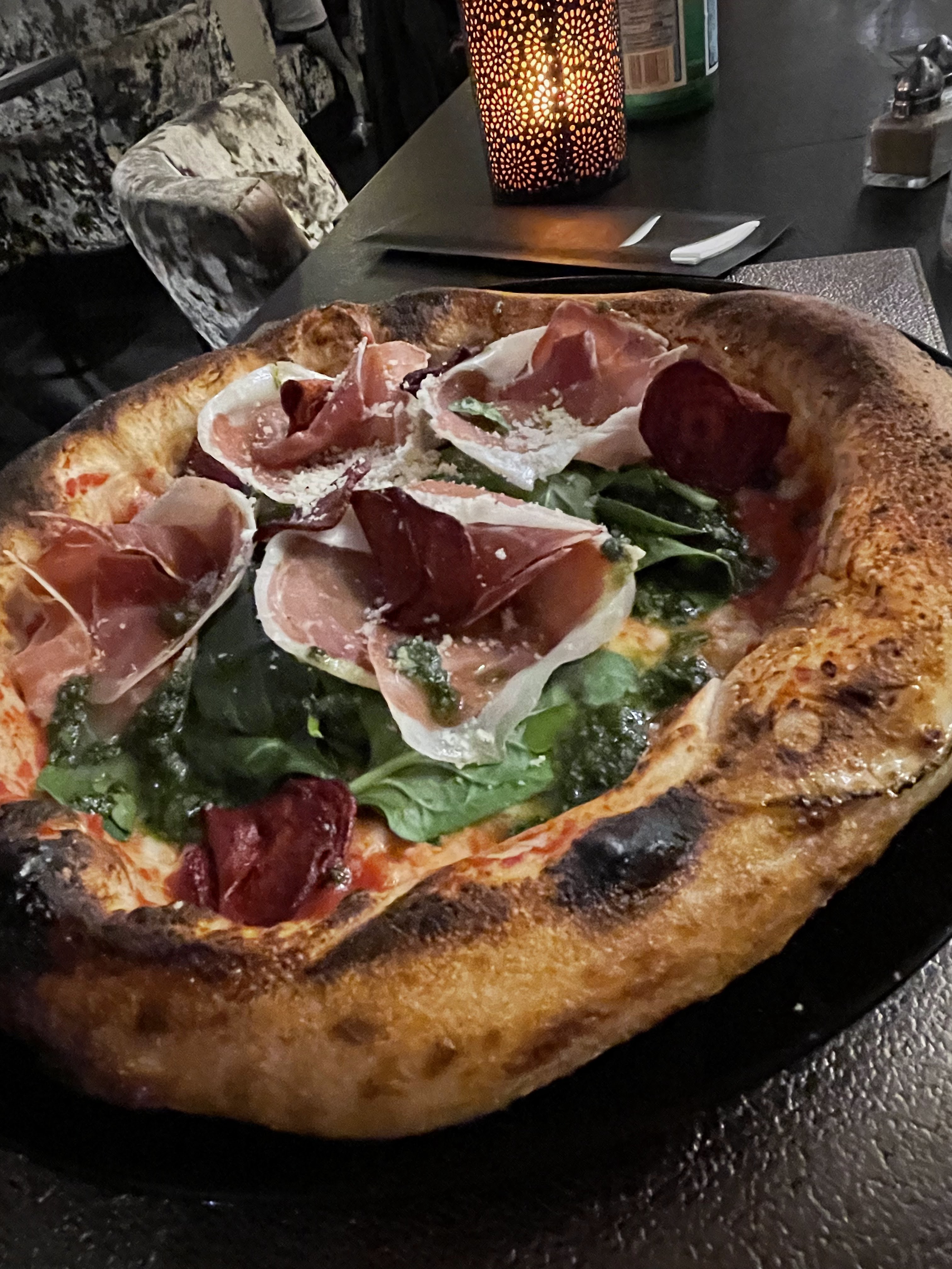 Sans doute les croûtes de pizza les meilleures jamais goûtées : si vous mettez un filet d'huile dessus, on dirait vraiment que vous dégustez un beignet. Un régal. Charcuterie également parfaitement cuite. Même, le Spritz d'Hugo, au sureau, est très délicat et vaut le détour.