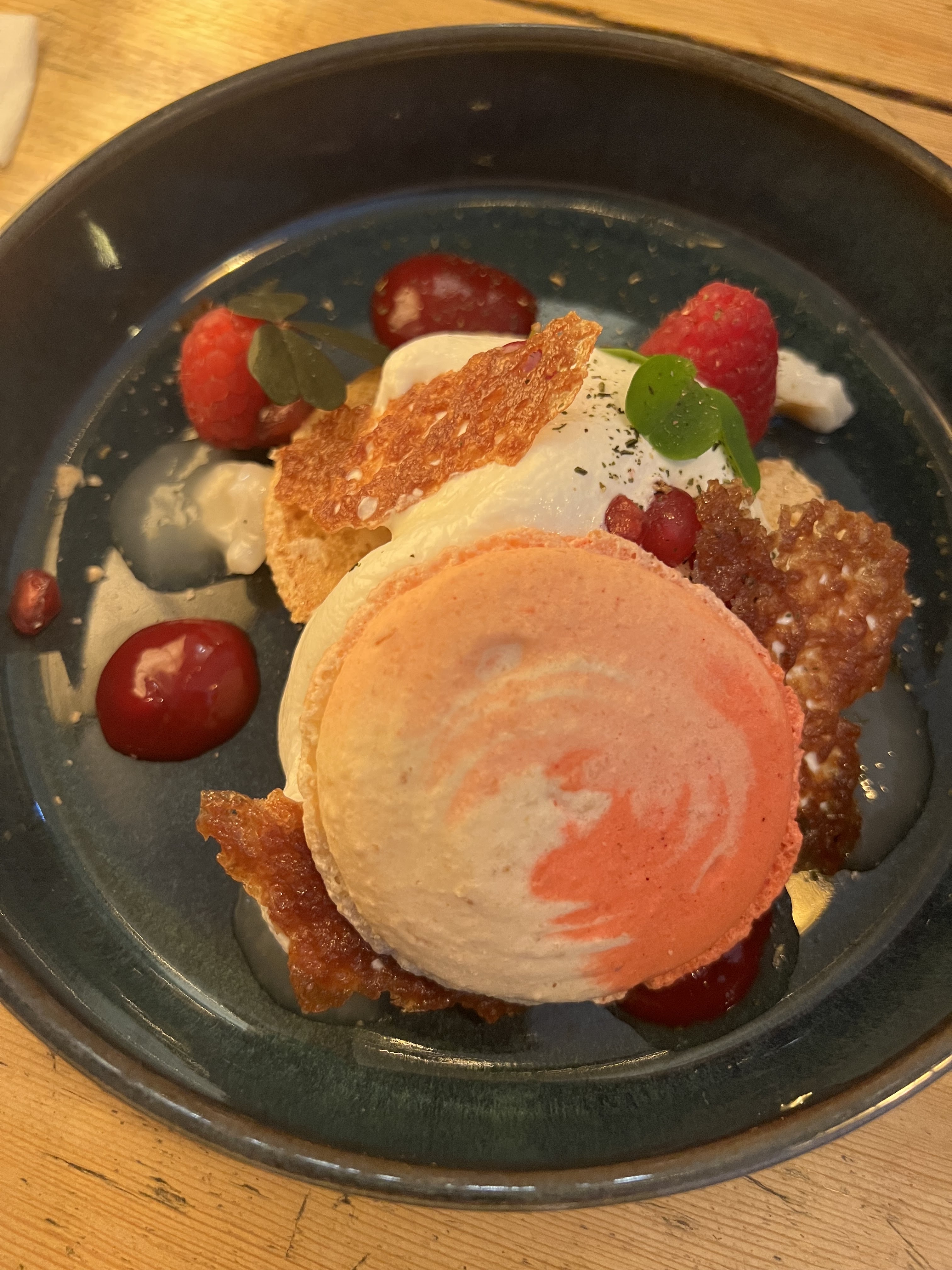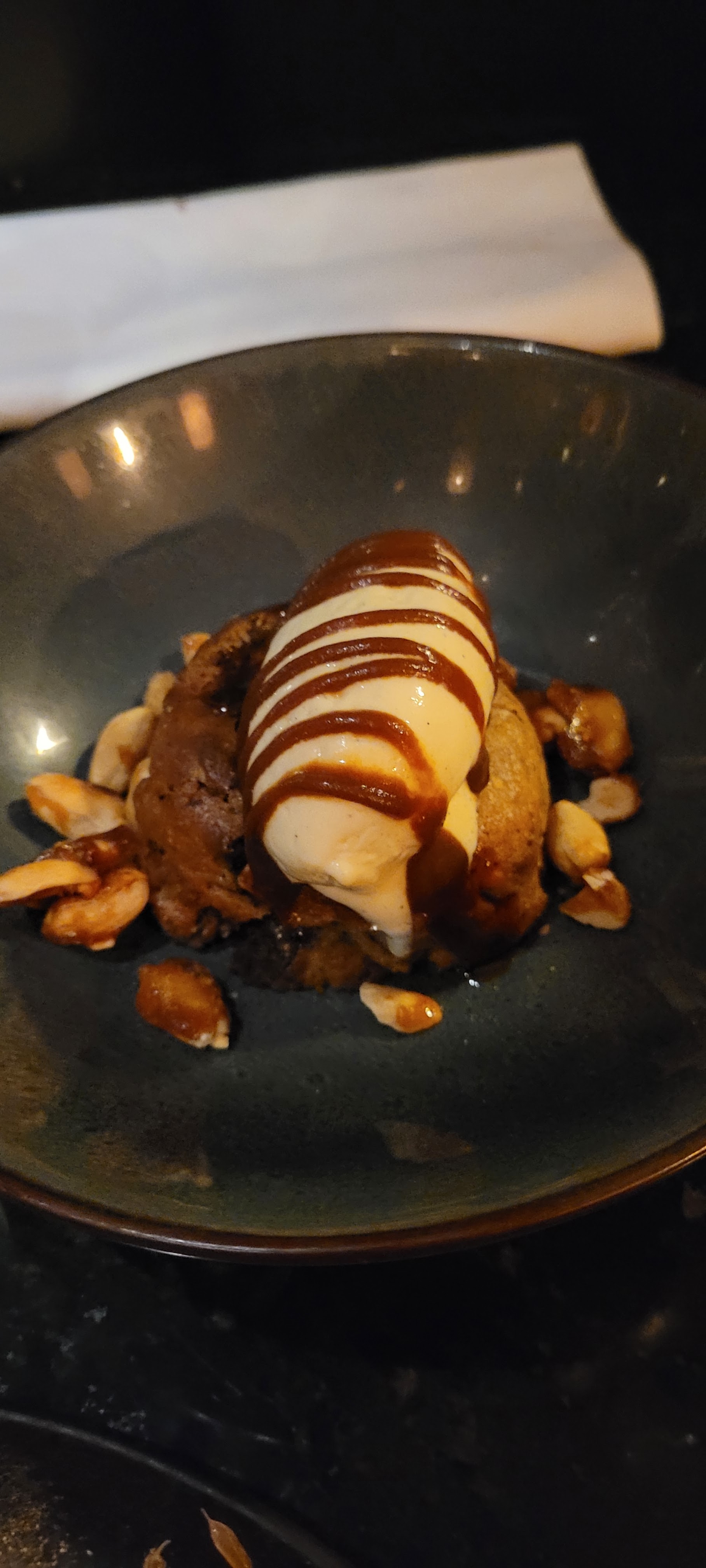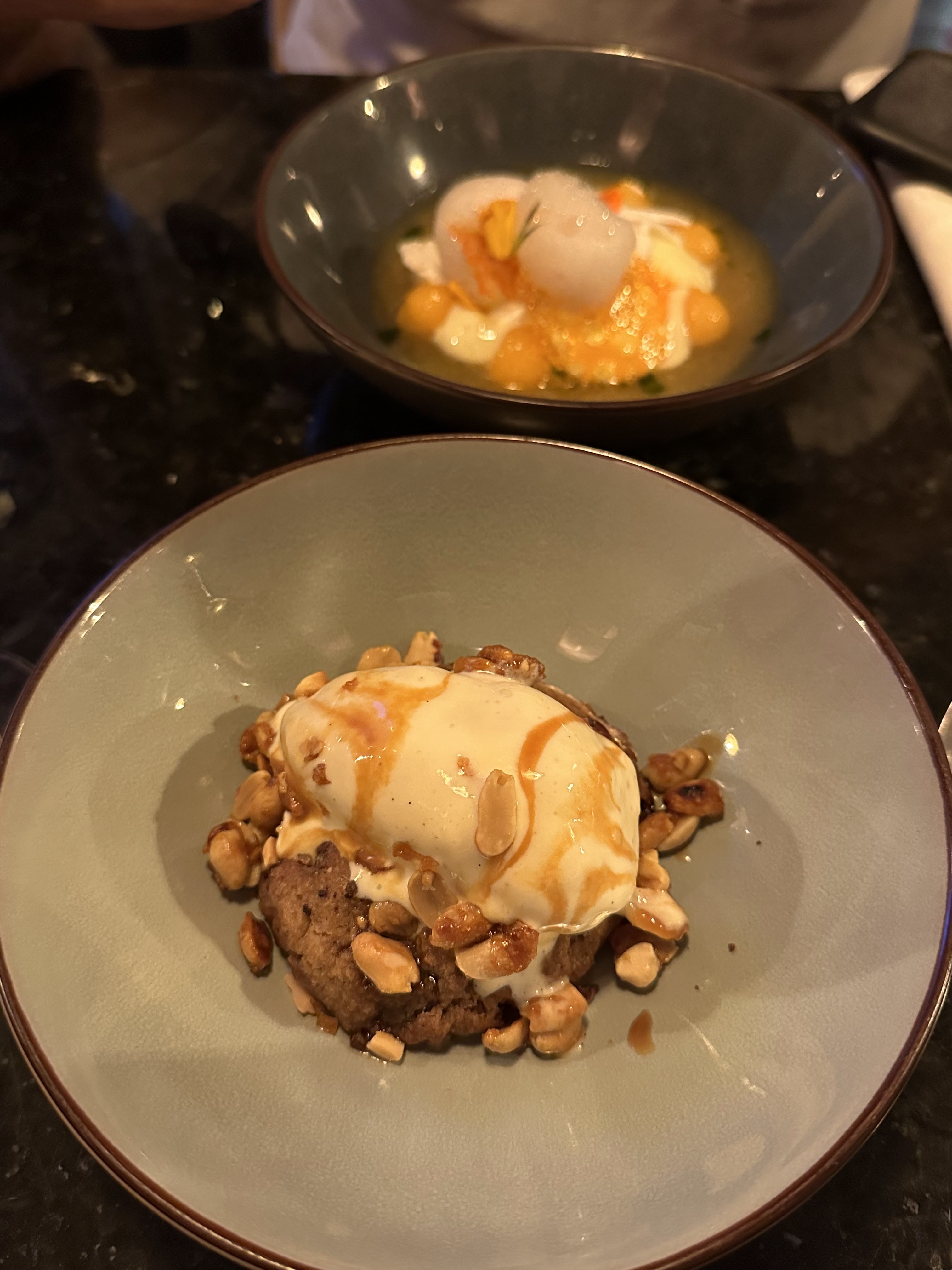 Nous avons eu la chance de pouvoir prendre une table sans réservation. Le service était effectivement lent. J’avais l’impression que le personnel était débordé et stressé par le nombre disproportionné de clients. La nourriture était assez originale et savoureuse, y compris la soupe pop corn. Leur salade était décevante pour le prix tandis que le poisson du jour était agréable. Nous avons adoré leur vin blanc, mais pas tellement le rouge et l'orange. La glace fondue dans les desserts était vraiment décevante (voir photo) et cela s'est évidemment déjà produit, comme je l'ai lu dans d'autres critiques ici. Cela peut être un bon endroit pour dîner pour une fois si vous êtes patient et ne cherchez pas de plaisanteries décontractées avec le chef/le personnel.