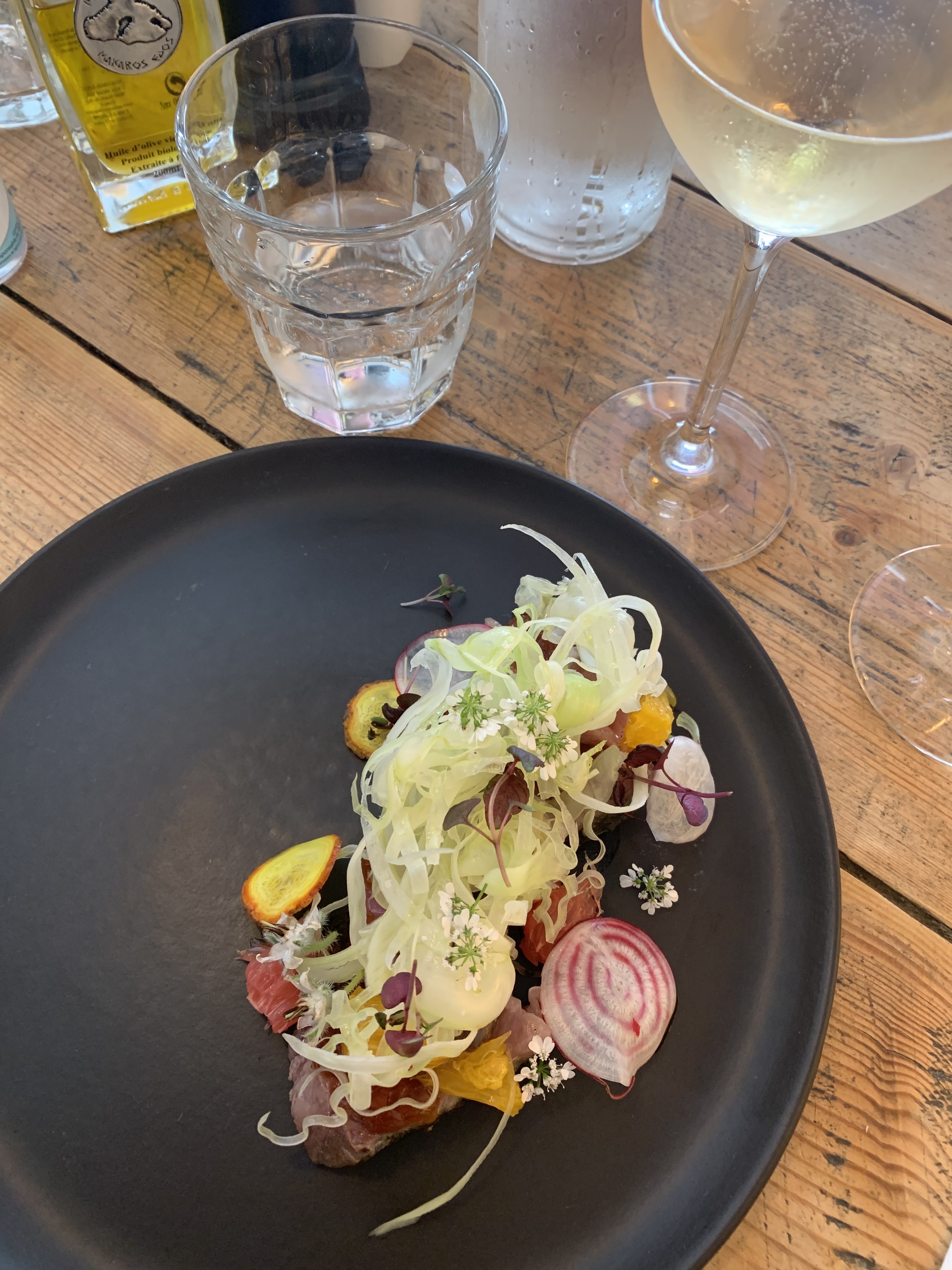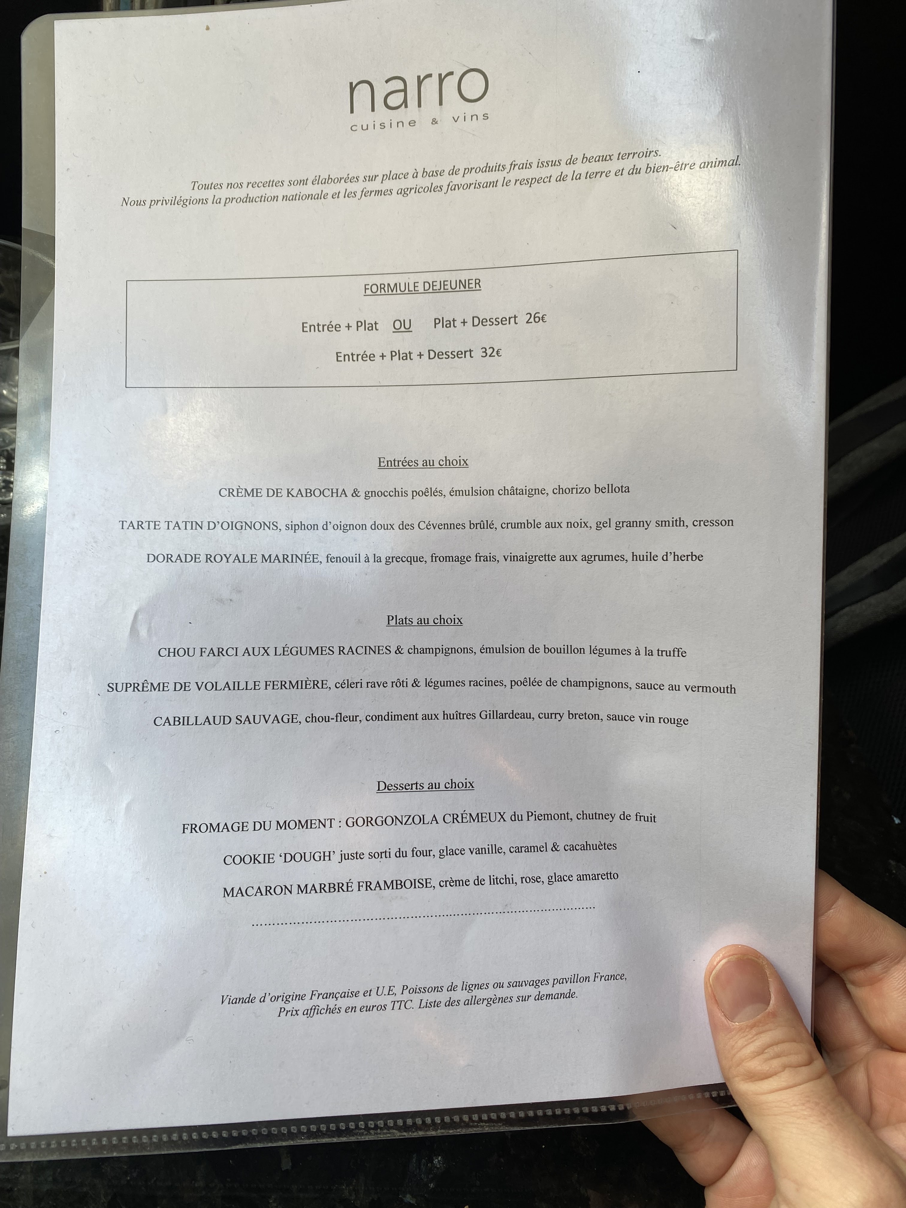 Expérience banale, les plats étaient bons mais sans plus. En regardant les photos sur google nous avons direct opté pour narro, mais le concept du restaurant est en réalité assez confus. Ils se disent bistronomique mais n’ont pas la même quantité d’aliments dans les assiettes que chez un bistrot. Et les prix conviennent plus à du semi-gastronomique… De plus les choix à la carte sont assez restreintes : Le seul plat chaud en viande c’est le ris de veau à 35€. Un plat entièrement composé de courgettes et aubergines à 24€ avec aucune explosion de saveurs, un tataki de rumsteck trop dur à mâcher, et langue de bœuf trop cuit. Le ris de veau était bon mais écœurant lorsqu’on a pas d’accompagnement… Bref les assiettes sont belles, le décor sympa mais narro a été décevant (on a même dû aller manger le fromage et les desserts ailleurs..)