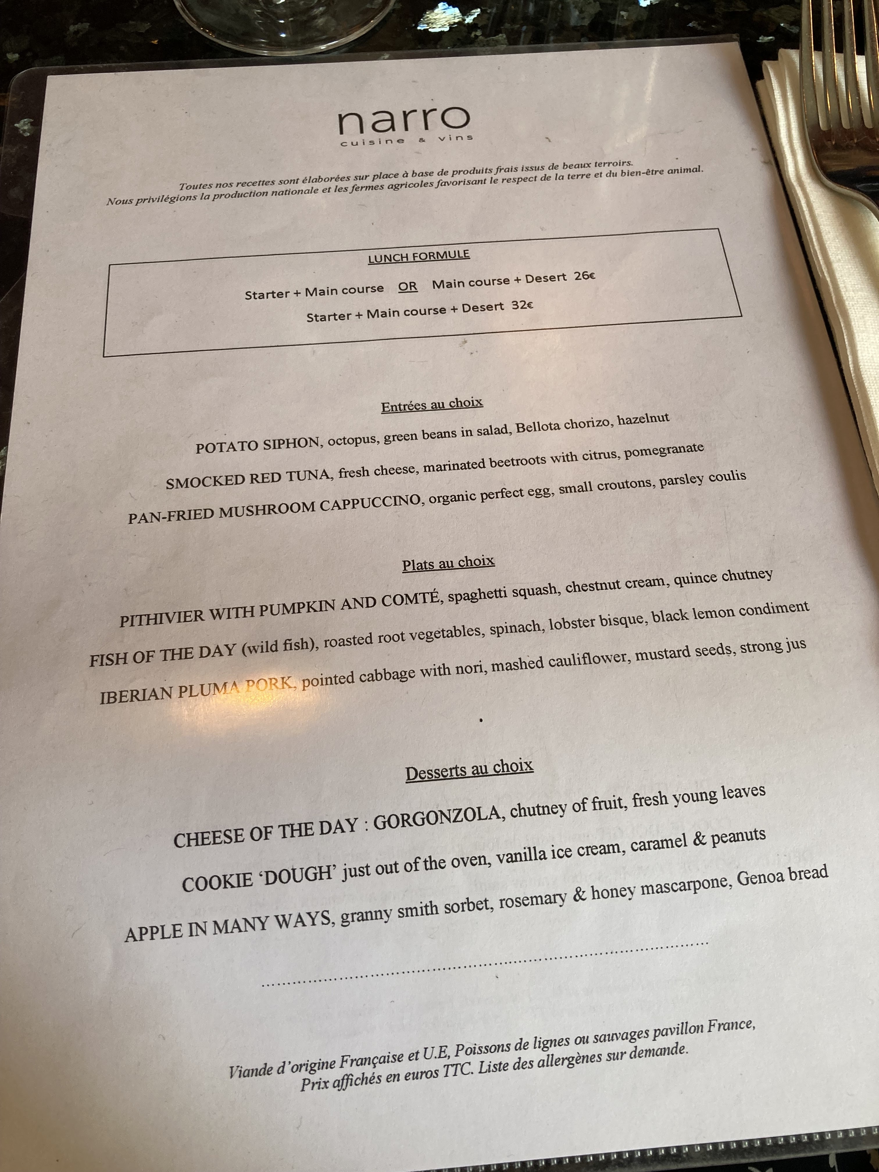 Bel endroit! Cuisine créative et délicieuse à un prix raisonnable, surtout pour le déjeuner. Détails : Nous (2 personnes) avons pris deux menus déjeuner (formule déjeuner), l'un comprenant uniquement une entrée et un plat (28 €), tandis que l'autre comprenait une entrée, un plat et un dessert (34 €). €). En entrée nous avons eu le Tartare de noix de veau et la Coquille Saint Jacques (Bretagne) (Coquilles Saint-Jacques). Pour les plats principaux nous avons eu la Cuisse de pintade et le Poisson du jour. Enfin, pour le dessert nous avons pris le Gorgonzola crémeux. Toutes les entrées et plats principaux étaient délicieux - il ne fait aucun doute que chacun d'eux mérite individuellement 5 étoiles. De plus, j'ai trouvé tous les plats assez originaux et créatifs, ainsi que joliment présentés, ce à quoi on ne s'attend pas forcément au vu de la façon dont certains plats sont nommés. La créativité et la présentation des plats méritent d'être mentionnées car c'est l'une des choses qui distinguent un bon restaurant d'un chef amateur talentueux : un chef amateur talentueux pourrait-il cuisiner quelque chose de savoureux à la maison ? Bien sûr, avec quelques efforts. (Même si ce ne serait toujours pas aussi savoureux que la nourriture que nous avions à Narro.) Un chef amateur talentueux pourrait-il proposer des repas aussi créatifs et beaux que les plats de Narro ? Certainement pas. Date de visite : 21 novembre 2023