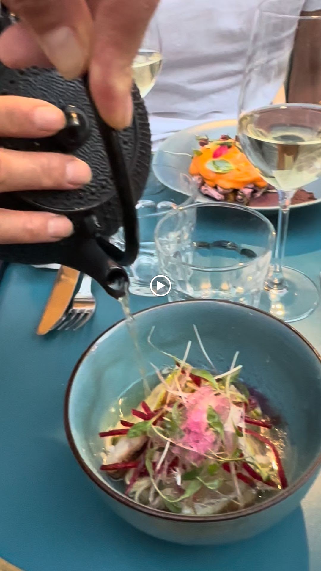 La nourriture et le vin étaient excellents. J'ai senti que les rebondissements et les surprises étaient là dans la nourriture. Merveilleusement présenté. Malheureuse confusion dans les desserts - peut-être perdue dans la traduction - mais pas de réel problème. Bon mélange de locaux et de touristes, ce qui est génial. Le prix était plus élevé mais dans l’ensemble ça valait le coup. Légère sensation d'inconfort à l'extérieur où l'espace était limité et donne l'impression de « tomber à la renverse » en raison de la légère pente du platelage construit.