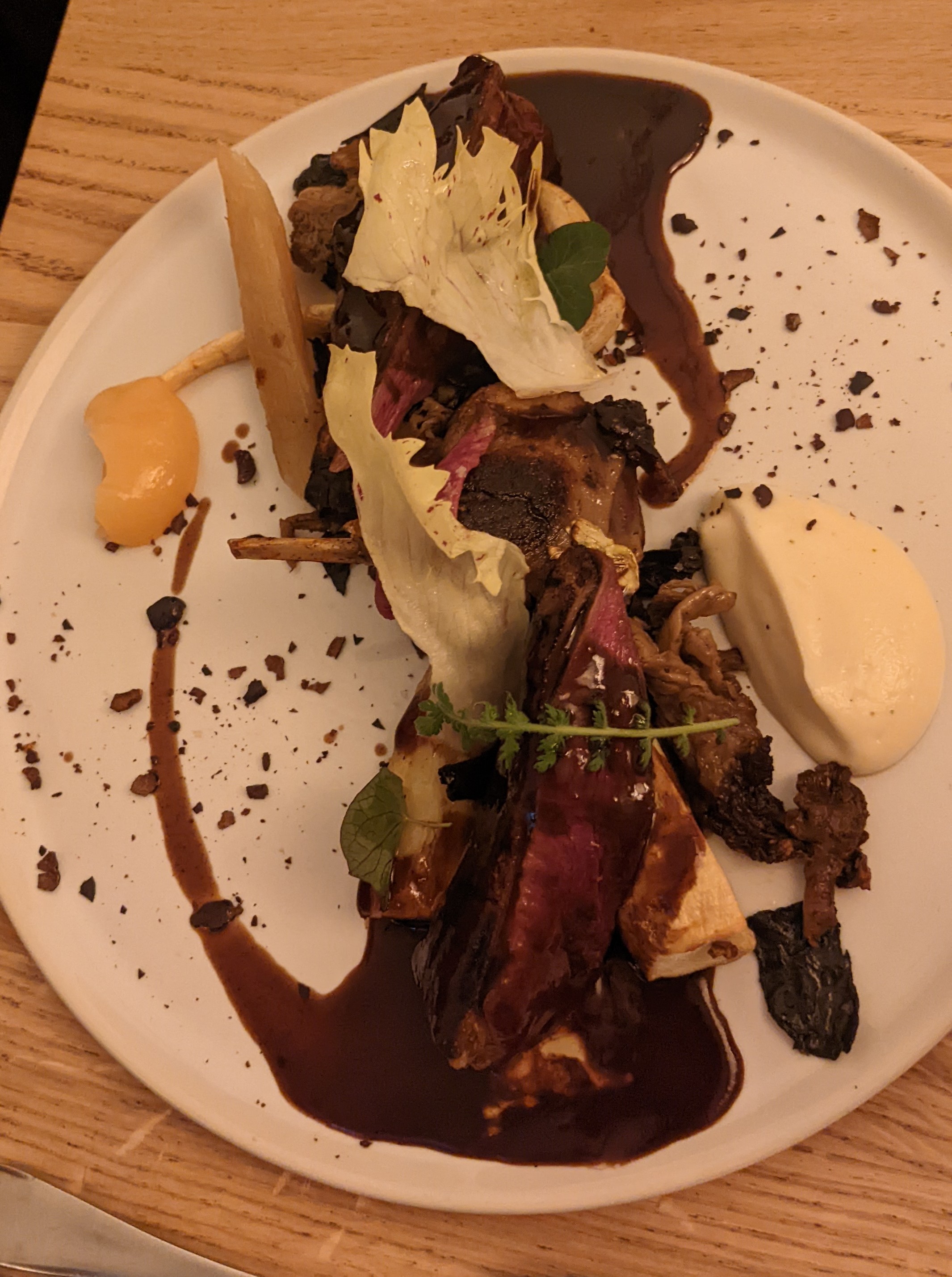 Juste parfait ! Un mariage d’ingrédients astucieux, original et maîtrisé. Les noisettes sur le magret (tendre, avec une belle lamelle grillée sur le côté) sont du génie. Prix extrêmement abordable, appréciables, et personnel tout à fait sympathique. Mercii ! ❤️