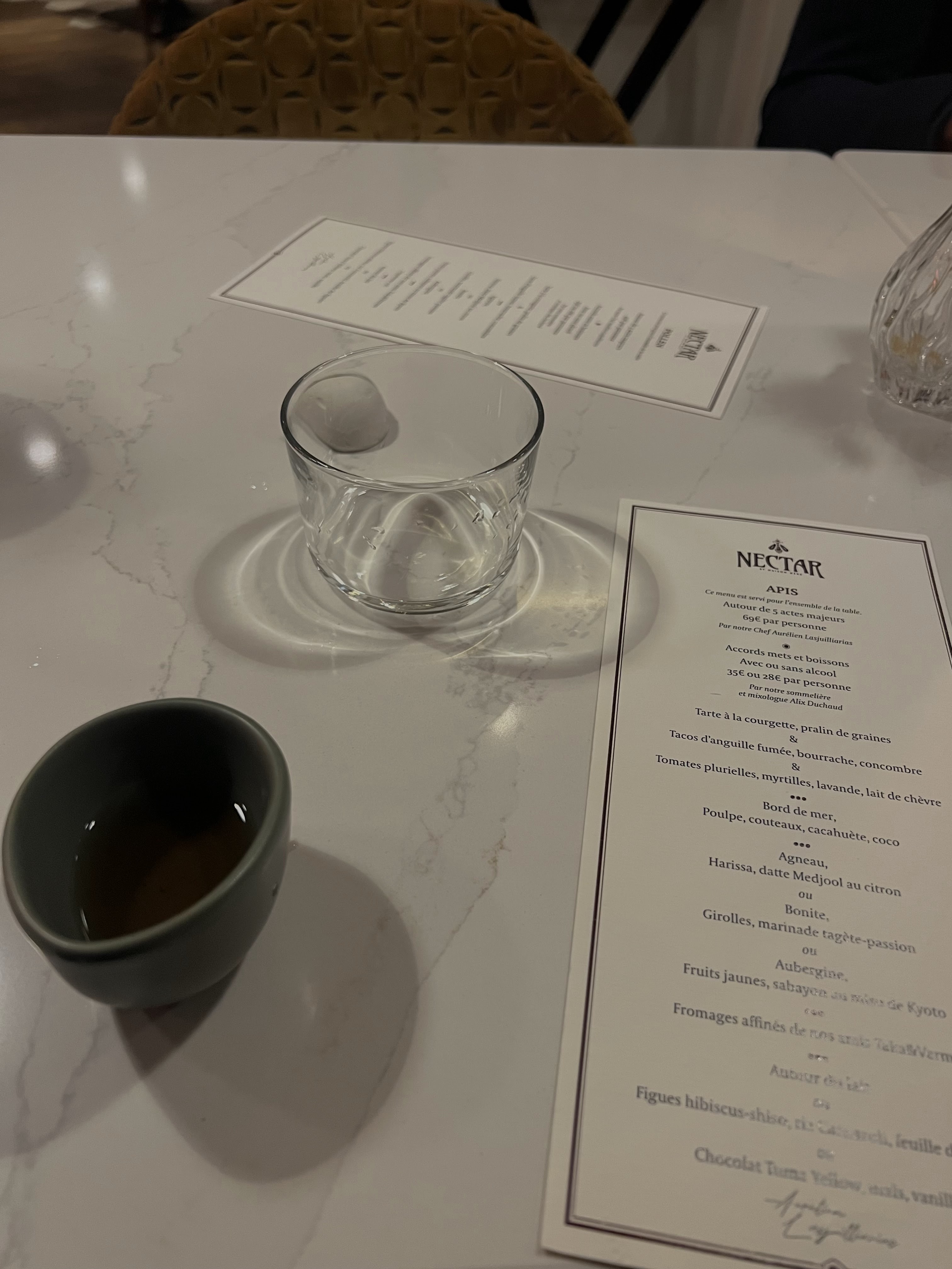 Tout était parfait: personnel agréable et extrêmement attentionné, plats de style gastronomique avec de belles surprises gustatives tout au long du repas tant sur la nourriture que sur les accords boissons. Nous avions opté pour le menu à 5 plats (il y en avait en fait plus, équipe très généreuse). Rapport qualité prix imbattable (69€/pers le menu 5 plats) à nos yeux sur Paris, pour nos papilles comblées. Le +: on a la possibilité de faire écrire une jolie lettre personnalisée à l'avance s'il s'agit d une occasion spéciale (sera posée sur la table à l'arrivée). Nous y retournerons sans hésitation lors du prochain menu qui change à chaque saison. Un grand BRAVO ET MERCI à toute l'équipe Nectar qui a de beaux jour devant elle!