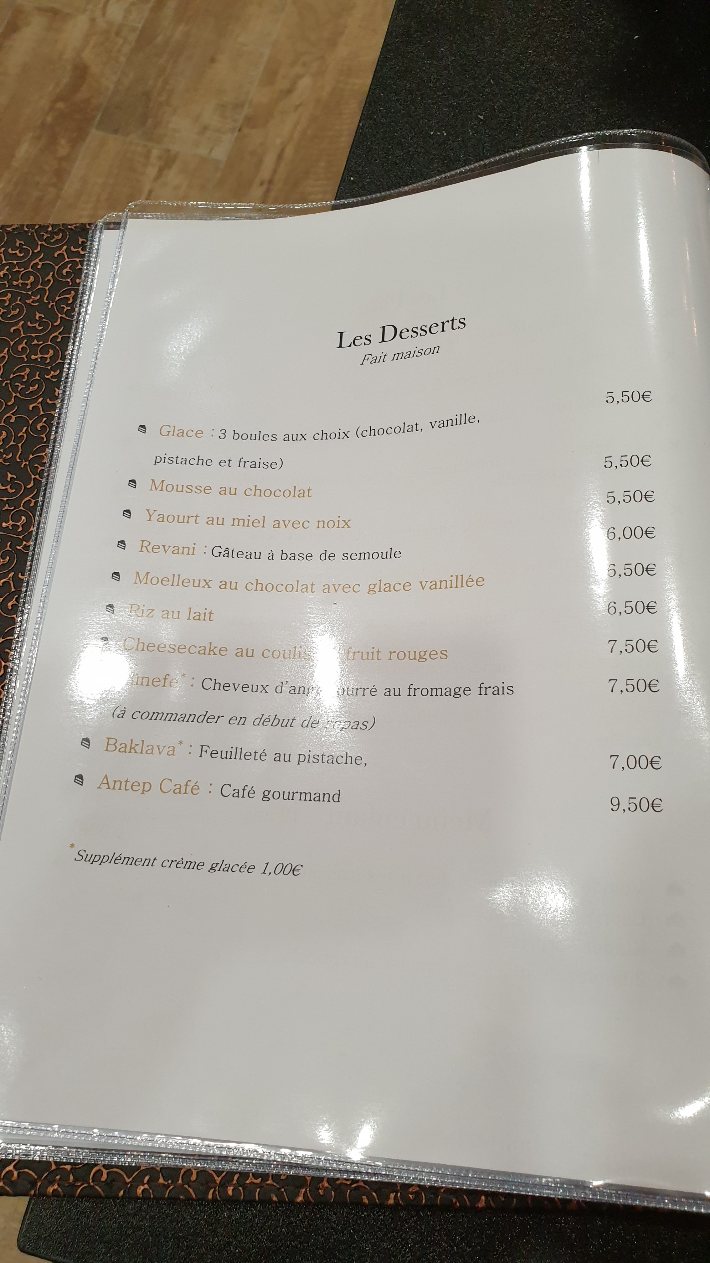 Serveurs super sympa ! Une ambiance très agréable à l'intérieur. + : tous les plats , pide, mezzé, glace turque . - : kunefe (il en existe des meilleurs), café gourmand Je recommande tous les plats mais surtout les traditionnels