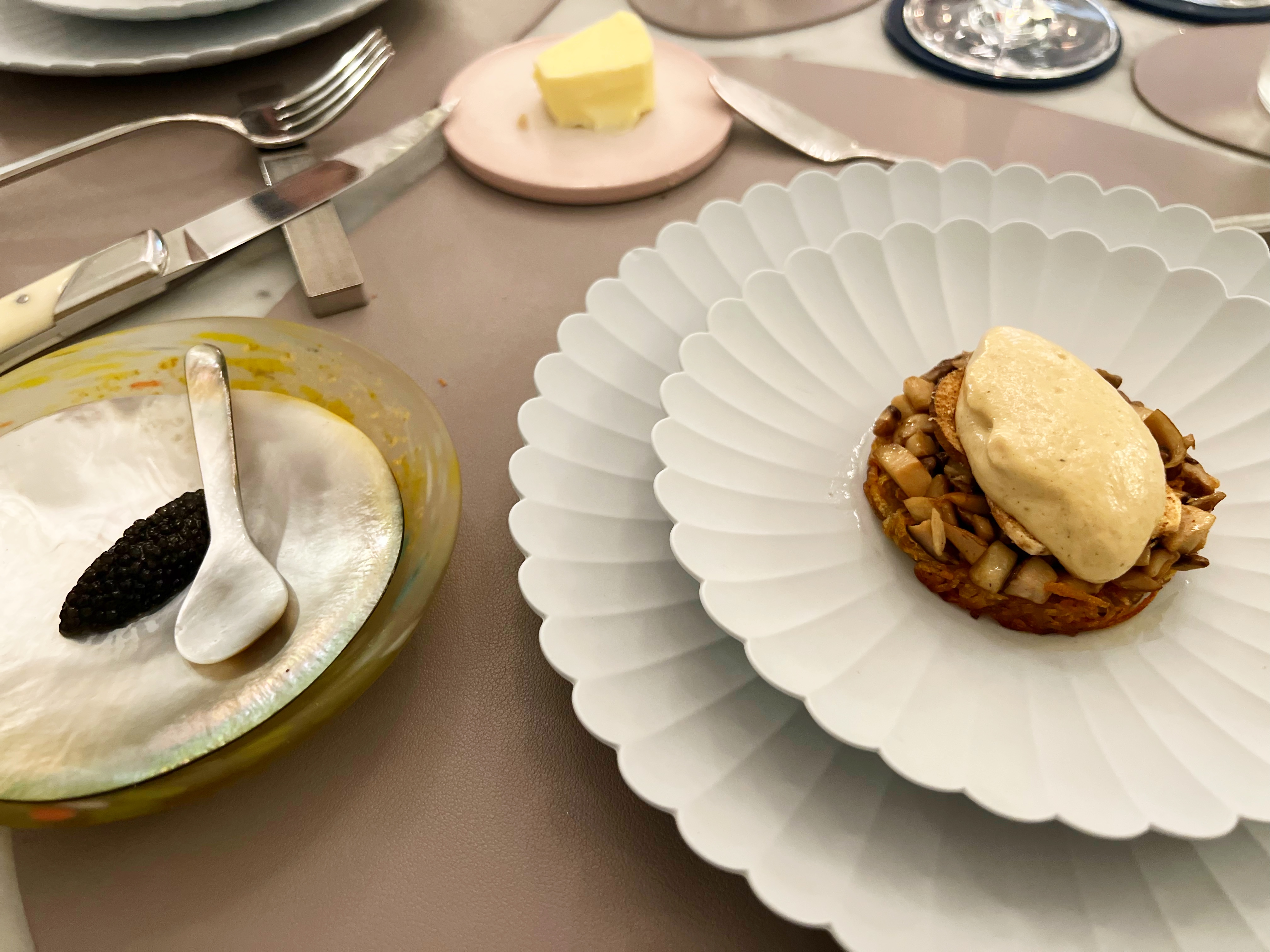 Dîner ce soir avec mes collègues . Cadre sympathique . Mets parfaitement travaillés . Service impeccable . Un peu brouillon pour le menu avec les options caviar . avec un verre de vin , nous avons payé 384€ . C’est un peu excessif.