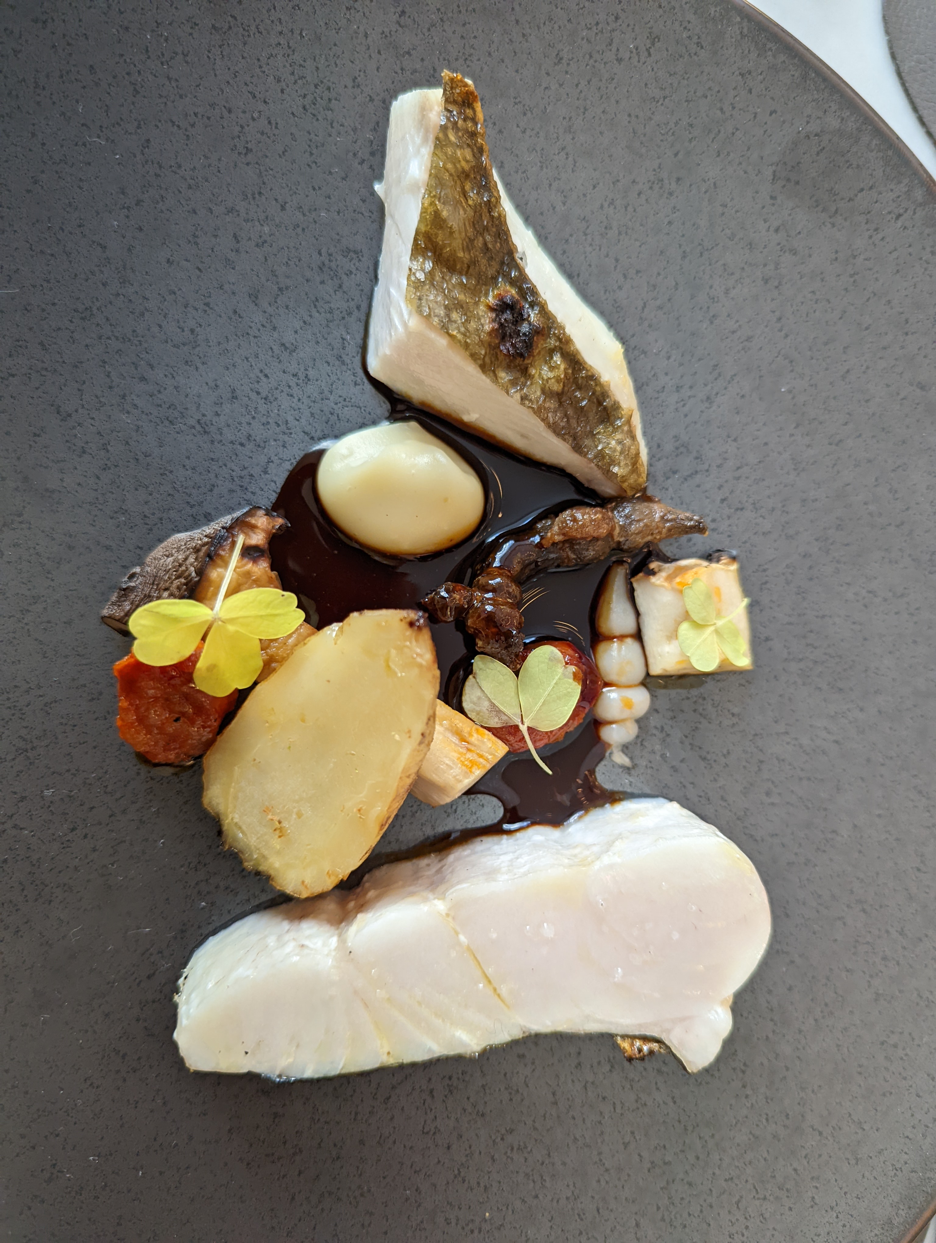 La nourriture était bonne et raffinée mais un peu trop simple pour un étoilé, elle pourrait être plus surprenante. Par contre le dessert à la pêche et au céleri confit était lui plutôt surprenant, peu sucré avec des textures équilibrées. Le décor on aime ou on aime pas, un peu froid pour ma part mais la vue sur la cuisine en impose, c’est très clean. Ils sont beaucoup dans un petit espace. Le service était efficace