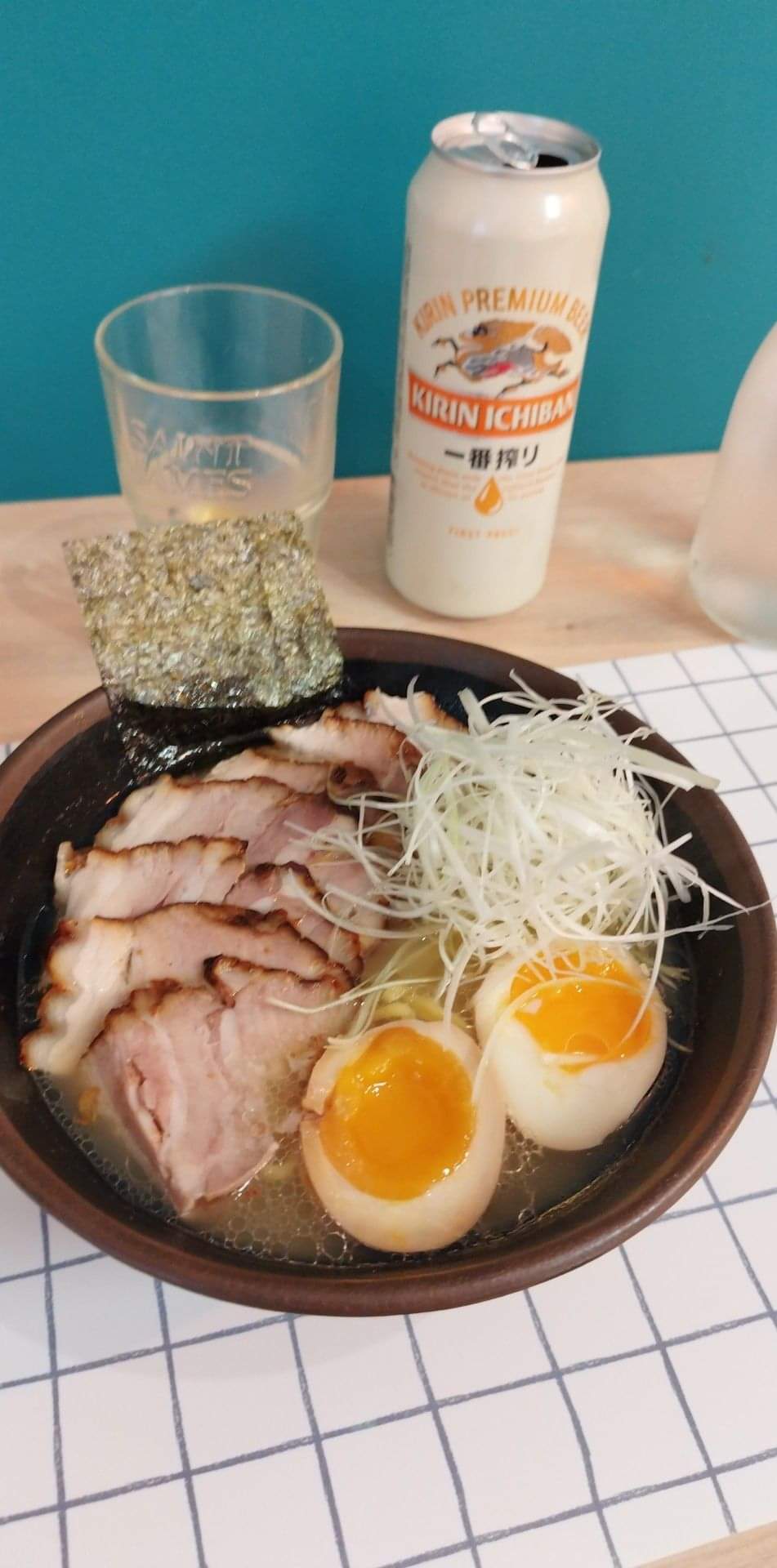 Bouillon extrêmement aillé, qui emporte tout. 3 fines tranches de rôti de porc non grillés. Demi œuf dure, une feuille de nori. Plat pas généreux sauf pour pour les pâtes... Bref experience pas du tout convainquante. Dommage