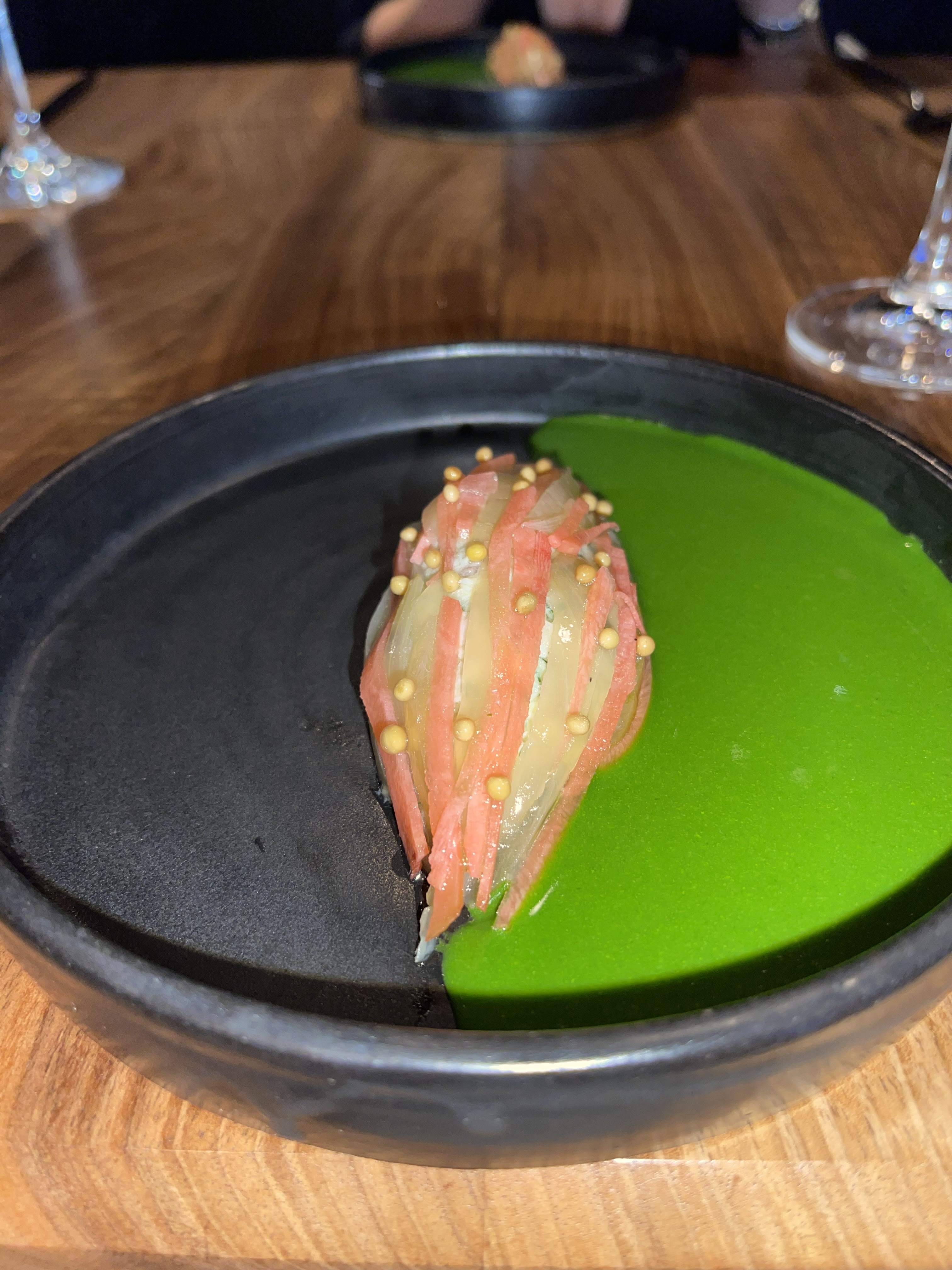 Mon ami et moi avions l'option « le menu » avec quelques plats différents. Ils ont pu accueillir mon ami sans gluten et m'ont recommandé un très bon vin pour accompagner notre repas. Je m'attendais à une étoile Michelin avec la beauté et l'innovation de la nourriture. Mais le restaurant est peut-être encore très jeune. C'était un endroit calme et petit mais il y avait quand même de nombreux sièges et une pièce latérale pour une grande fête. Je reviendrais ici encore et encore. Mes compétences en photo ne rendent pas justice à cela.