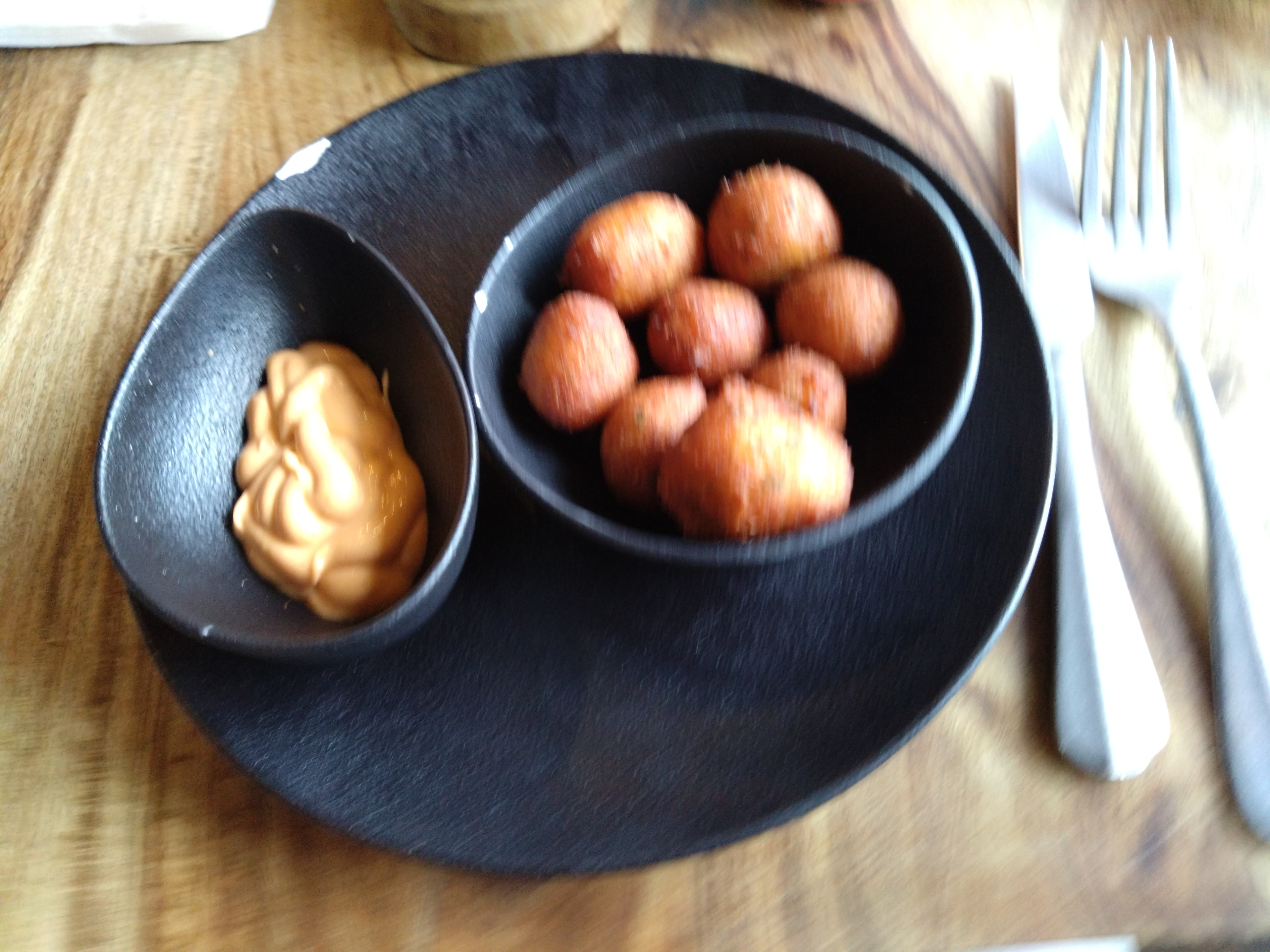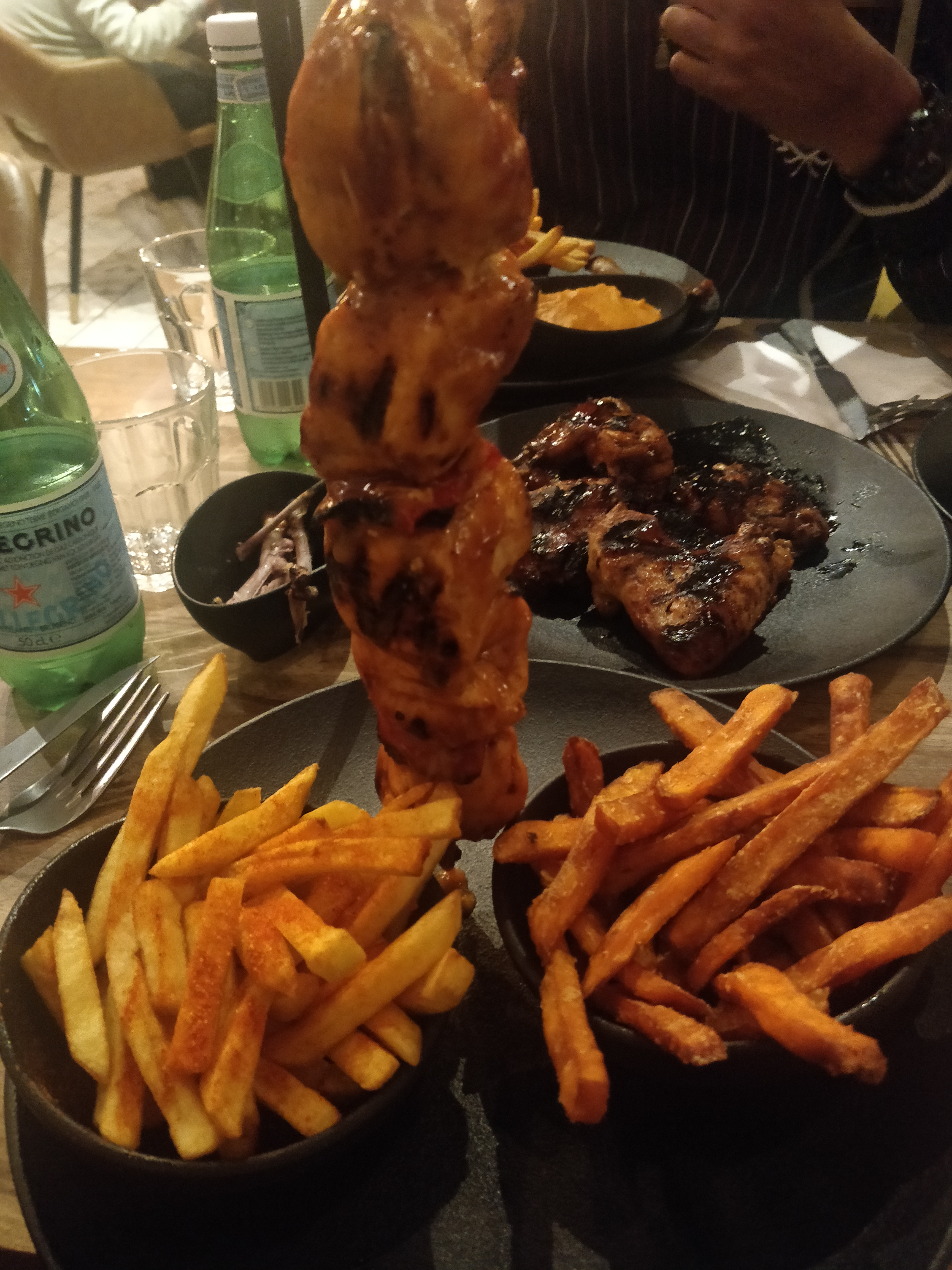 *L'endroit est plutôt sympa, l'ambiance cool. *Le service, il n'y en a pas, obligé d'aller prendre sa commande au comptoir,ce qui bouche l'entrée et fait un effet de masse c'est dommage.. *L'accueil plutôt cool et sympa. *Les plats: brochettes de poulet frites de patates douces : croustillante et bonne et frite peri-peri:pas mal la poudre mais dommage frite pas croustillante et purée de patates douces un délice. La brochette un peu sèche au bout et tendre vers le haut bonne sauce piquante pour la marinade c'était bon. Les wings bbq très bonne le fiston a laissé son plat au profit des wings, ses émincés de poulets du menu enfant étaient pas terribles pas de goût. En bref les wings extras. Par contre l'attente 45 min entre la commande et le plat. Il faut améliorer cela et faire un système de service.