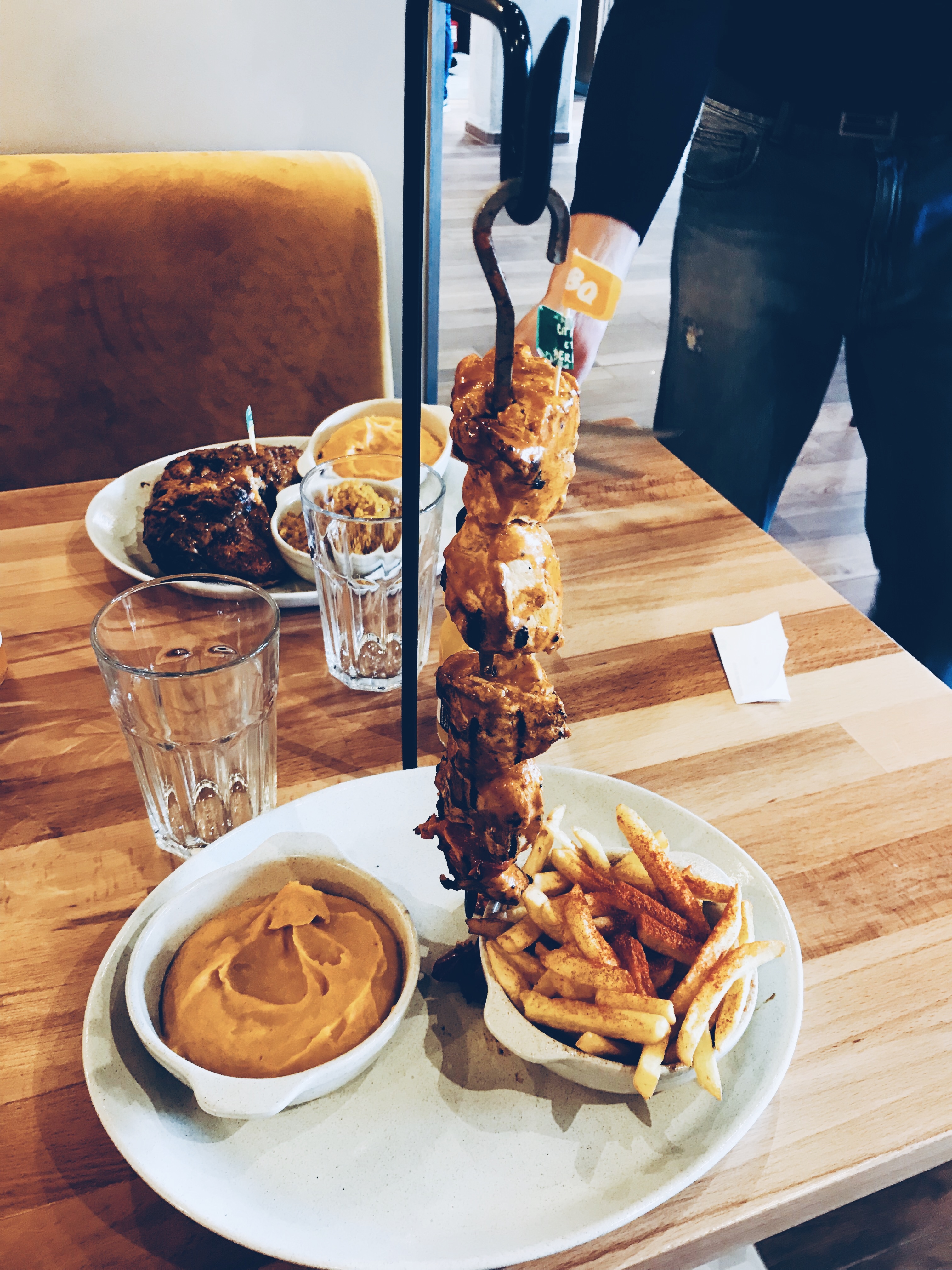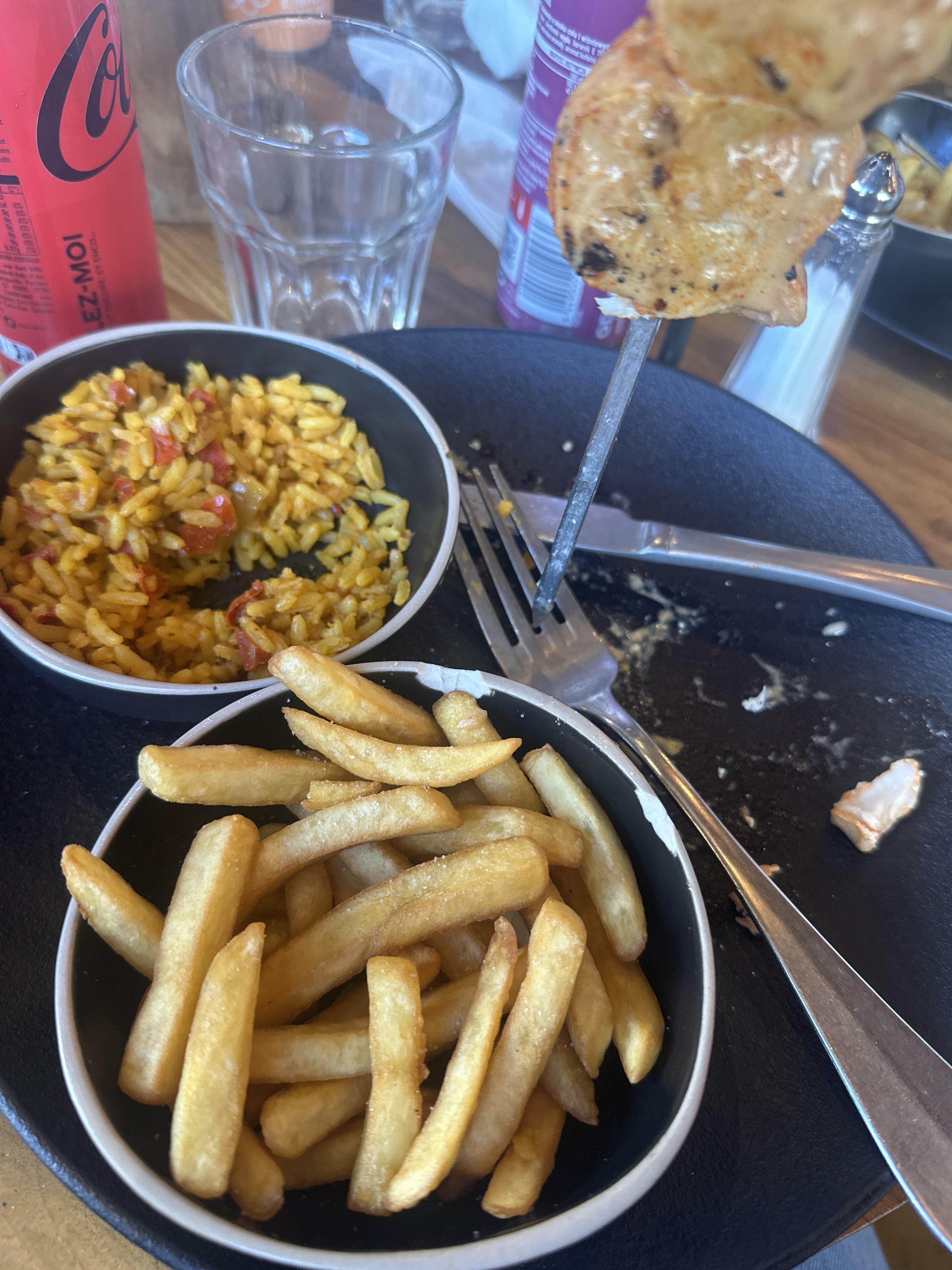 Mon fils a commandé une brochette de poulet avec deux petits accompagnements de frites patates douces comment vous dire : les portions sont ridicules de l'arnaque pure et simple c'est 4 morceaux de poulets qui se battent en duel, le tout pour 14€ y avait même pas de boisson avec !