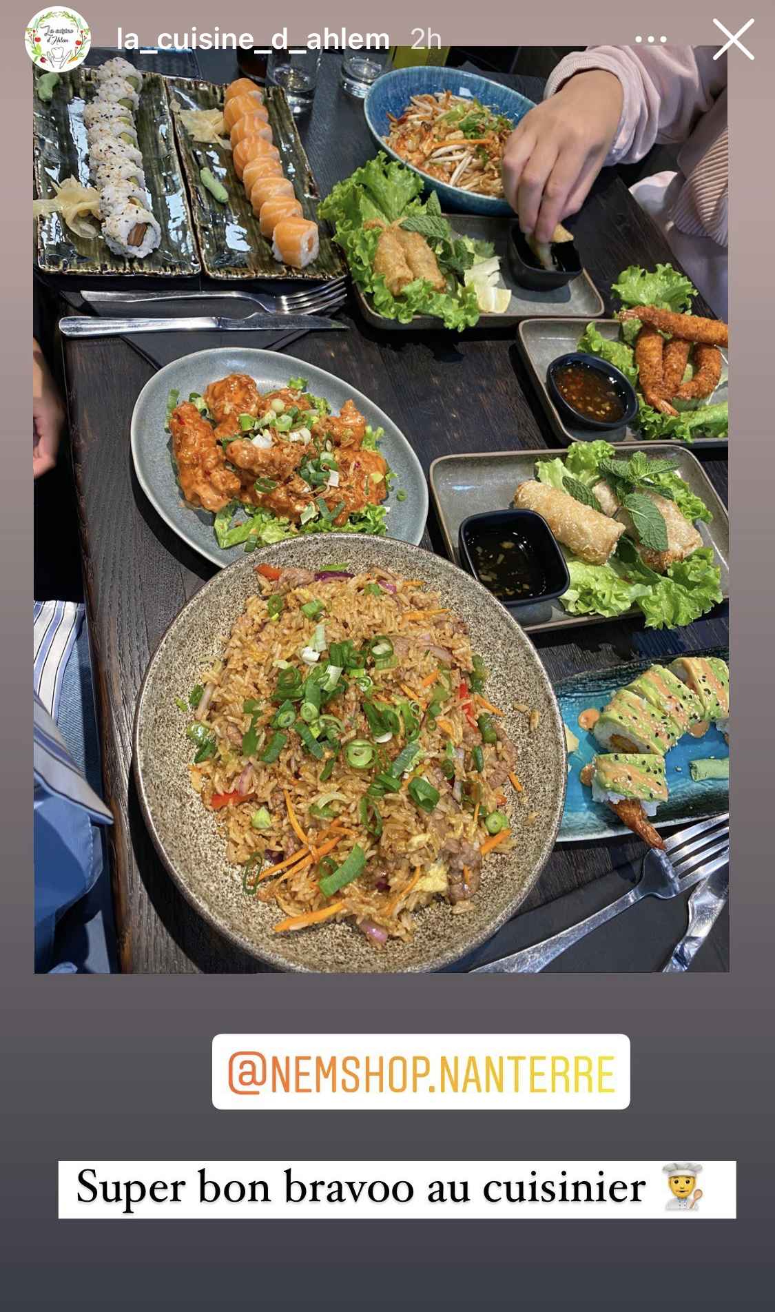 J'ai beaucoup apprécié mon repas chez Nemshop, le service et l'équipe sont au top ! La carte peut satisfaire tous les goûts que l'on aime les plats thaï, japonais ou chinoise. Merci pour l’accueil !