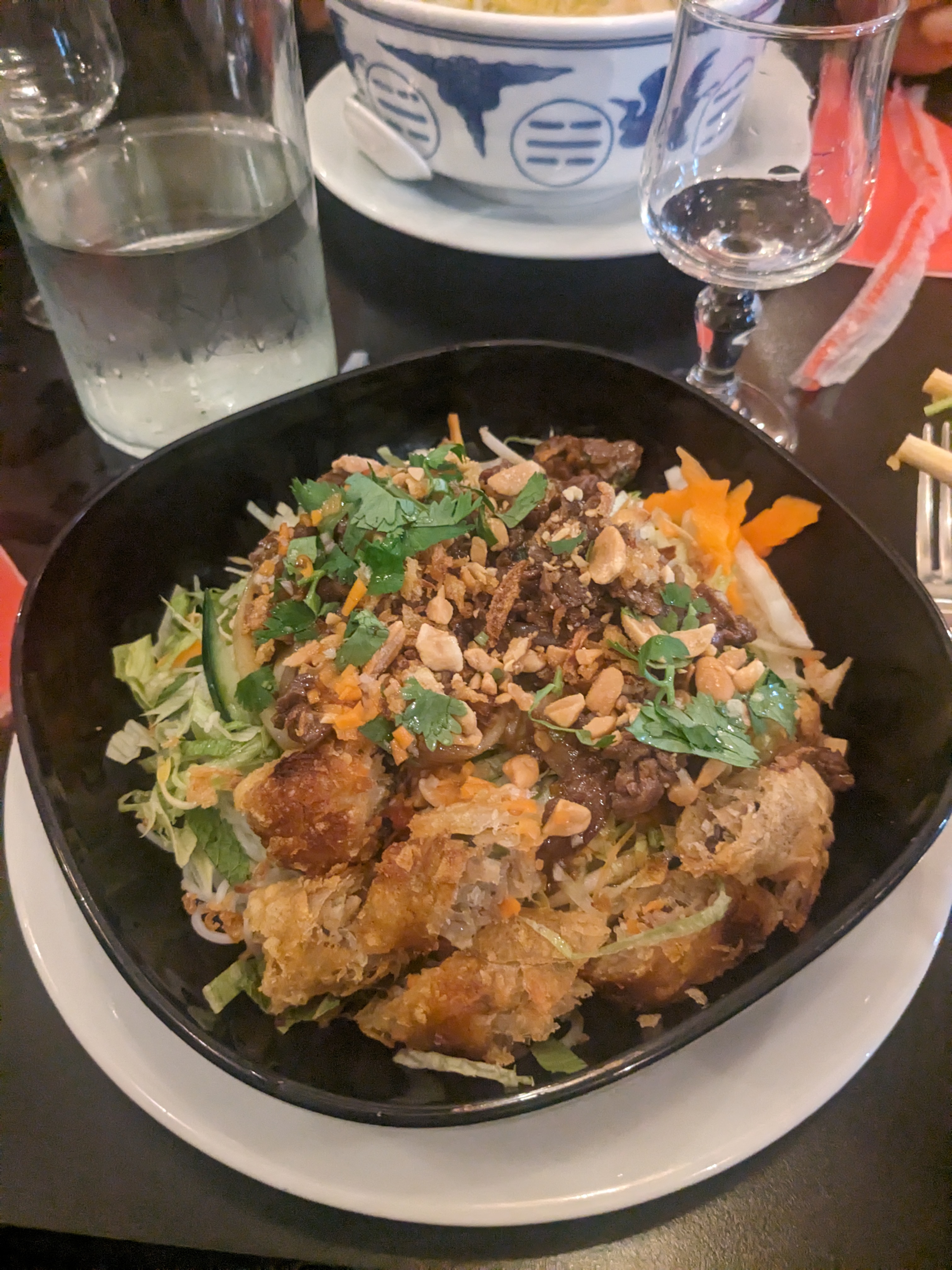 Le service est impeccable,les plats sont bon avec du goût et copieux la salade bobun a manqué de cacahouètes et carottes .les nems ,correct..!