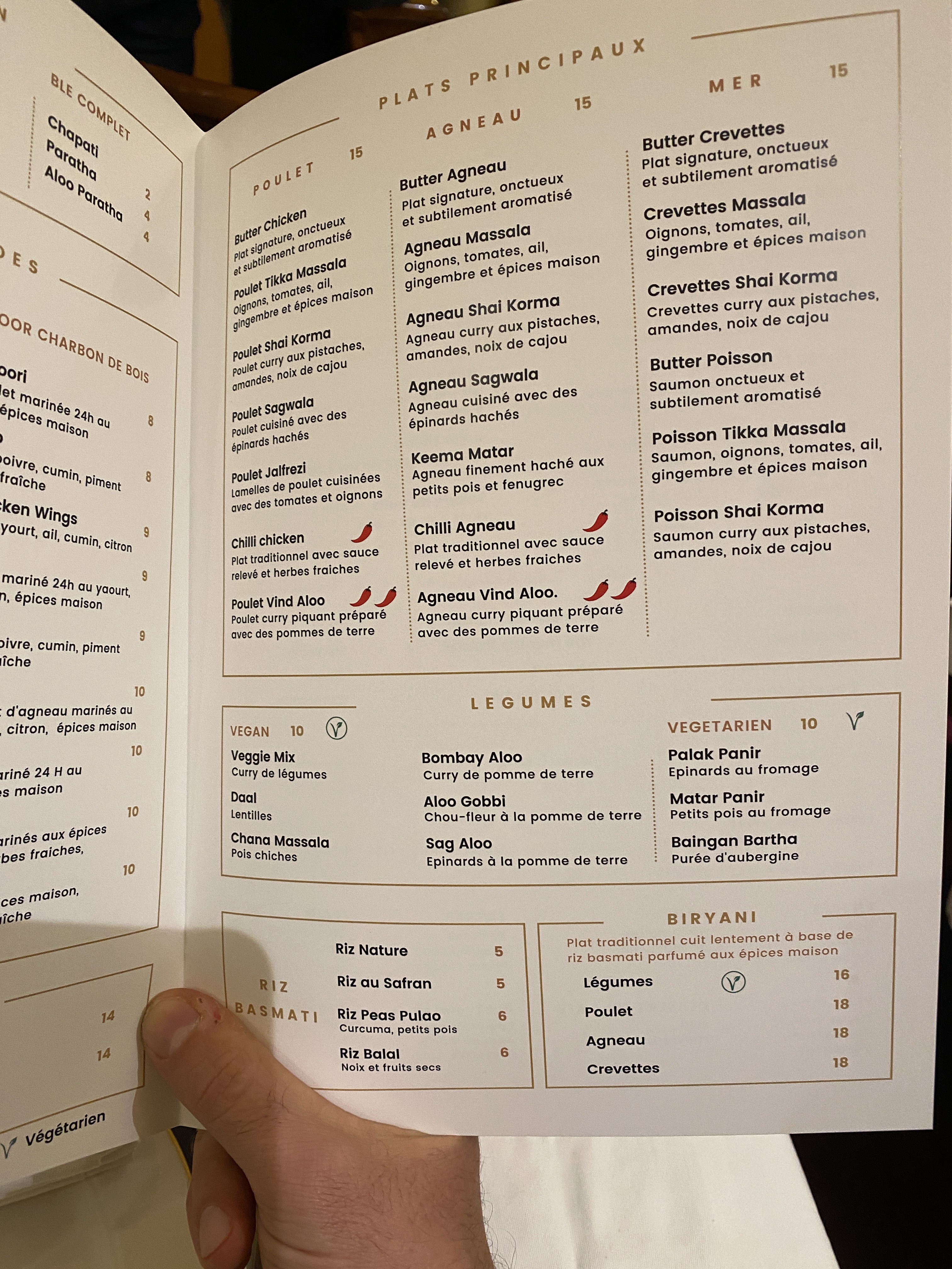 Leur poulet au beurre était absolument délicieux; pas du tout comme dans les autres restaurants indiens que j'ai testés à Paris tellement bons. Ils avaient aussi une grande variété de naans.