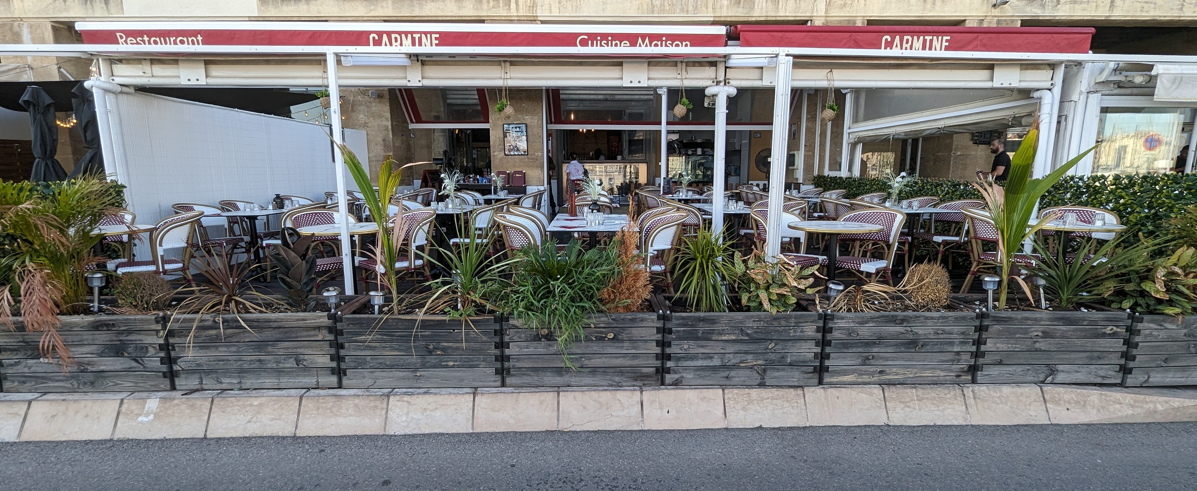 Bonsoir, Nous sommes une famille de 8 personnes qui se sont arrêtés dans ce petit restaurant avec vue sur Notre Dame de la Garde sur le vieux port. L'acceuil fut très très sympathique, souriant et humoristique (Antoine), souriante (Margharita (désolée si je fais des fautes dans les prénoms)). La demoiselle dont malheureusement nous ne connaissons pas le prénom, très souriante, gentille, aussi. Une équipe au top. Une installation en terrasse très rapide, avec une vue imprenable face au vieux port et au loin Notre Dame de la Garde avec un fond musicale doux et tres bien choisi pour le coup. Nous nous sommes laissés guider par M. pour les cocktails et notre confiance en fut récompensée car ils étaient très bons. Que dire des plats : généreux visuellement et gustativement. Repas enfant pour un adulte : mon fils de 4 ans a quasi tout manger tellement il a aimé. Frite fraiches, aucun doute dessus, une sauce tomate et un magret de canard pour ma part à tomber, des pizzas pour mes proches : gourmandes et délicieuses. Des calamars frits : maison et goûteux. La pasta carbonara : la plus authentique que nous ayons pu manger. Ne parlons pas des desserts qui sont la grande touche gourmande et sucré. Petit clin d'oeil : Nous sommes venus le dimanche 28/04 : Soir de match Marseille/Lens. Et ironie ou non : nous Sommes Lensois mais avons passé une excellente soirée chez vous : New Carmine.