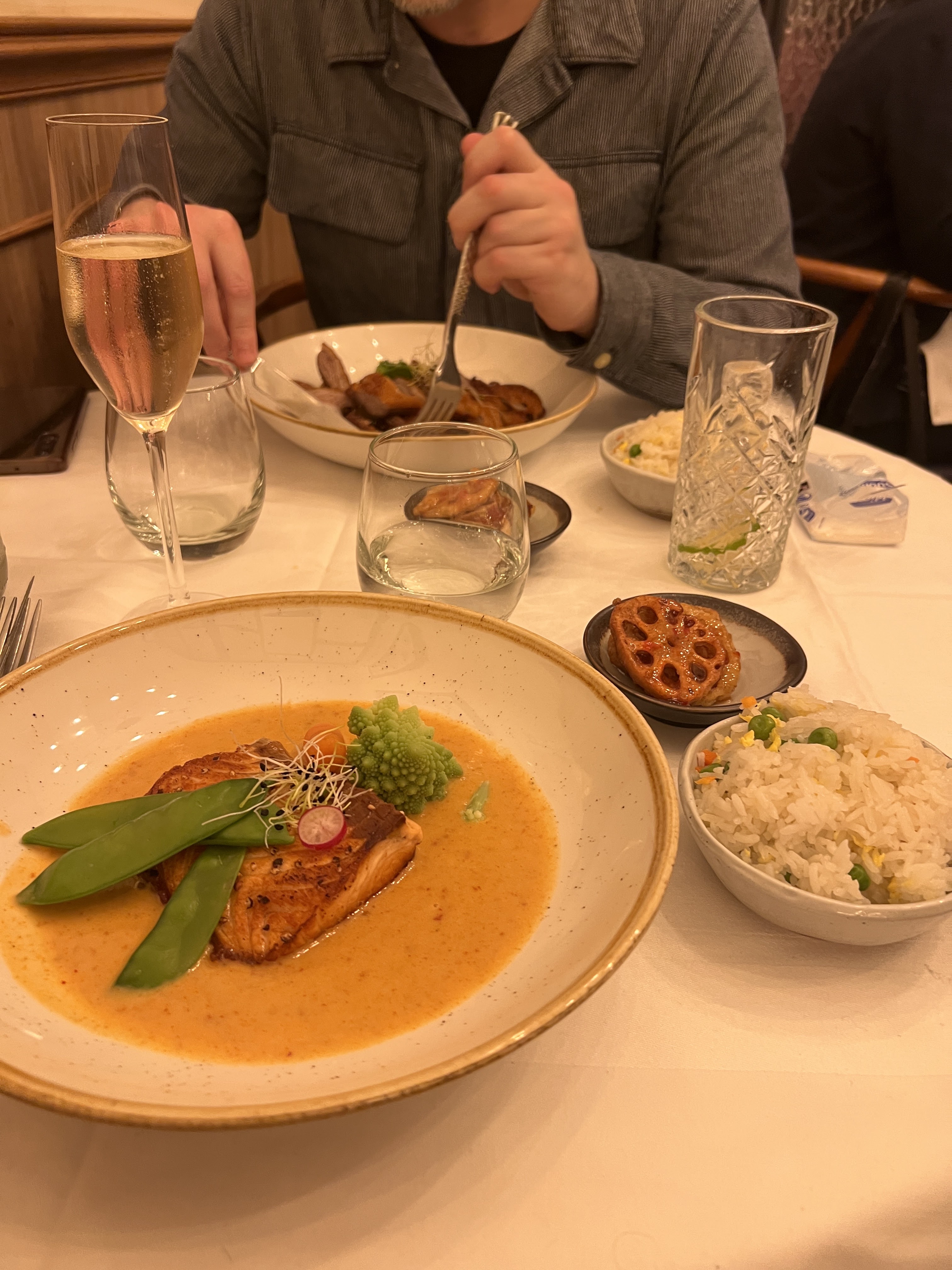 Nous nous sommes régalés avec le canard à la pékinoise en 3 services très bon et copieux pour deux personnes le prix est justifié, salle un peu bruyante en début de service mais plus calme au deuxième service du soir, portions très généreuse à la carte et association de goût Asie/ France très intéressante