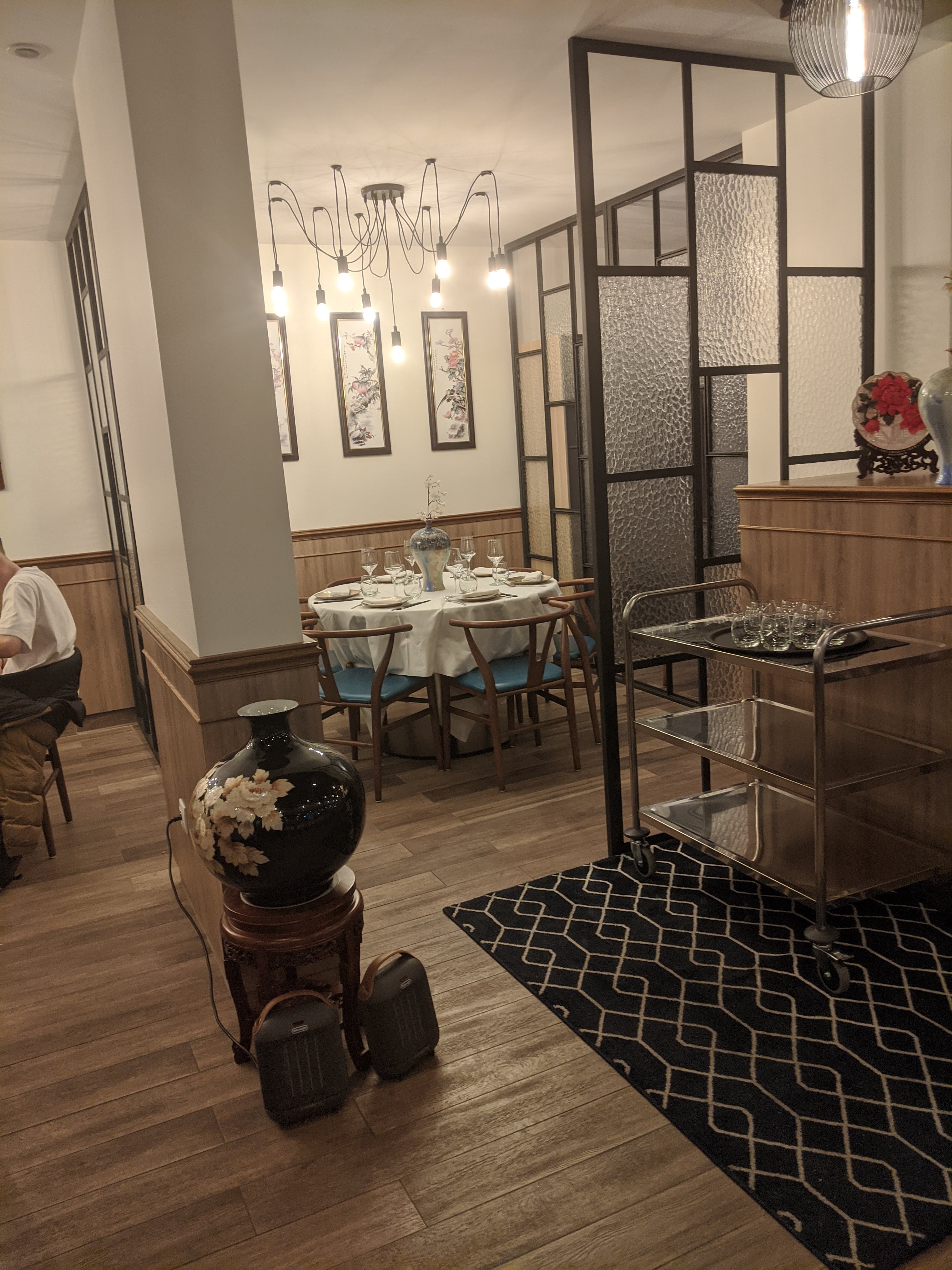 Restaurant, grand propre. De la place entre les tables. Des espaces pour les groupes. Le canard laqué à partager à faire. Etoile en moins car pas de porte manteau et les chaises arrondi ne facilitent pas la pose de notre blouson. Petit bémol bis, pas de gâteau chinois à la fin du repas.