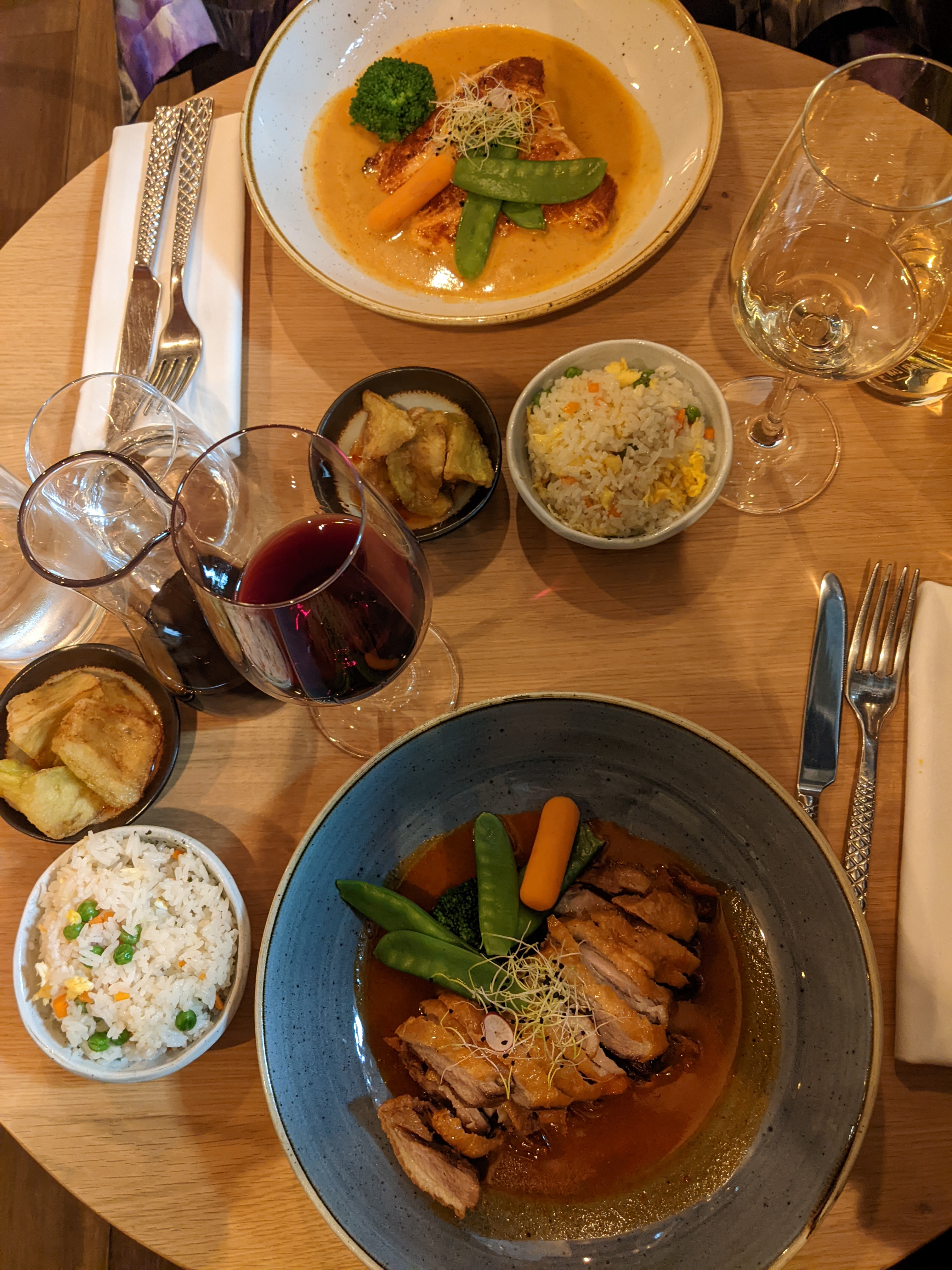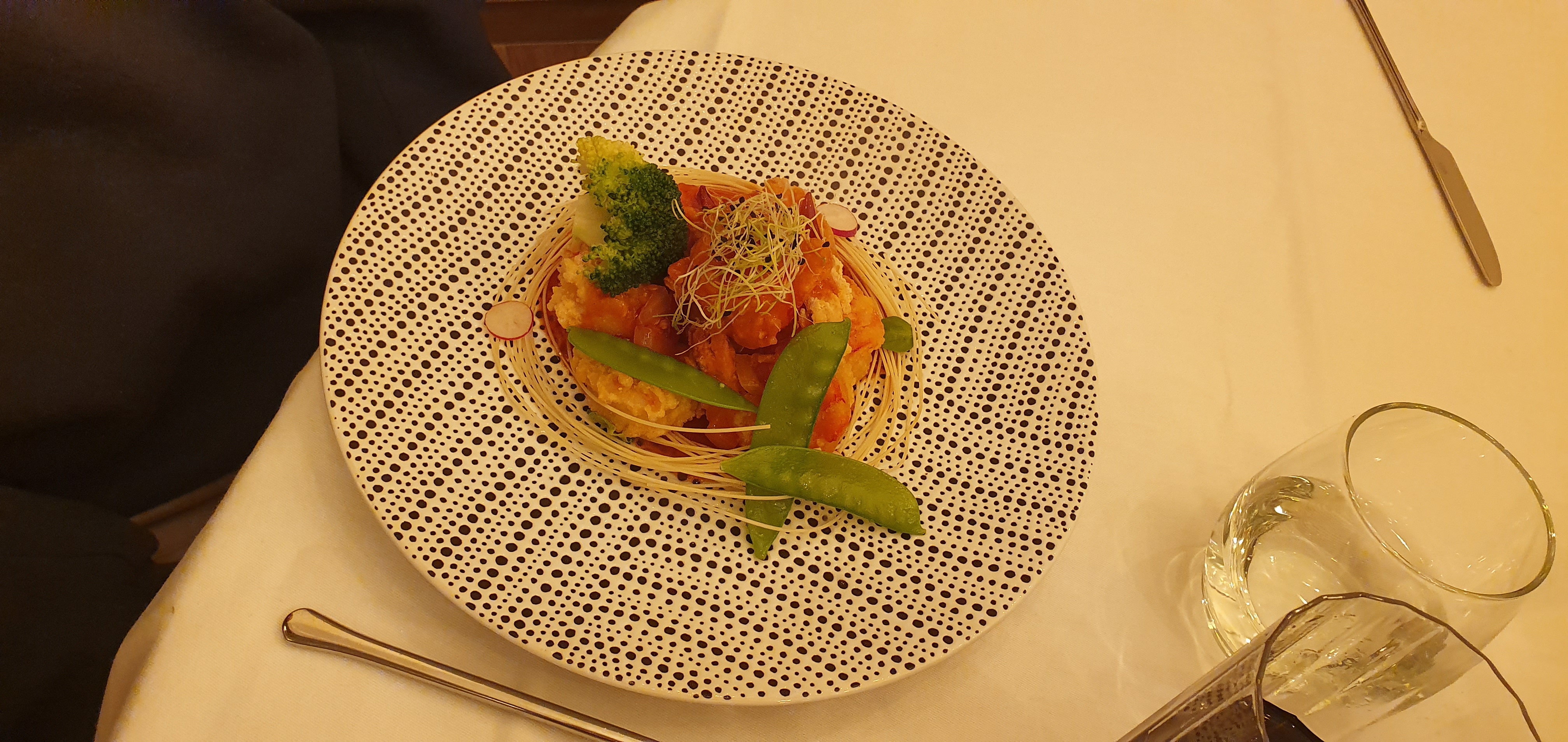 Très jolie cadre, la cuisine était très bonne , j'ai pris les raviolis de gambas à la soupe de courge c'était délicieux et en plat le canard façon pékinoise, la sauce du canard était une tuerie ! Un peu moins fan de l'accompagnement de petit légumes croquants froids cependant. En ce qui concerne les quantités je ne mange pas énormément et donc j'étais bien repu donc pas de dessert pour moi.