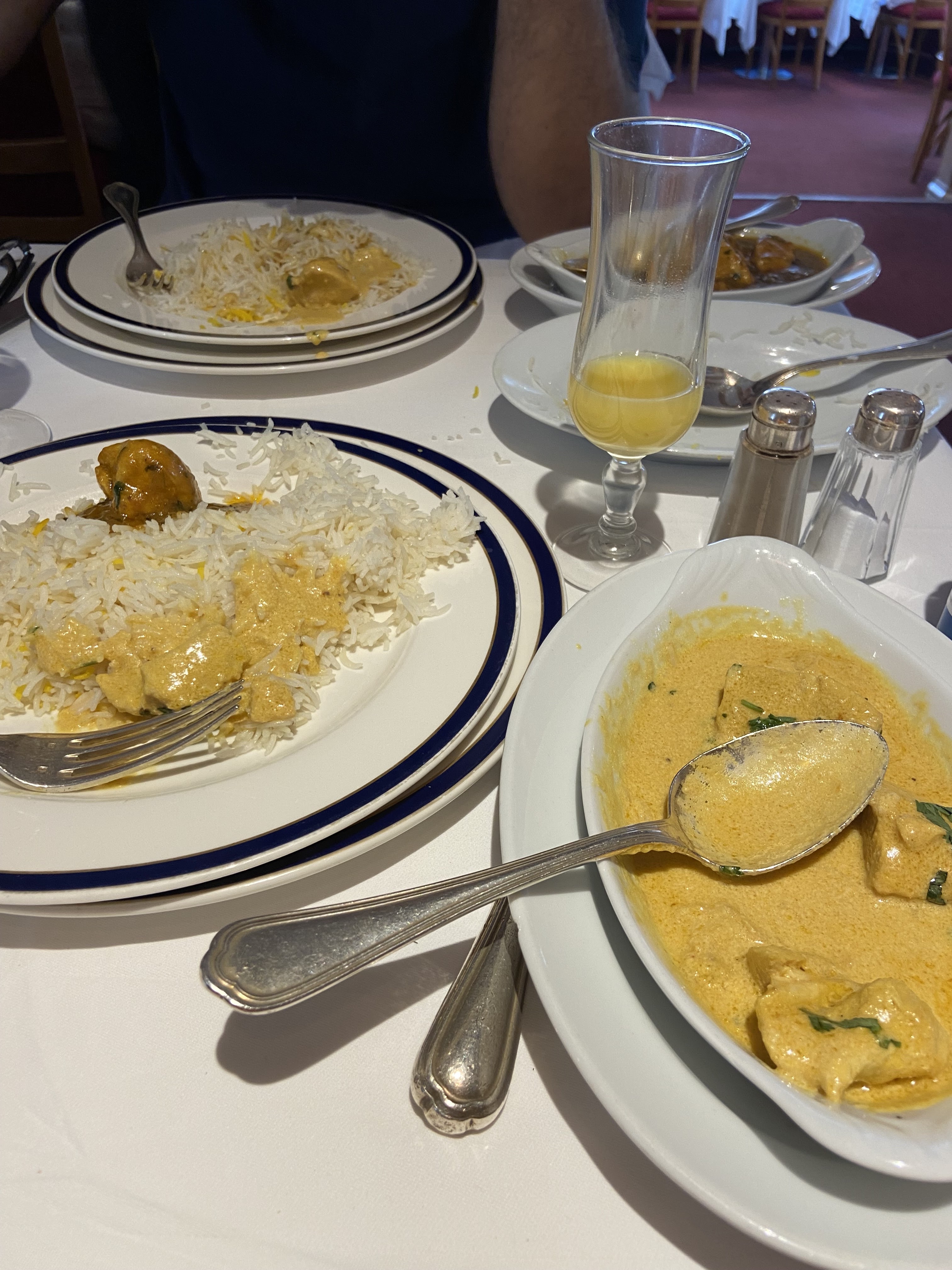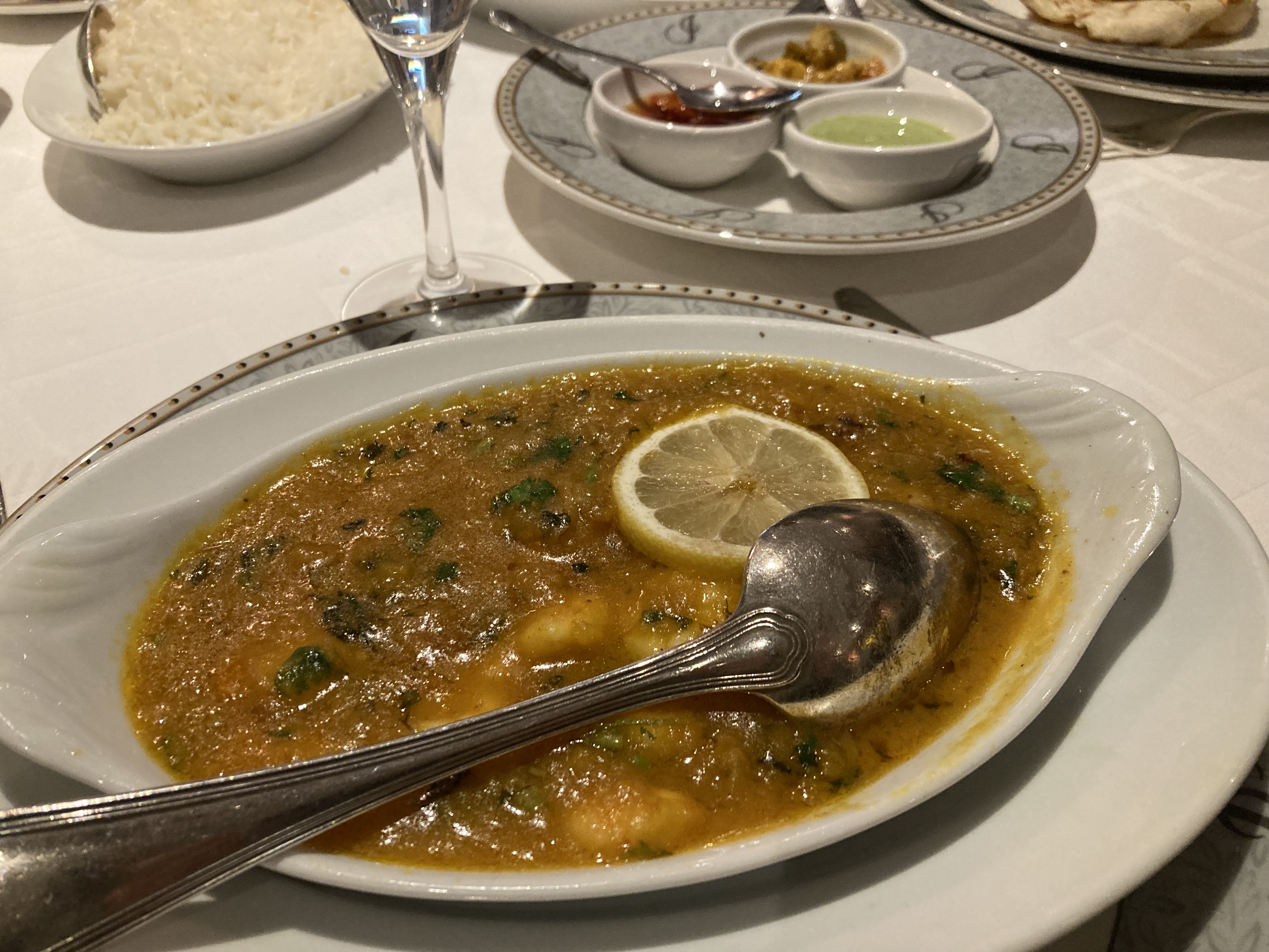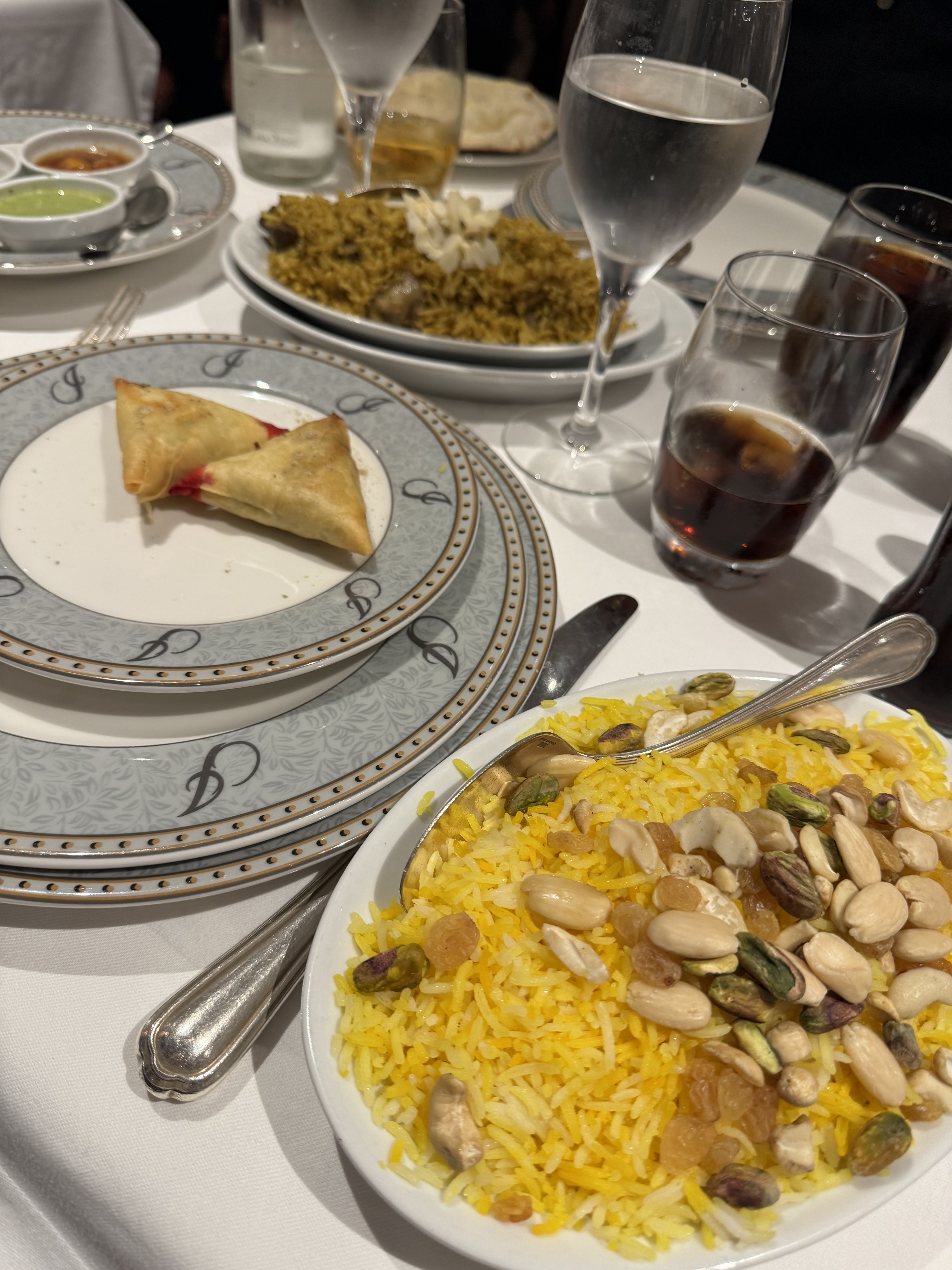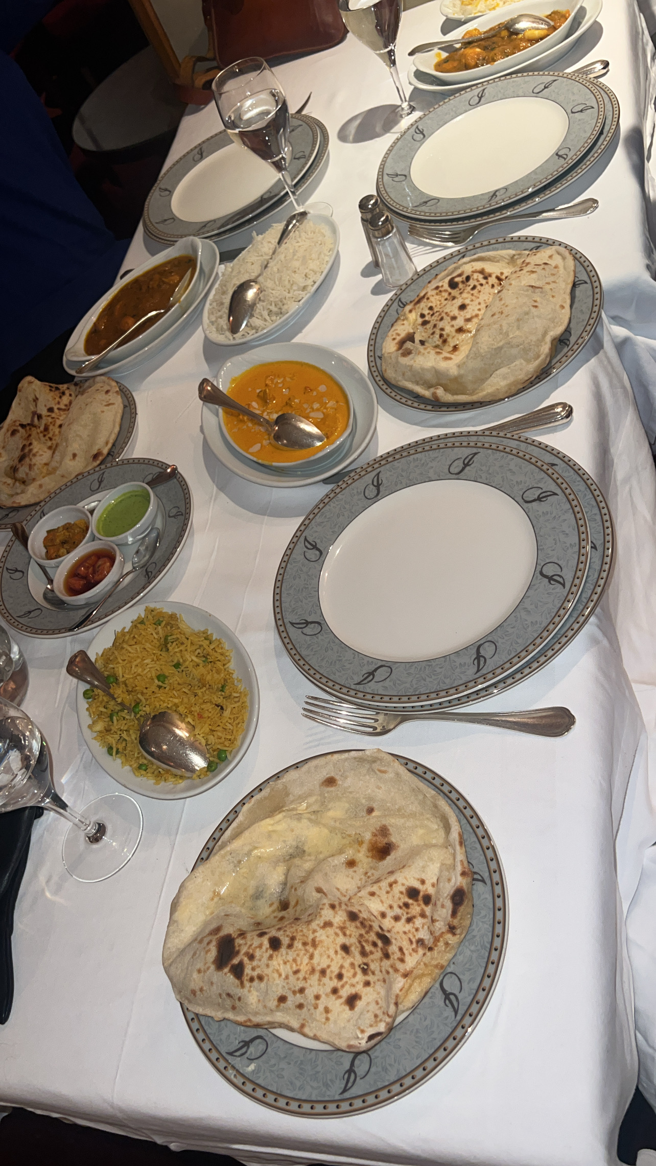 Ambiance pompeuse de ouf, ça ne m'étonne pas vu le quartier, mais service plutôt moyen. Le staff est sympatique mais a zappé quelques items ici et là - j'ai pas compris le rating de guedin que j'avais trouvé sur TripAdvisor, on est loin du 5* service que j'attendais. Un 4 c'est déjà bien payé. Prix corrects et repas intéressants mais sans sortir du lot non plus. J'ai pris un chicken briani, 4* quoi, pas une dinguerie. Note correcte à 81€ pour trois, on s'en est bien sortis.