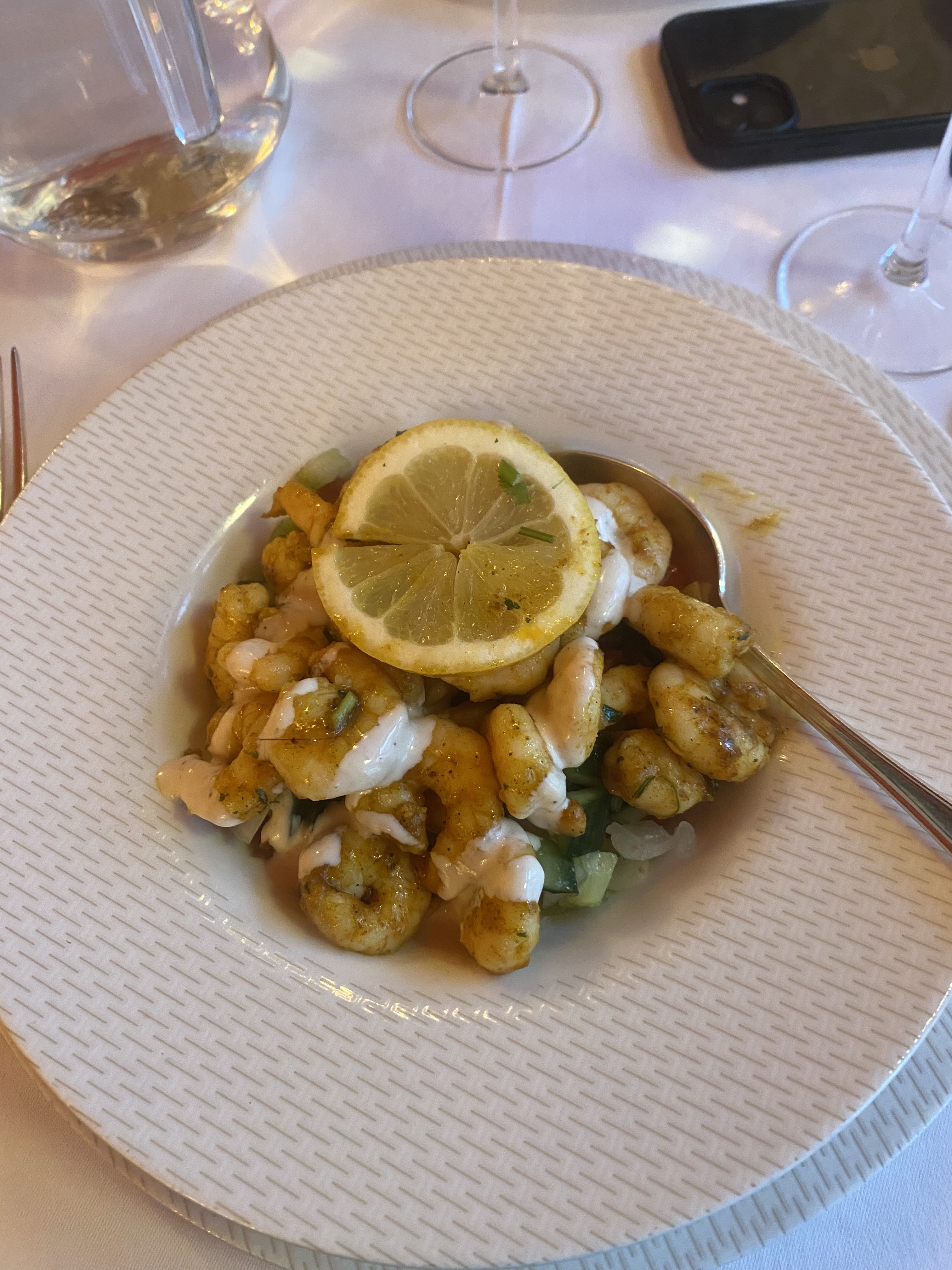 Un très beau restaurant nous ayant offert une excellente expérience. Le personnel est très accueillant et attentionné : en effet deux verres de rosé nous ont été offerts ainsi qu'un digestif en fin de repas. Les plats sont pleins de saveurs et de couleurs, ce qui les rend aussi agréable à manger qu'a regarder. Comme dit précemment le restaurant est très beau et très classe, avec des couleurs et une luminosité très esthétiques. Nous reviendrons sans hésiter !