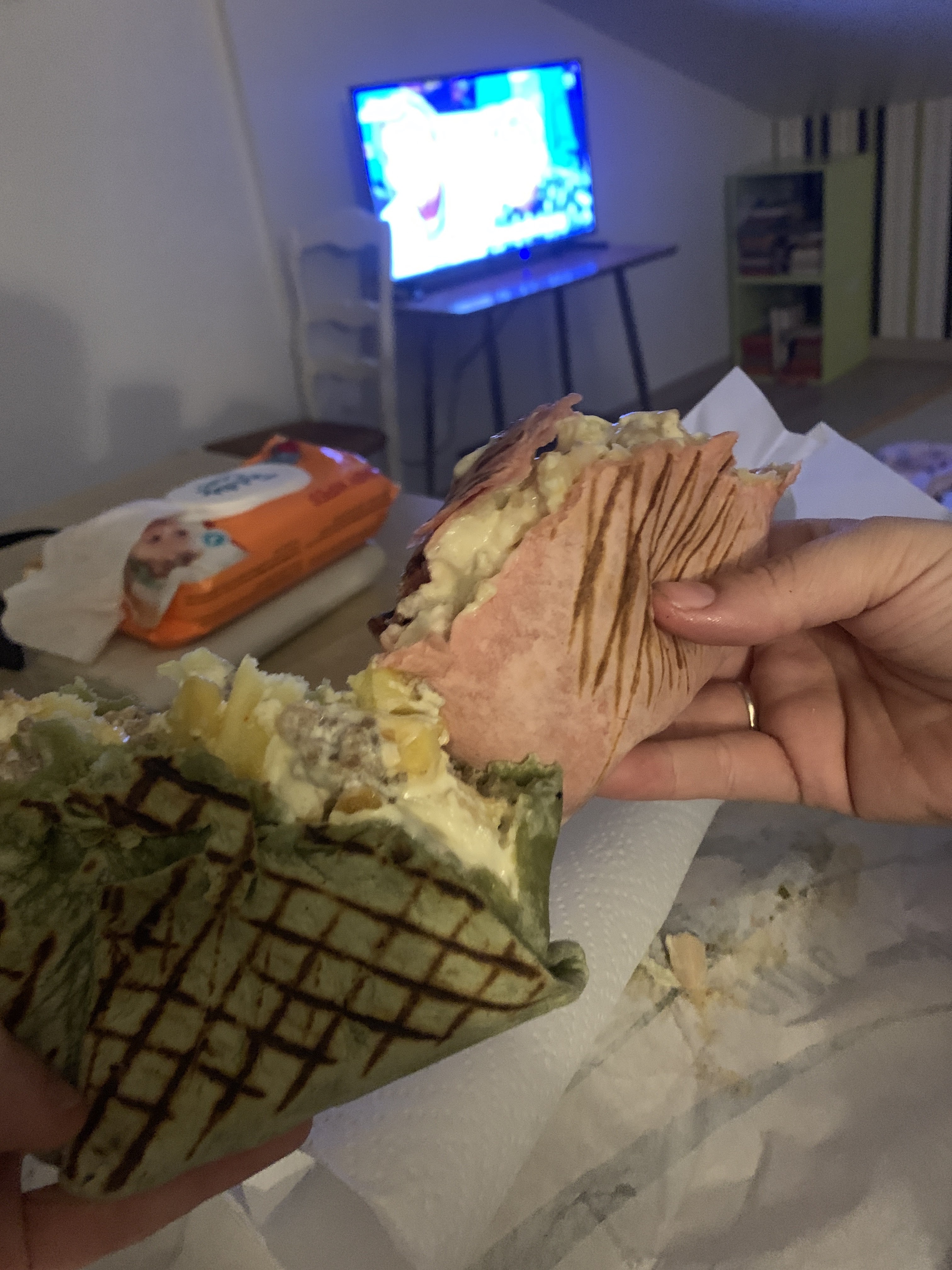 Admirez juste la quantité d’huile, s’agirait de bien fermer le tacos. Le goût est là mais ça donne mal au ventre.