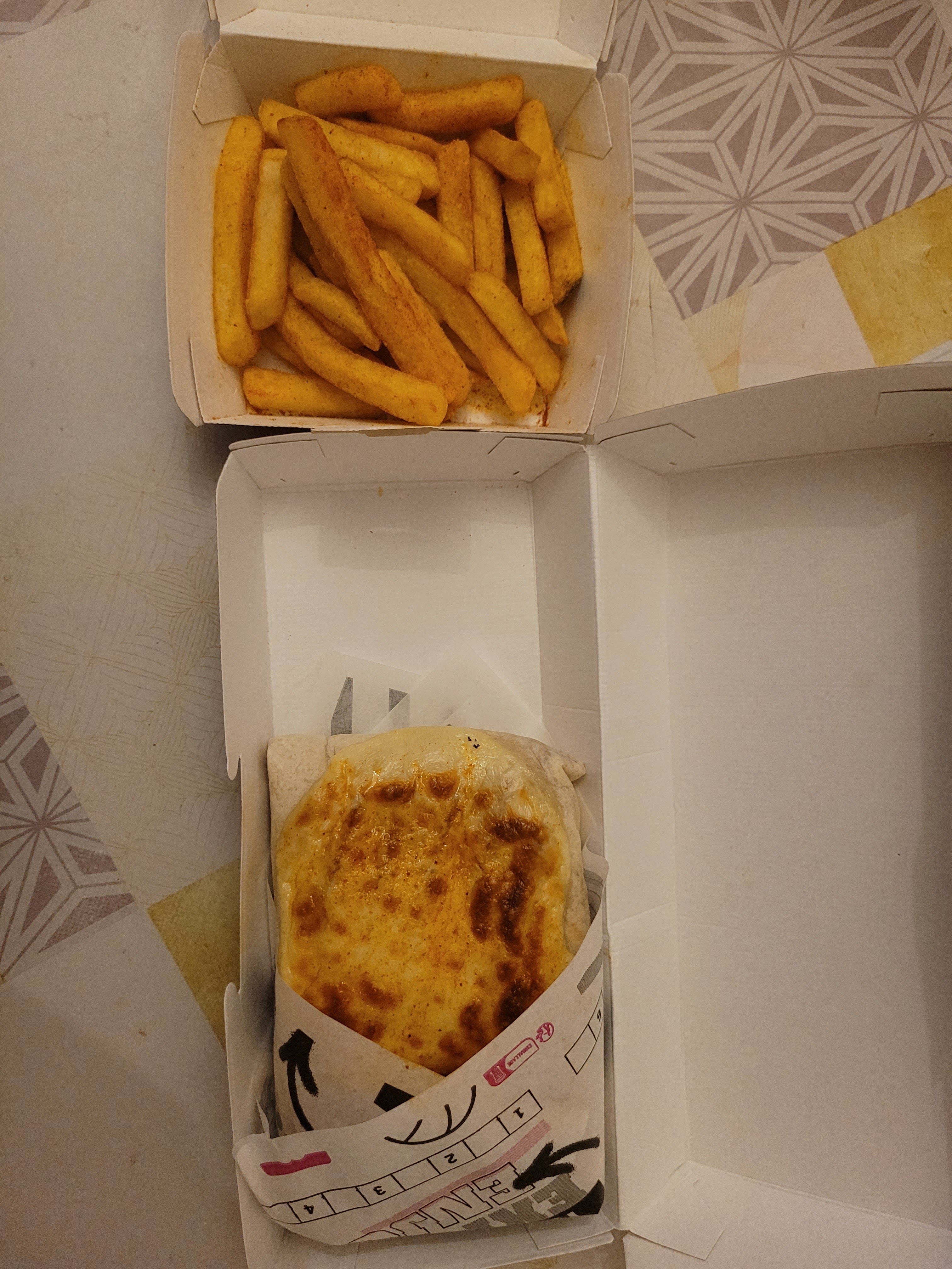 Nous avons passer commande à 21h30 Et nous l’avons reçu 50 min après Notre commande devait arriver à 21h55 mais ça augmentais au fur et à mesure jusqu’à 22h20 les frites était donc froides, limite à se demander si elle sont cuite à l’intérieur, le tacos est par endroits sec et je cherche toujours le formage raclette que j’avais demander à l’intérieur mais bon passons, pareil pour la sauce barbecue j’ai pu avoir la sauce qu’à la fin du tacos. Dans le deuxième tacos il y avais également de la sauce barbecue à la place de la sauce biggy, les oignons frits (x2) qu’on avais demander était finalement un ou deux bouts d’oignon La sauce fromagère qui était à 1€ en plus avec les frites vaux plus 50 centimes voir 30 vu la taille du petit pot Je pense que c’est la première et dernière fois qu’on commandera la bas