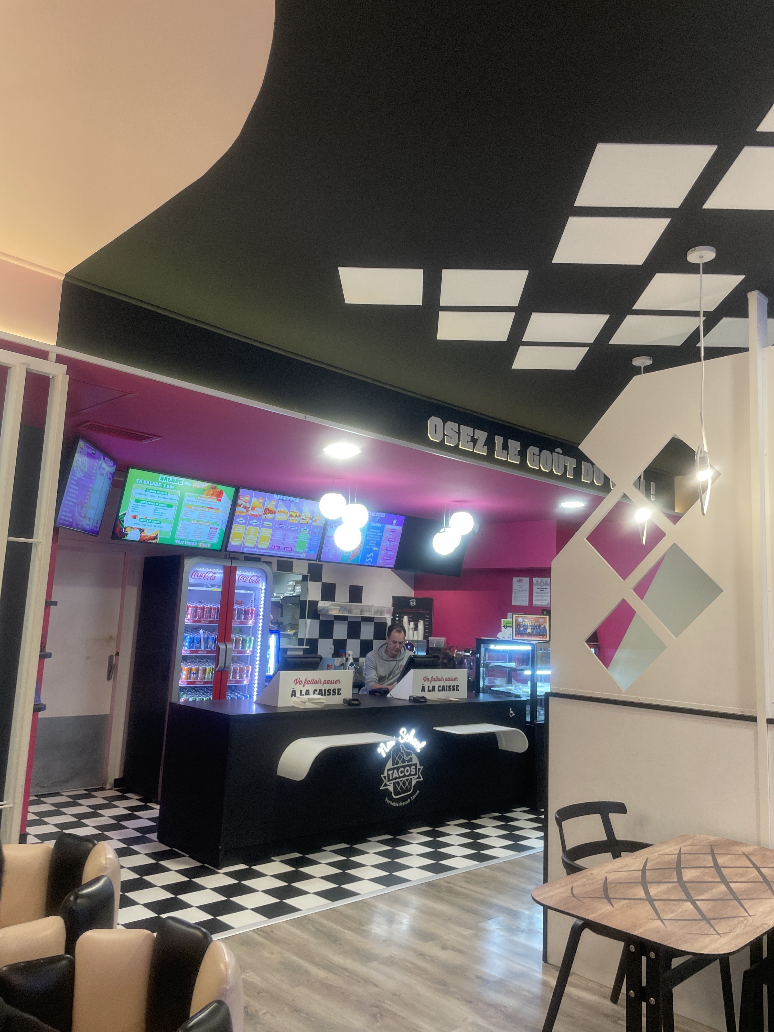 Effectivement, assez d'accord avec les commentaires précédents. 9.50€ un tacos double avec supplément 1€ pour la viande de kebab sans menu boisson (les frites à part sont en complément du menu), donc juste le tacos. C'est excessif. Le goût : pas forcément ouf, sans définir quel ingrédient, le tacos était trop salé et pas très savoureux. La sauce fromagere est en bonne quantité mais pas exceptionnelle. A ce prix je préfère privilégier Tacos gratiné au centre, petit commerce indé, que New school tacos qui ne propose rien de mieux que la concurrence mise à part son cadre moderne. En conculsion c'est joli c'est propre mais le goût et surtout le prix n'est pas a la hauteur de la concurrence.