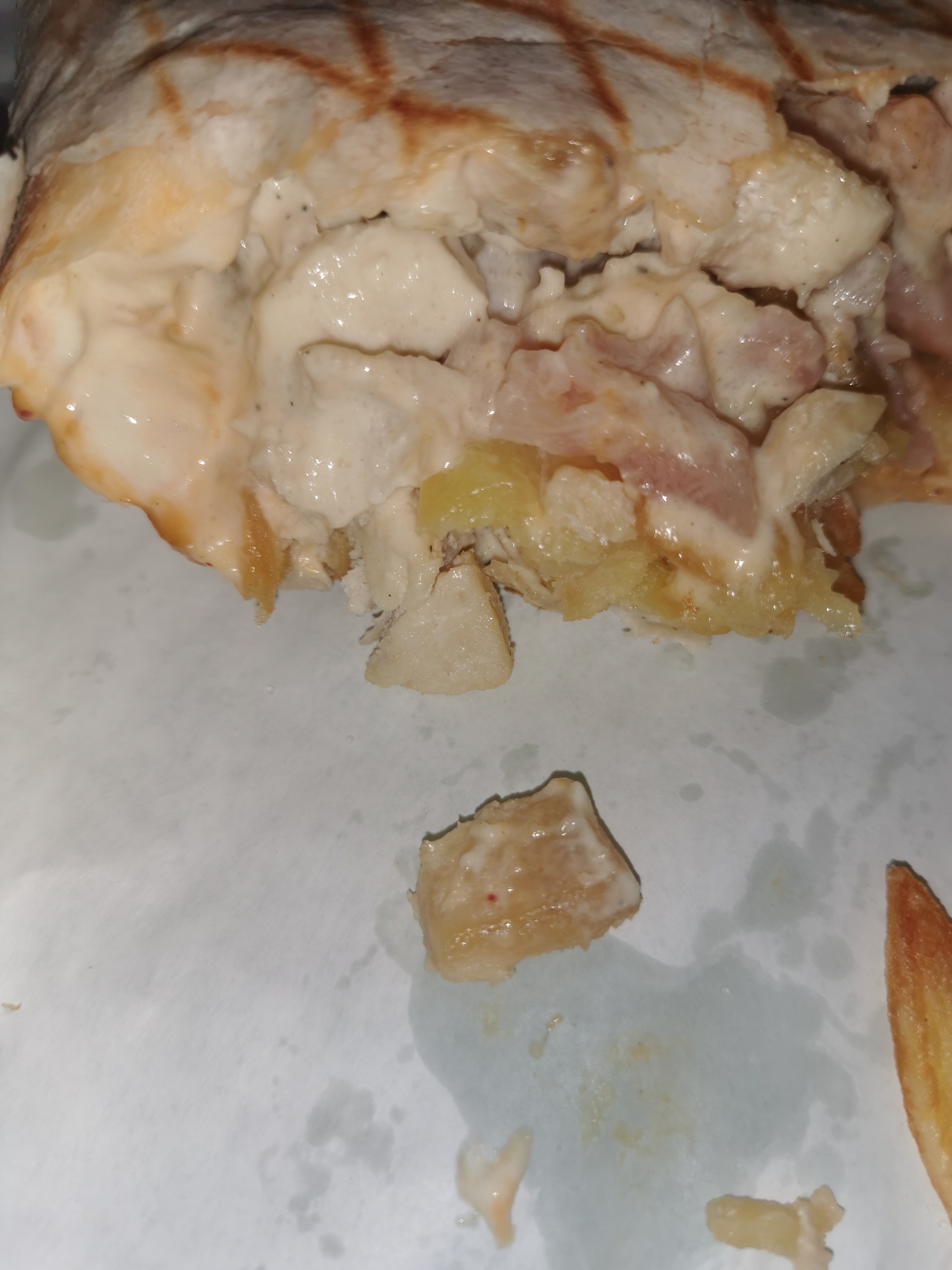 Tacos gratiné cordon bleu. Excellent ! Franchement je me suis régalée. La mozza gratinée dessus est un vrai plus qui pèse dans la balance ! Si je devais vraiment chercher la petite bête je dirais qu'on ne sens ps suffisamment la sauce fromagère mais ce serait vraiment pour chipoter ! Je recommande totalement.