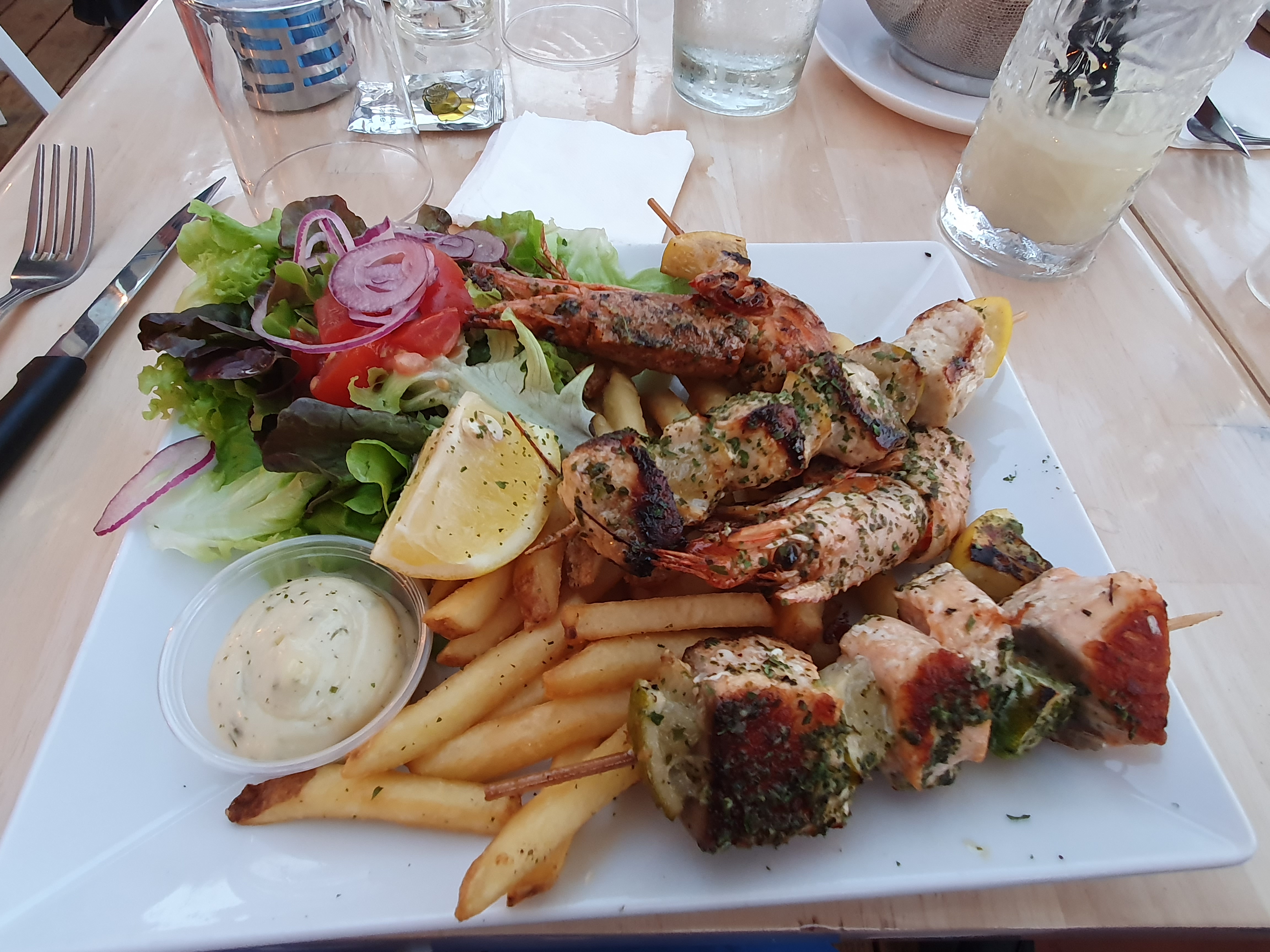 Nous avons mangé 2 salades (de la mer et végétarienne) ma fille et moi : très belles et fraîches, bien garnies et pour pas cher alors que le restaurant se trouve en bord de plage. Service parfait. Nous reviendrons pour le poisson 😉