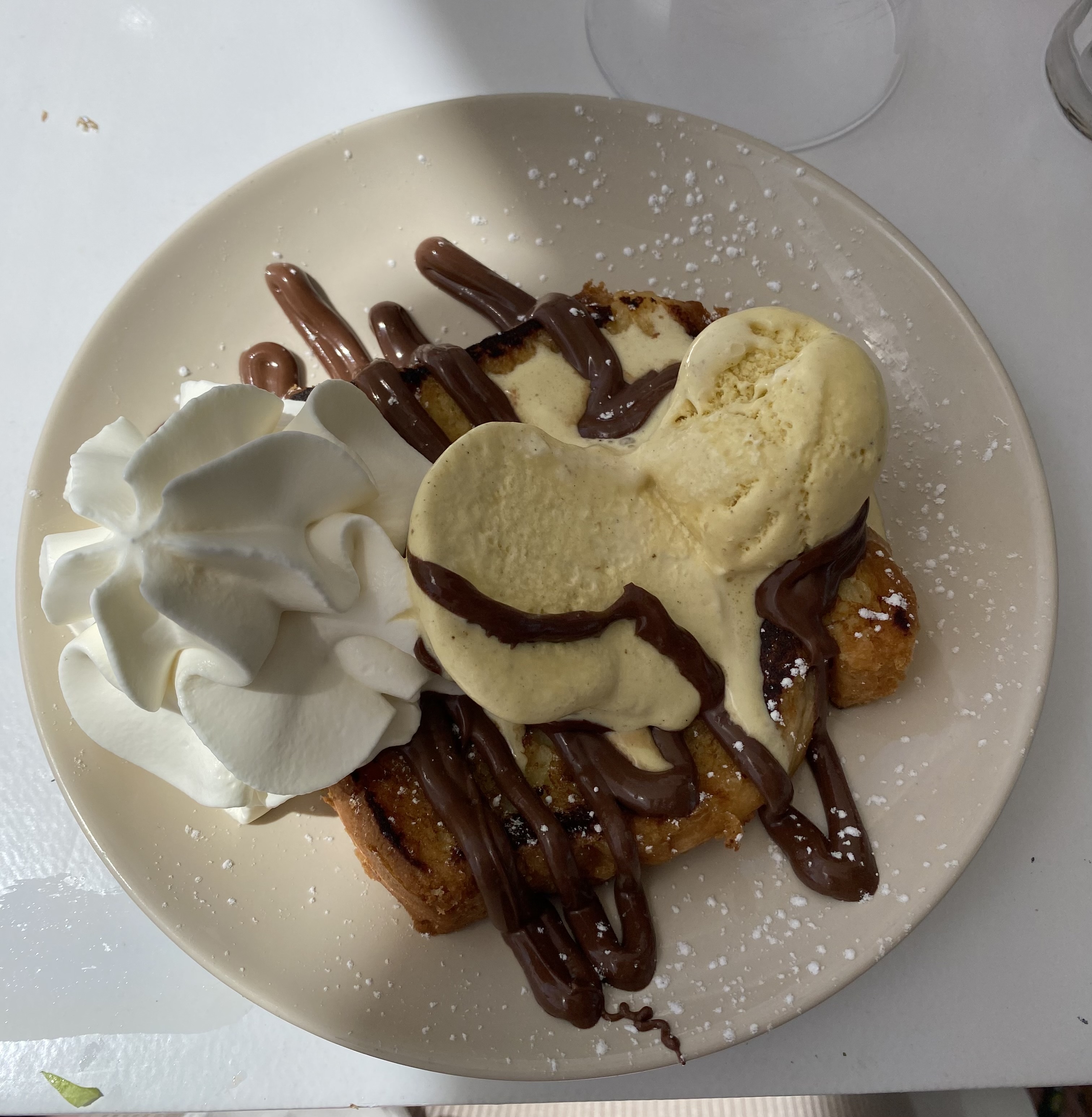 Après midi ensoleillée en terrasse, personnel sympa et souriant et goûter délicieux au choix glace, crêpe, gaufre ou brioche nature ou caramel beurre salé par exemple particulièrement bon 😀