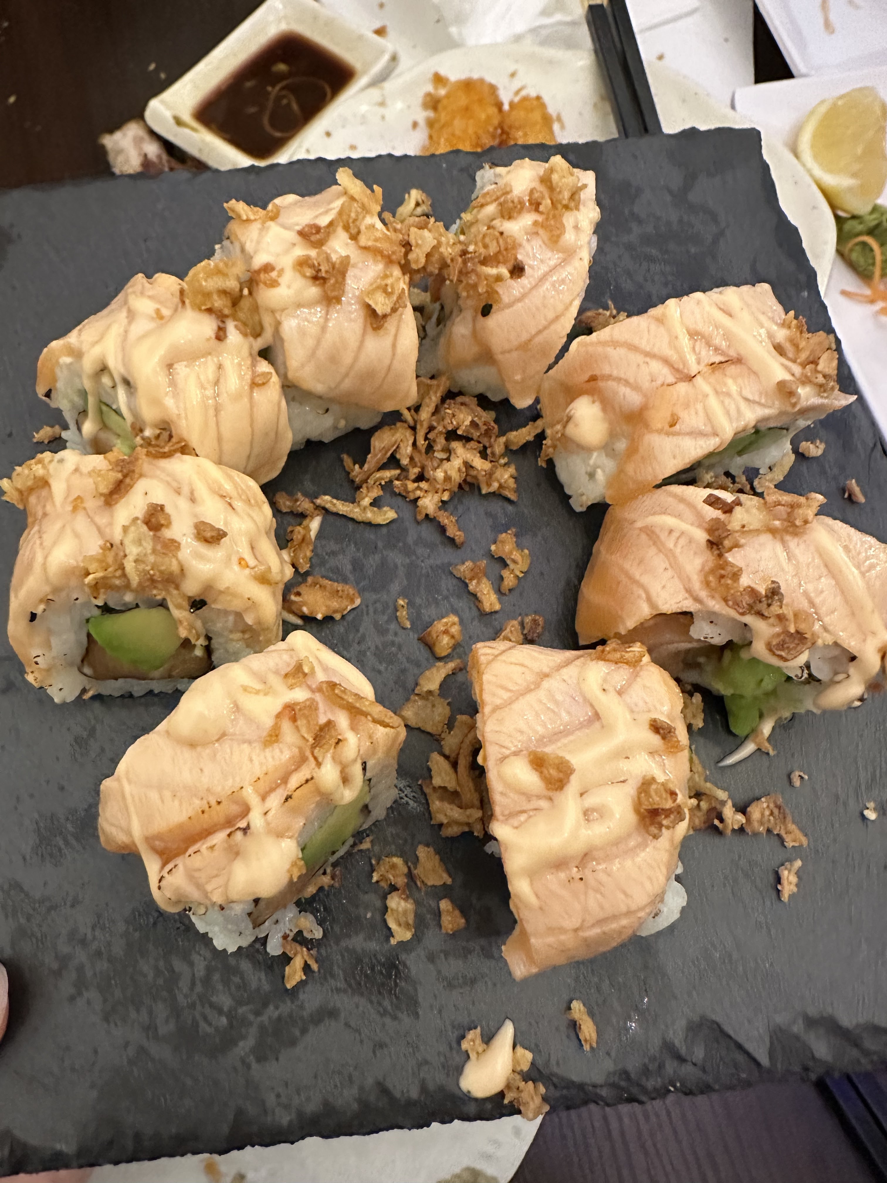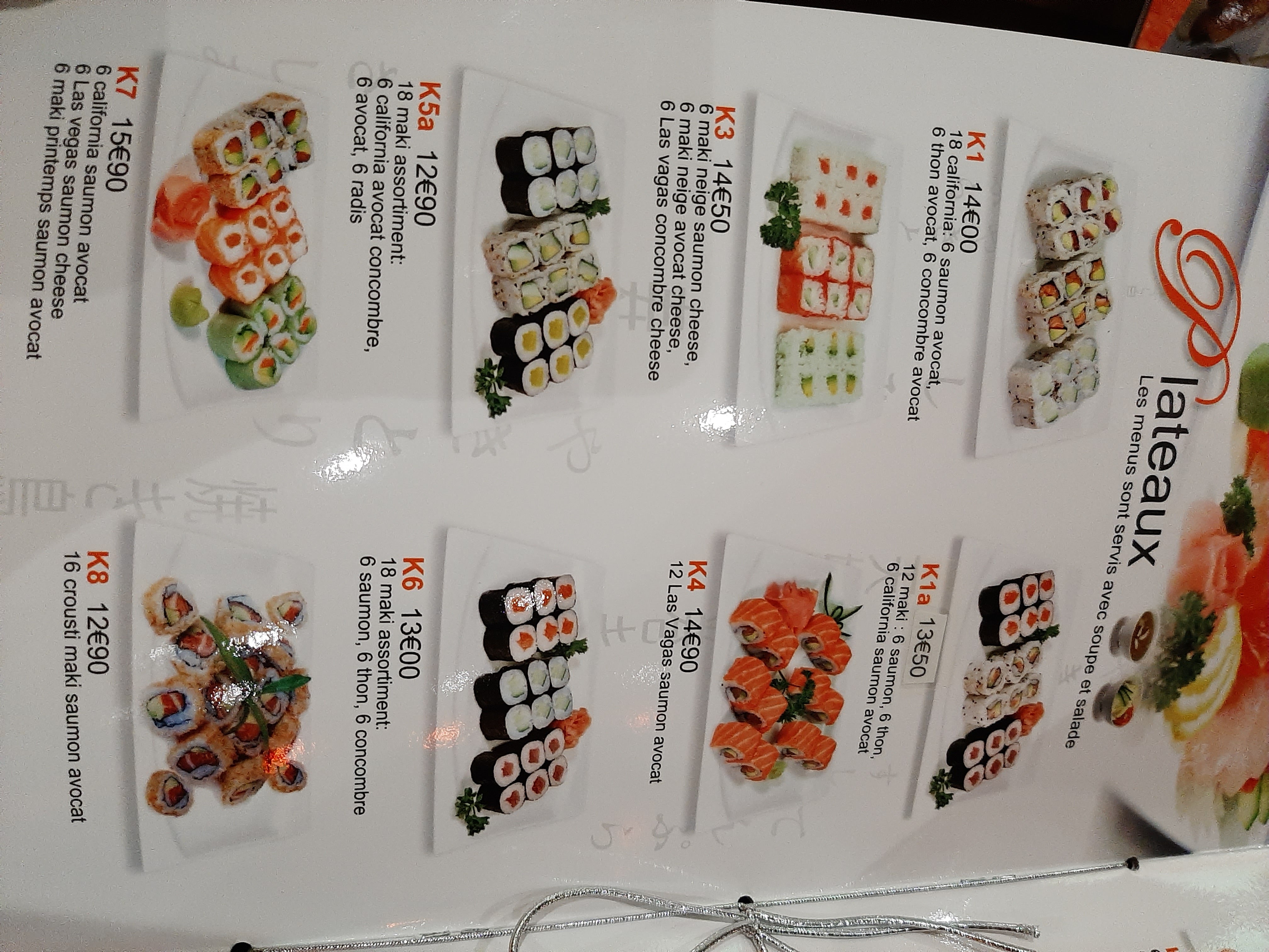 Accueil: Arrivé à 19h30 un samedi Services: - Temps d'attente: Arrivée sur place pas d'attente pour être pris en charge et placé à une table - Fréquentation: Établissement peux fréquenté Expérience: - Présentation: Les plats étais bien présenté simplement, - Cuisine: Le brochettes de boeuf au fromage était préparé comme il faut, fromage bien fondant - Services: Repas disponible rapidement dans les 10min après la commande, serveurs disponible pour toute commande pendant le repas Lieux: - État de la salle: Salle propre, une salle de taille très petite - Localisation: Établissement peux visible dans un recoin à proximité de la pharmacie - Accessibilité: Stationnement difficile - Ambiance: Établissement calme Tarif: Raisonnables Recommandations: maki printemps saumon avocat, sashimis saumon, california saumon avocat Pièce jointe: - Plat: (H5 personnalisé) Sashimi saumon et thon, california saumon avocat, soupe, salade,riz (PR1) Printemps Roll saumon avocat